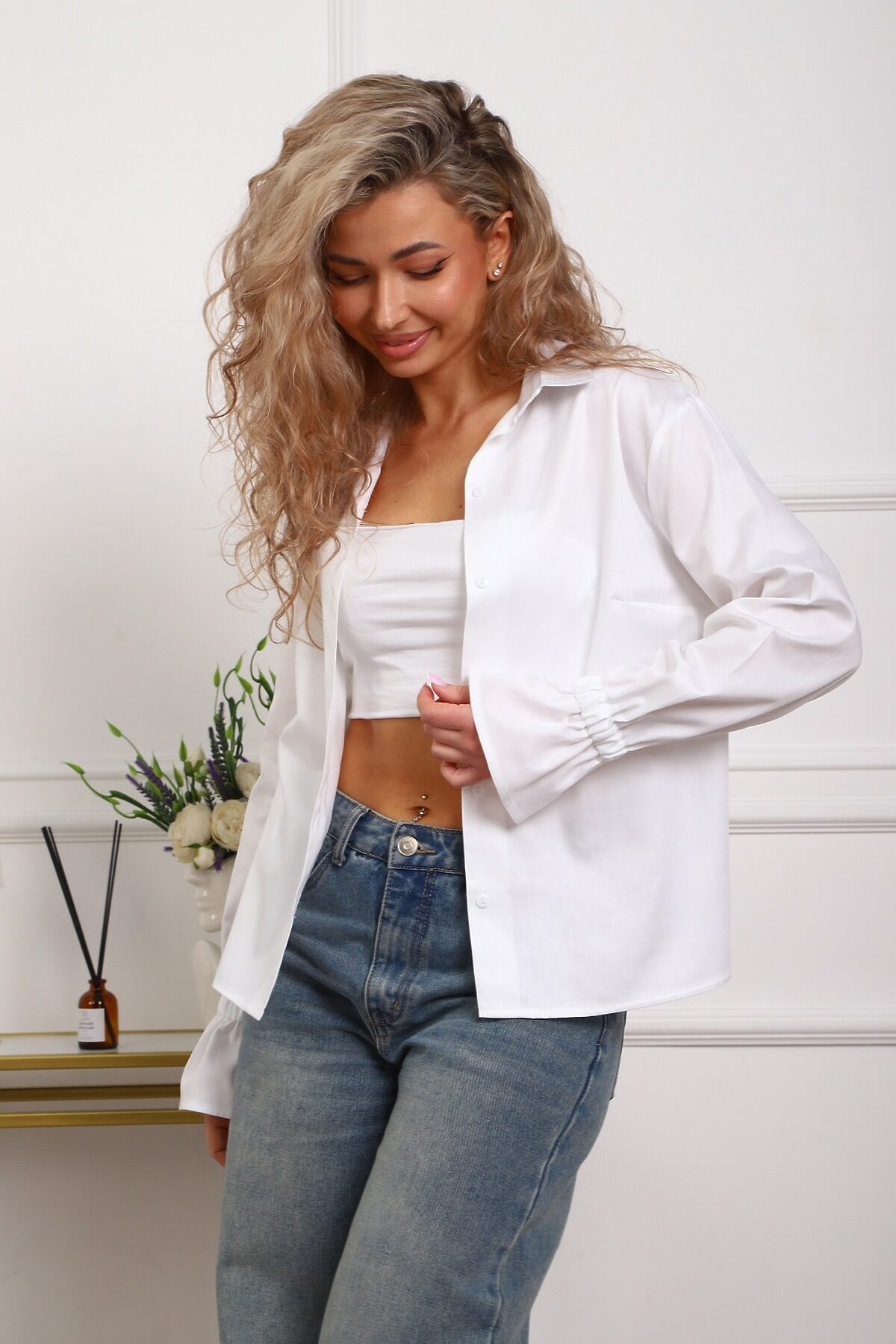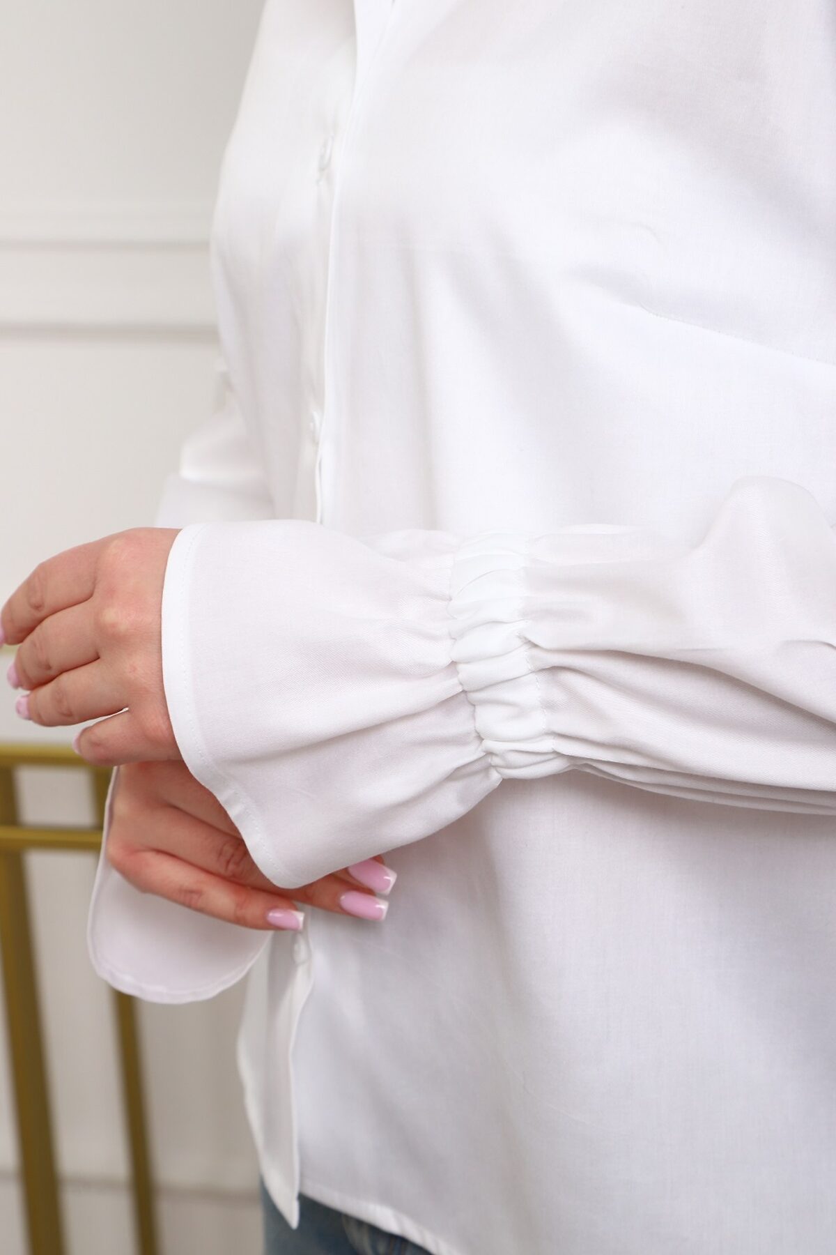 Женственная и стильная рубашка в белом цвете: универсальный выбор для работы, учёбы, отдыха. Комфорт 100% хлопка, мерсеризованный сатин с благородным умеренным блеском. Рукав-волан в оптимальной при сборке, резинка вшита закрытым способом, на руку не давит. Воротник-стойка без фиксации на пуговицу.