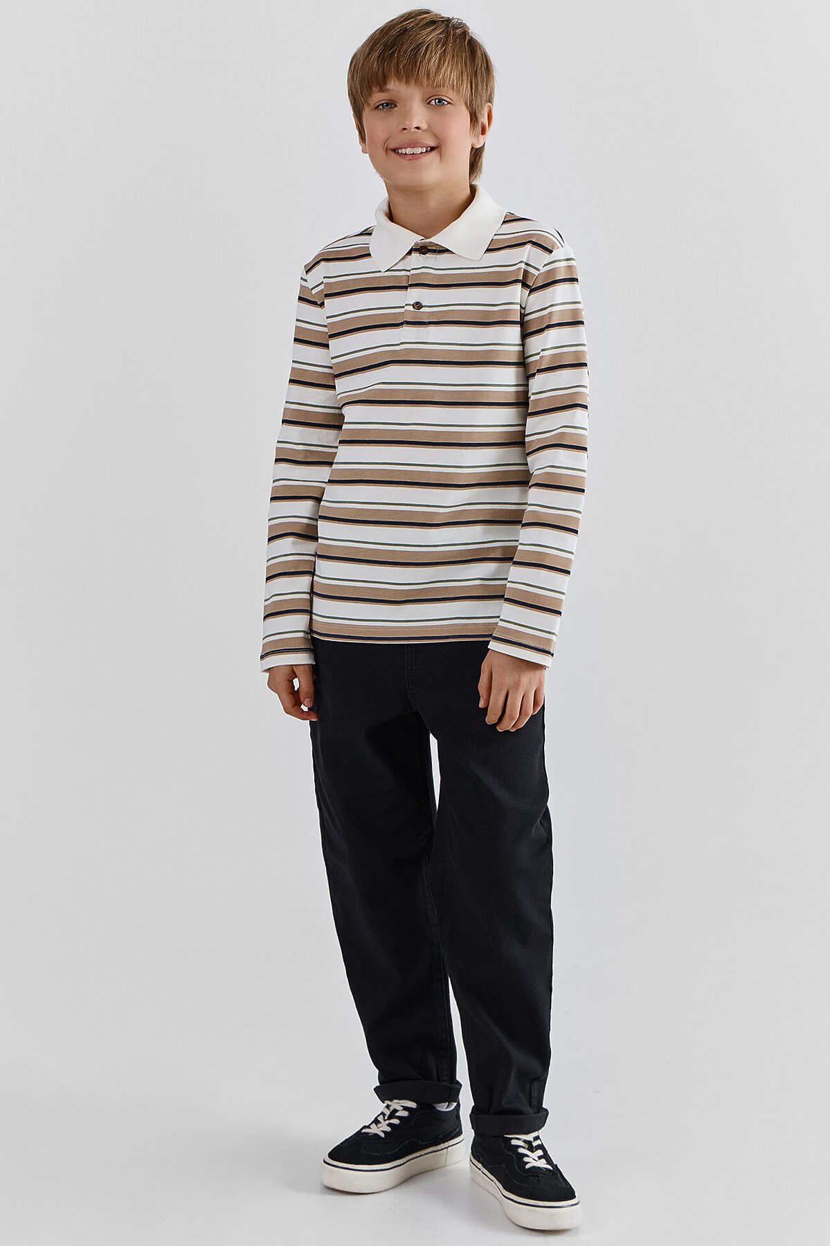 Поло для мальчиков прямого силуэта. Рукава втачные длинные. Плечо слегка спущено. Горловина округлый формы с рубашечным воротником из довяза DOV-16, DVC-85/001-0/5 . Шов обработки горловины - закрыт х/б тесьмой 10 мм 10TGY-O. По переду обработана застежка на петли и пуговицы d=10 mm.