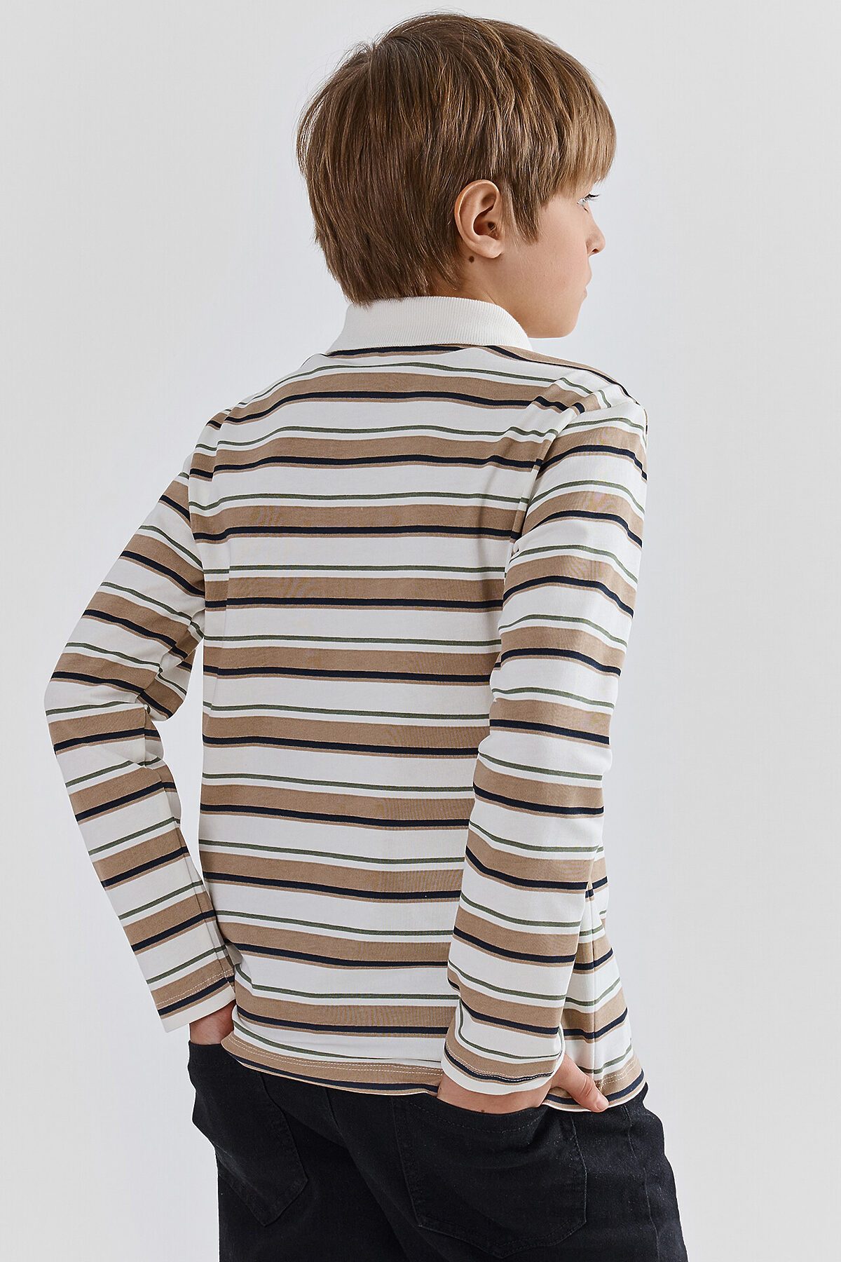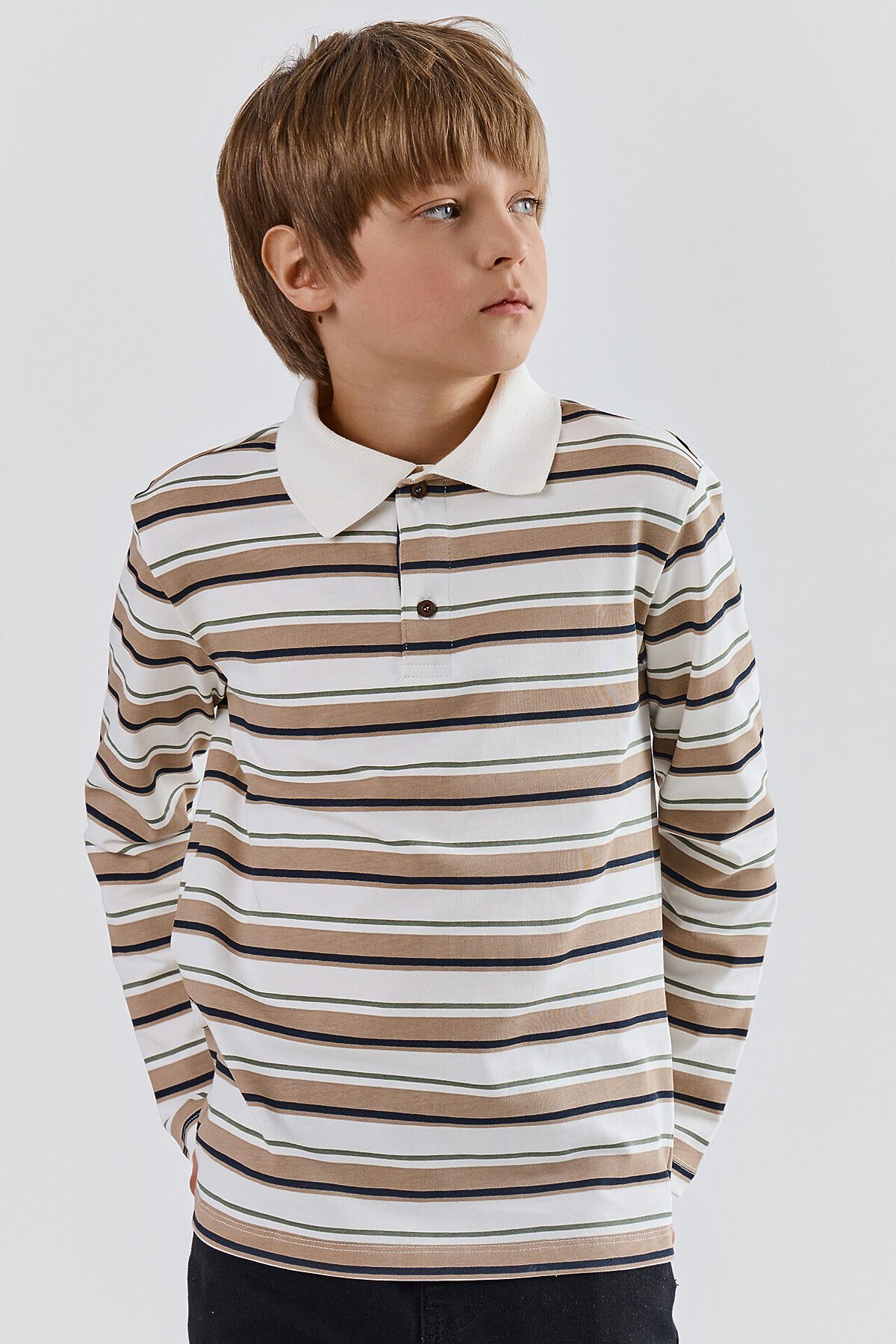 Поло для мальчиков прямого силуэта. Рукава втачные длинные. Плечо слегка спущено. Горловина округлый формы с рубашечным воротником из довяза DOV-16, DVC-85/001-0/5 . Шов обработки горловины - закрыт х/б тесьмой 10 мм 10TGY-O. По переду обработана застежка на петли и пуговицы d=10 mm.