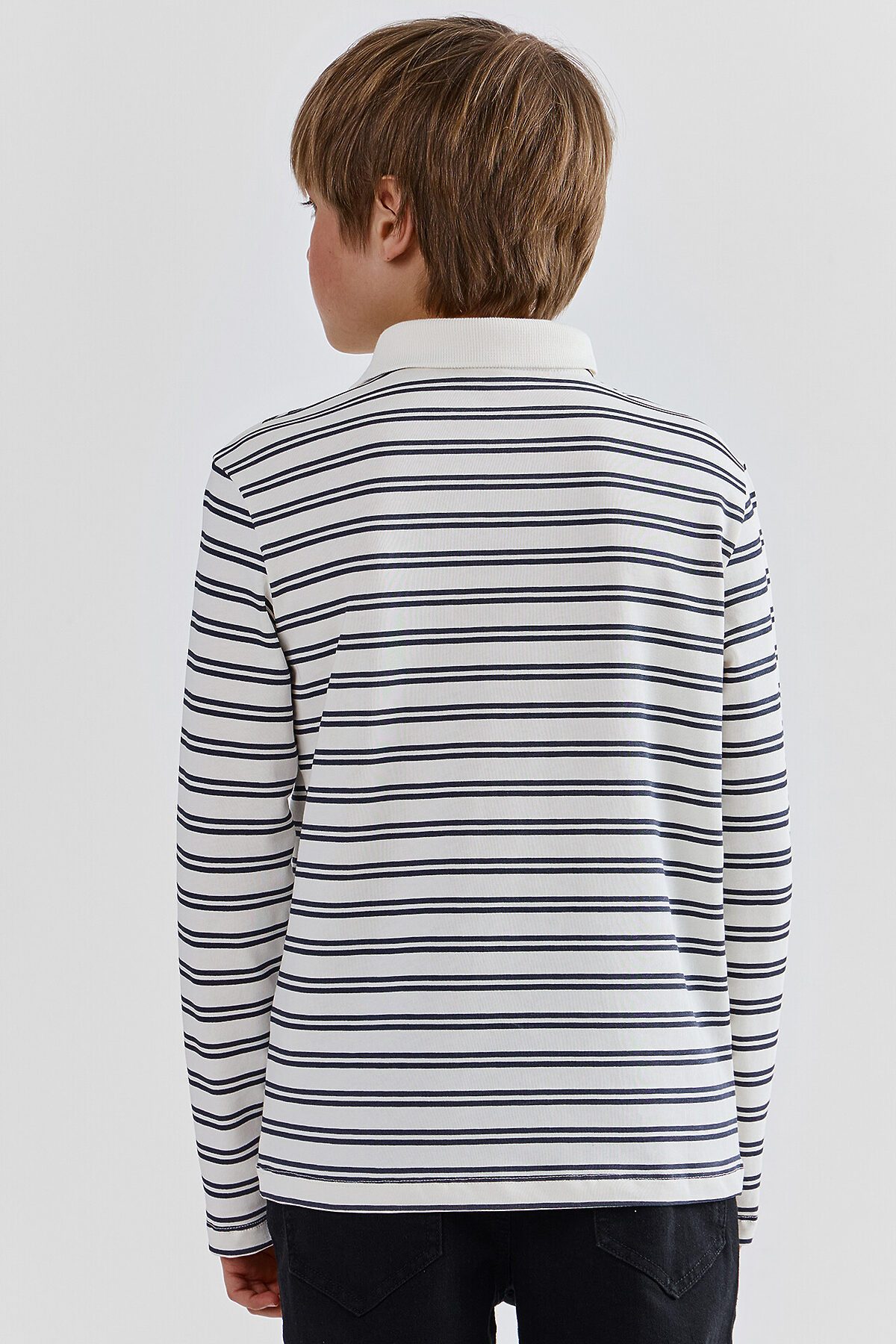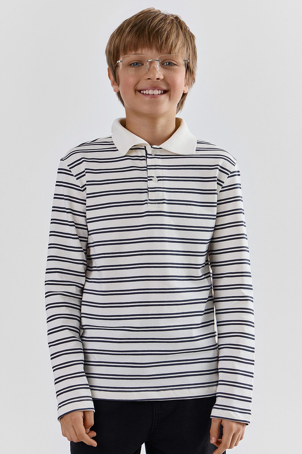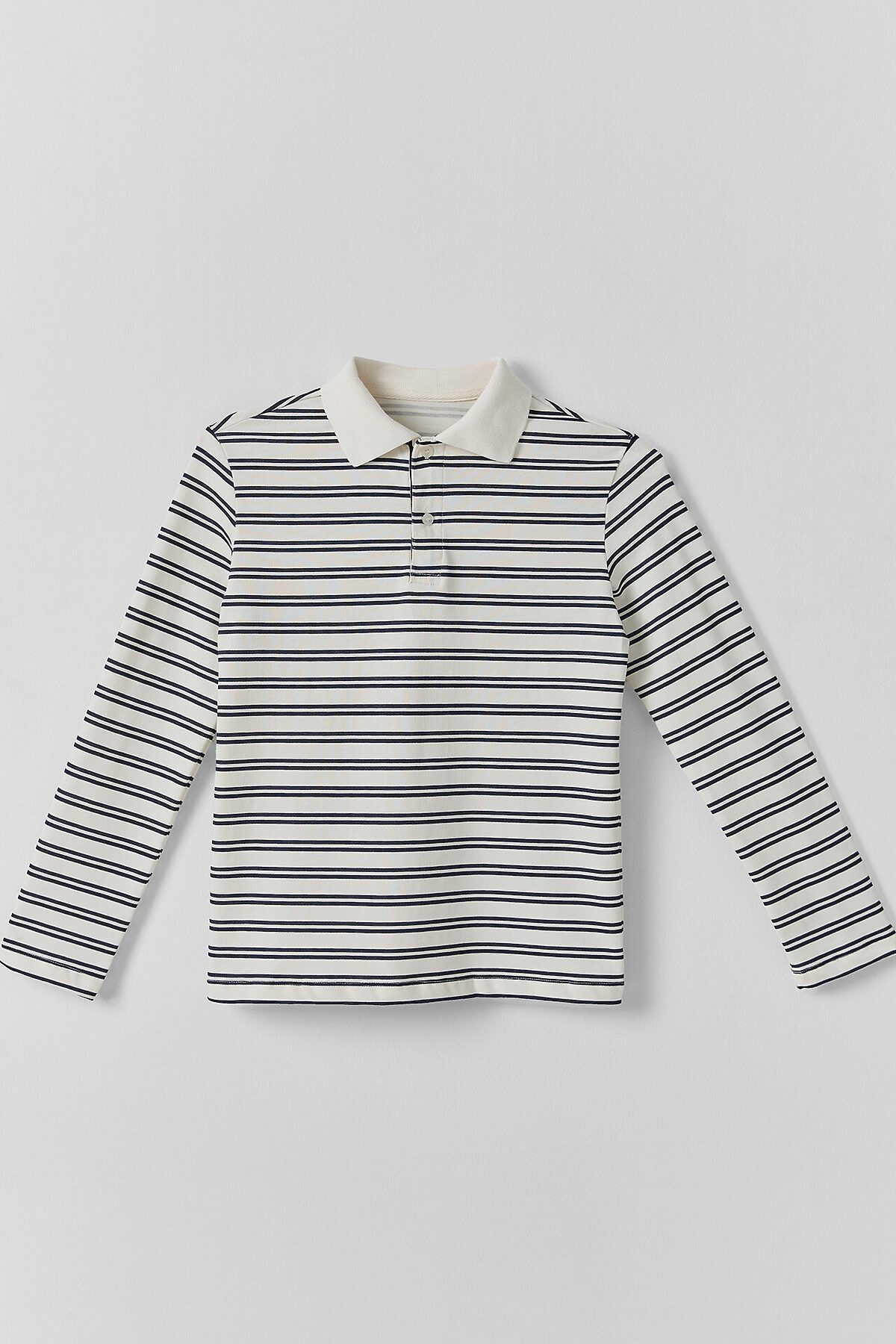 Поло для мальчиков прямого силуэта. Рукава втачные длинные. Плечо слегка спущено. Горловина округлый формы с рубашечным воротником из довяза DOV-16, DVC-85/001-0/5 . Шов обработки горловины - закрыт х/б тесьмой 10 мм 10TGY-O. По переду обработана застежка на петли и пуговицы d=10 mm.