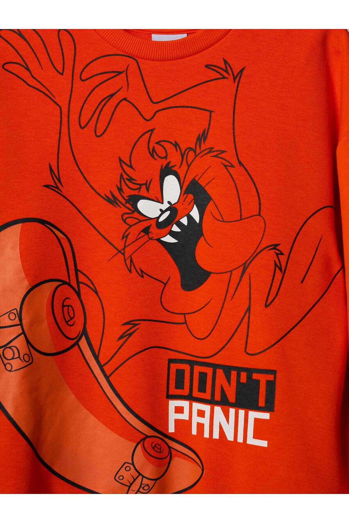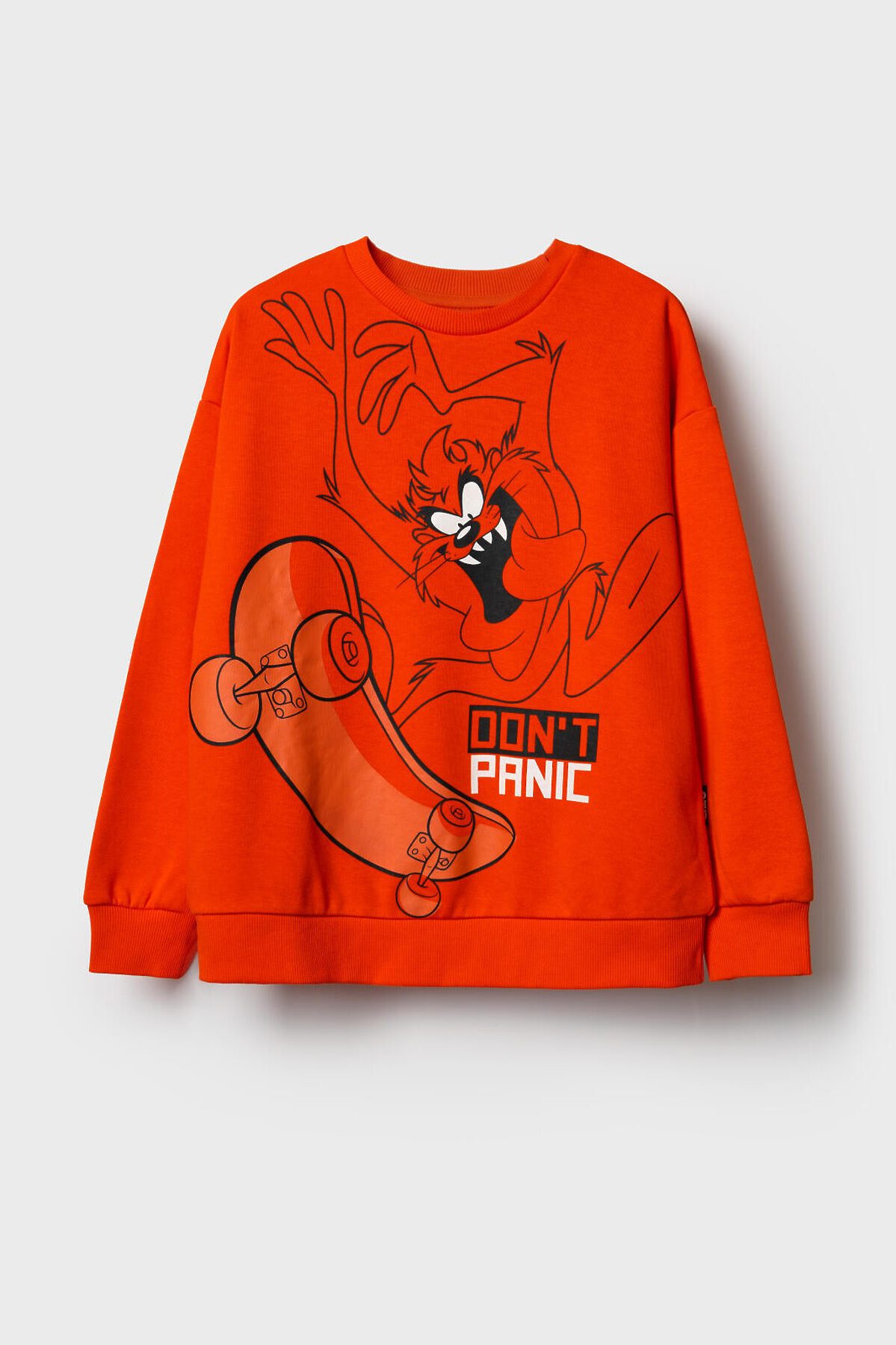 Оверсайз свитшот для мальчика подростка. Модель с круглым вырезом, длинными рукавами и манжетами. Выполнена из футера без начеса. Пояс и манжеты выполнены из эластичного риба, что обеспечивает хорошую посадку. Яркий принт с любимыми героями мультфильма Луни Тюнз.