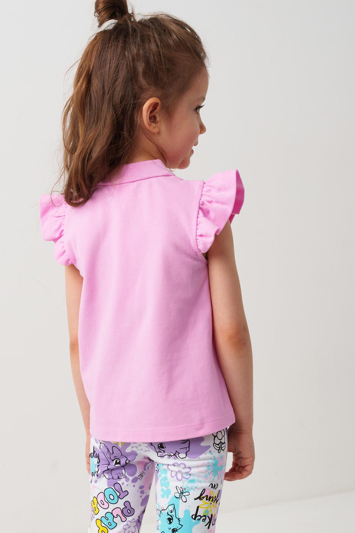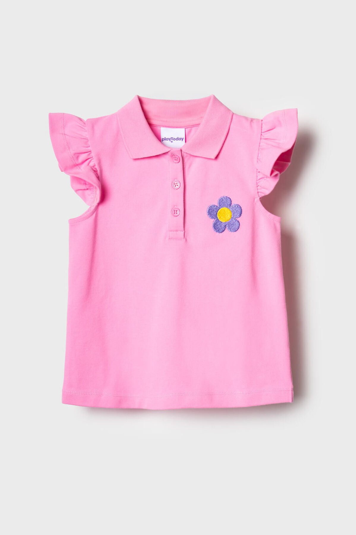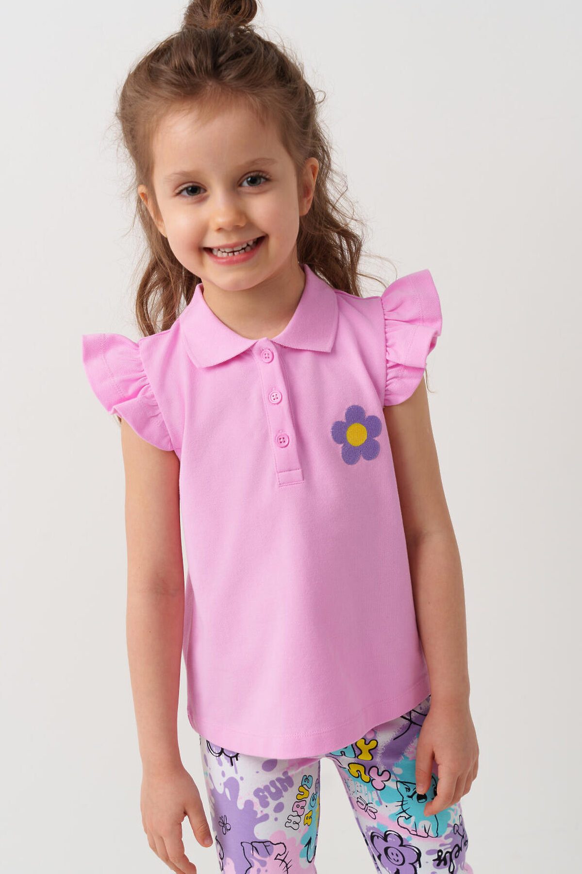Детская футболка-поло для девочки. Модель из хлопкового трикотажа пике с короткими рукавами-крылышками. Поло прямого кроя, средней длины. Воротник и планка выполнены из рельефной трикотажной ткани. На груди — яркая вышивка в виде цветка. Застежка на три пуговицы.