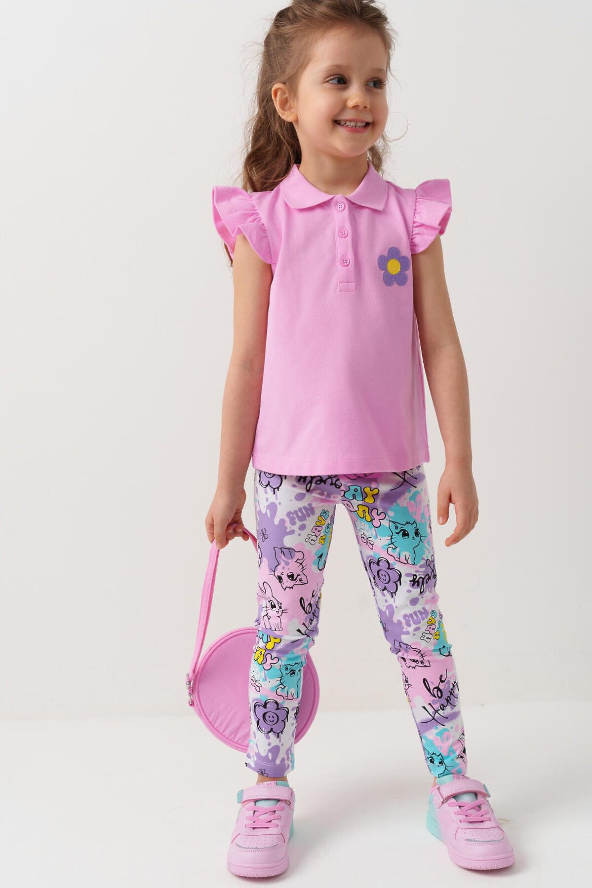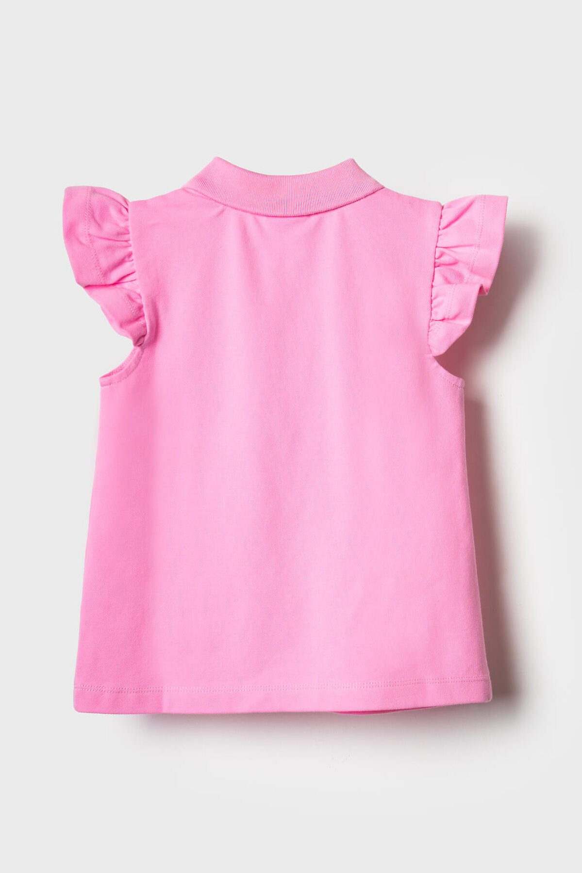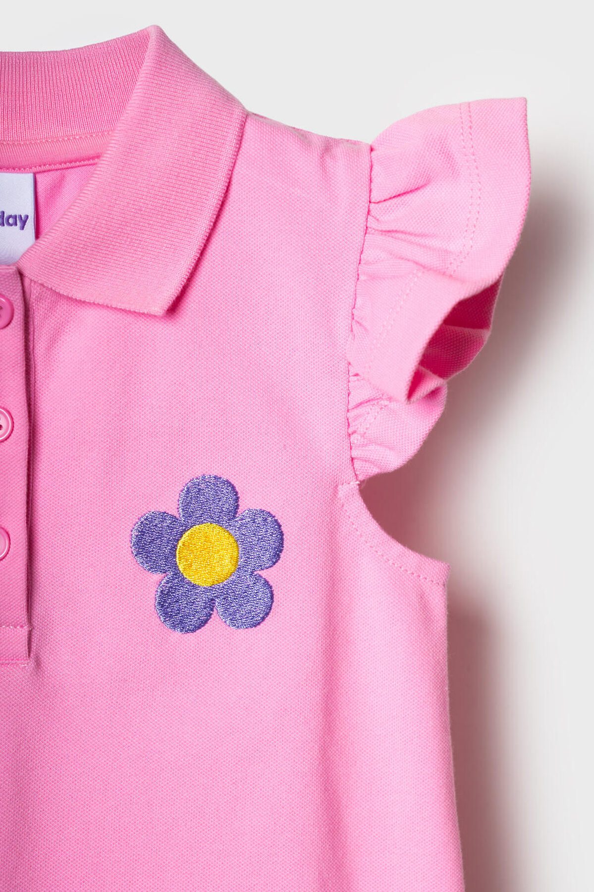 Детская футболка-поло для девочки. Модель из хлопкового трикотажа пике с короткими рукавами-крылышками. Поло прямого кроя, средней длины. Воротник и планка выполнены из рельефной трикотажной ткани. На груди — яркая вышивка в виде цветка. Застежка на три пуговицы.