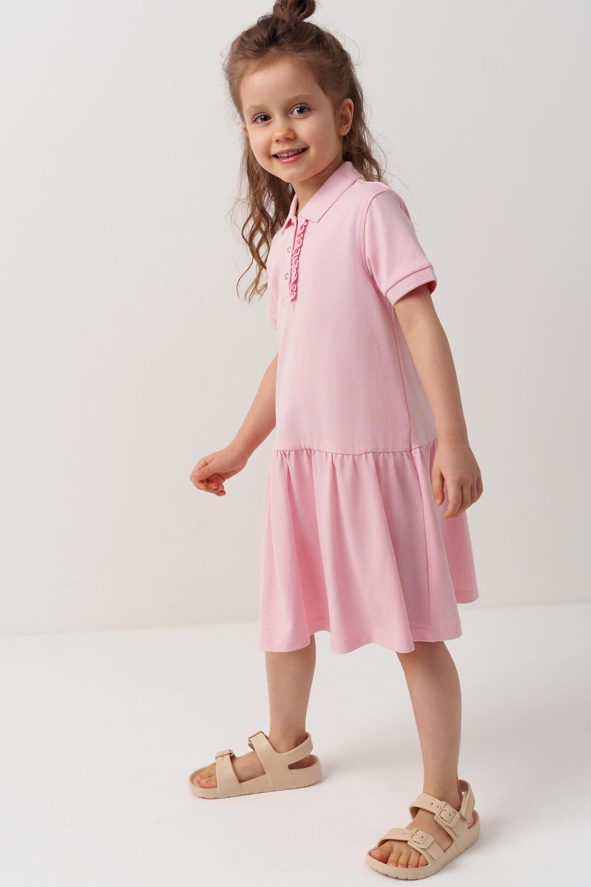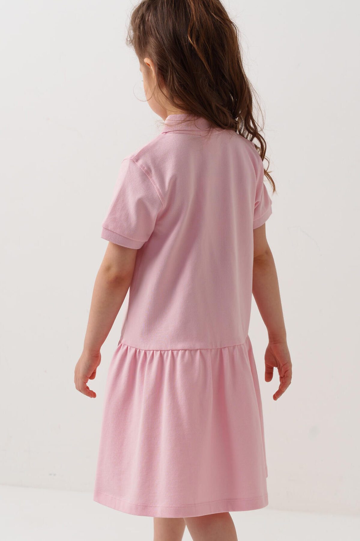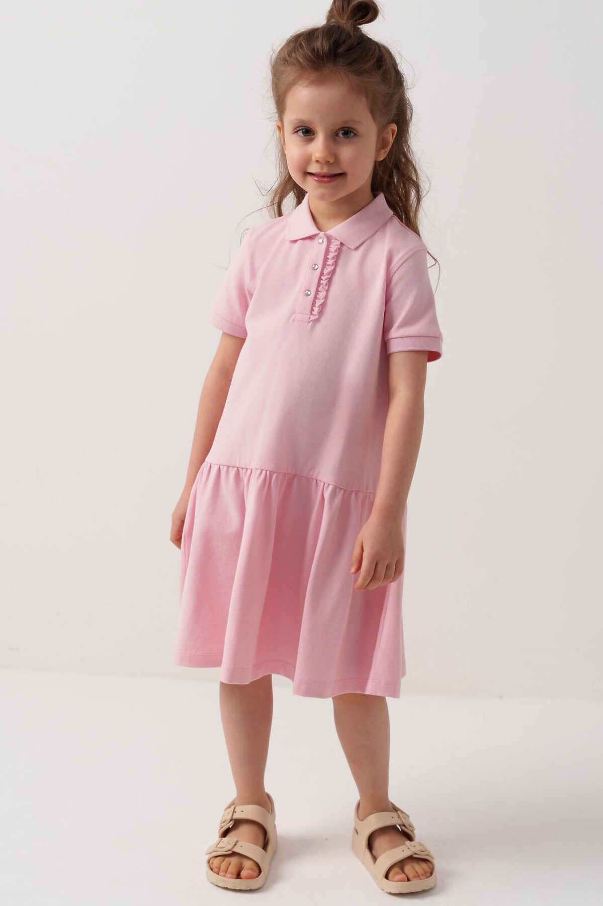Летнее детское платье-поло для девочки. Выполнено из мягкого хлопкового трикотажа пике. Короткие рукава, классический воротник поло и застежка на кнопки спереди. По низу — присборенная юбка, создающая нежный силуэт.
