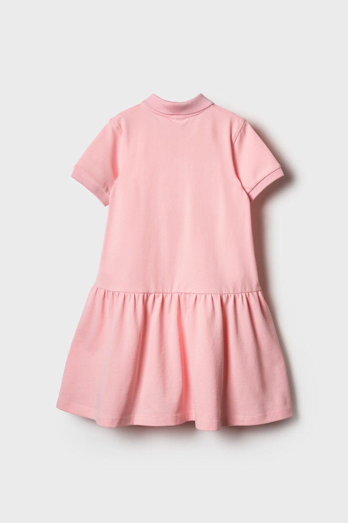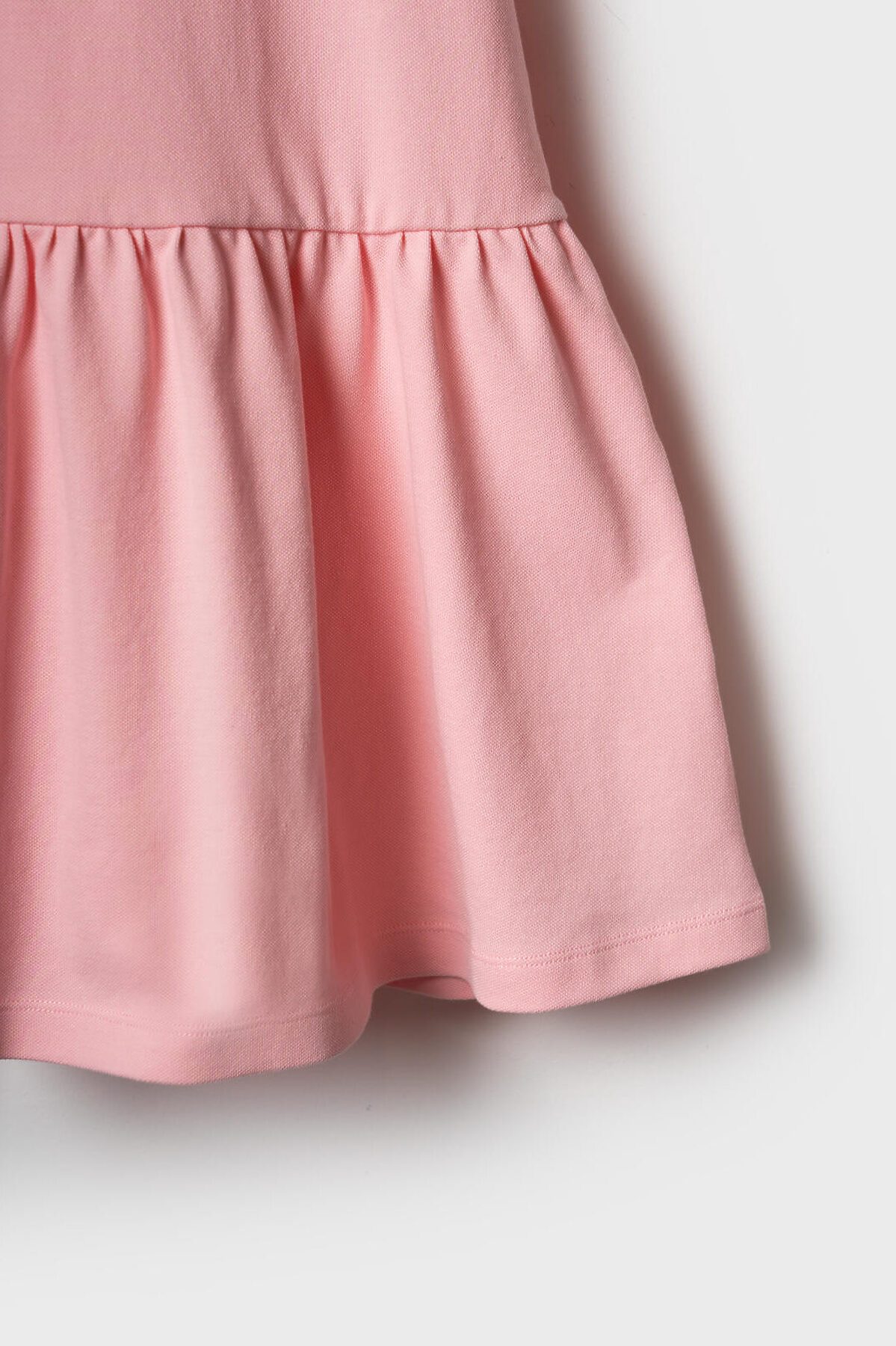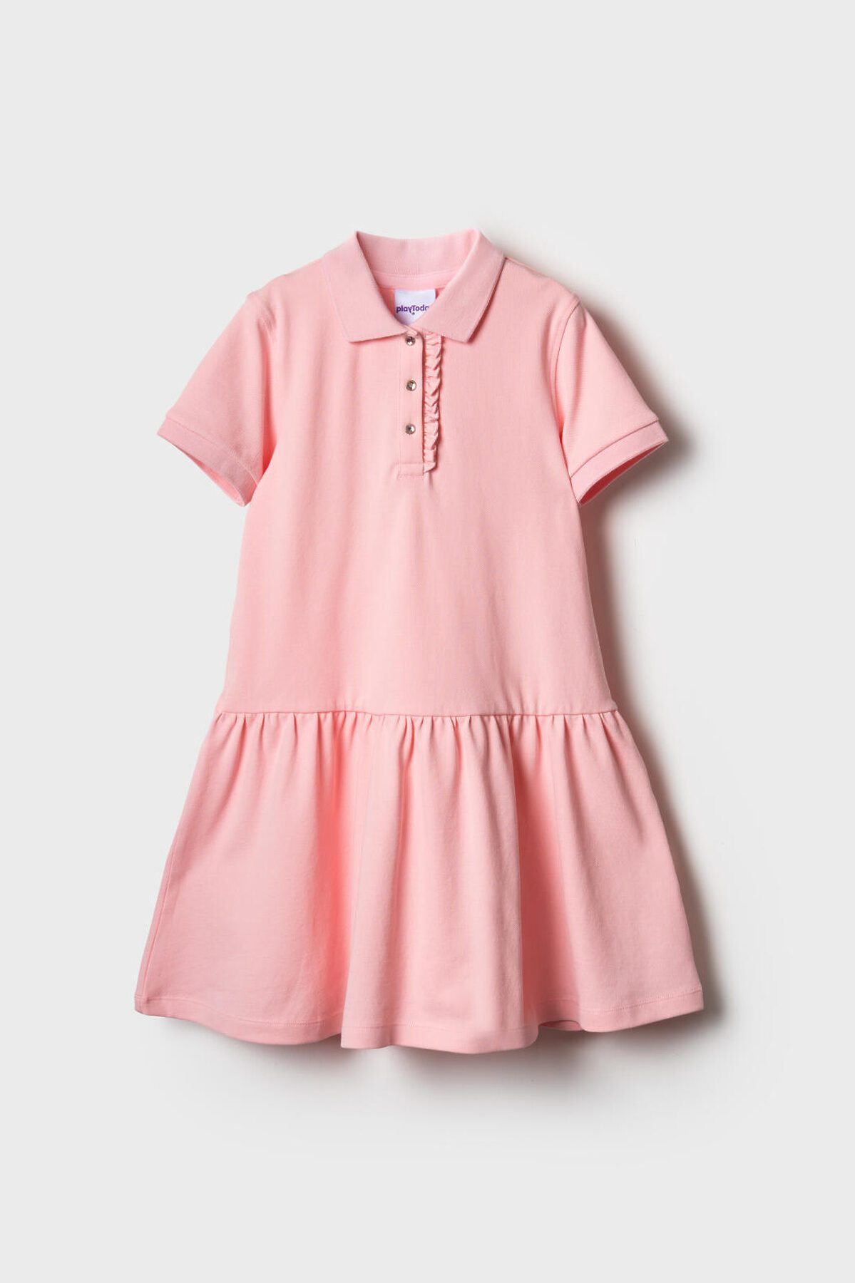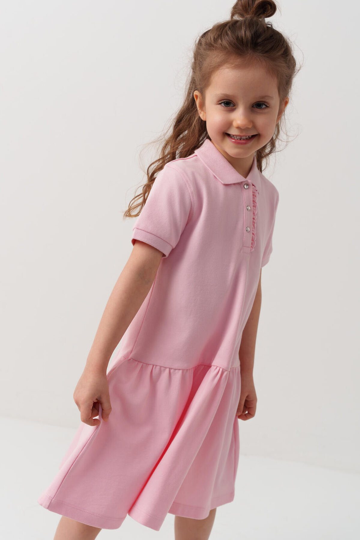 Летнее детское платье-поло для девочки. Выполнено из мягкого хлопкового трикотажа пике. Короткие рукава, классический воротник поло и застежка на кнопки спереди. По низу — присборенная юбка, создающая нежный силуэт.