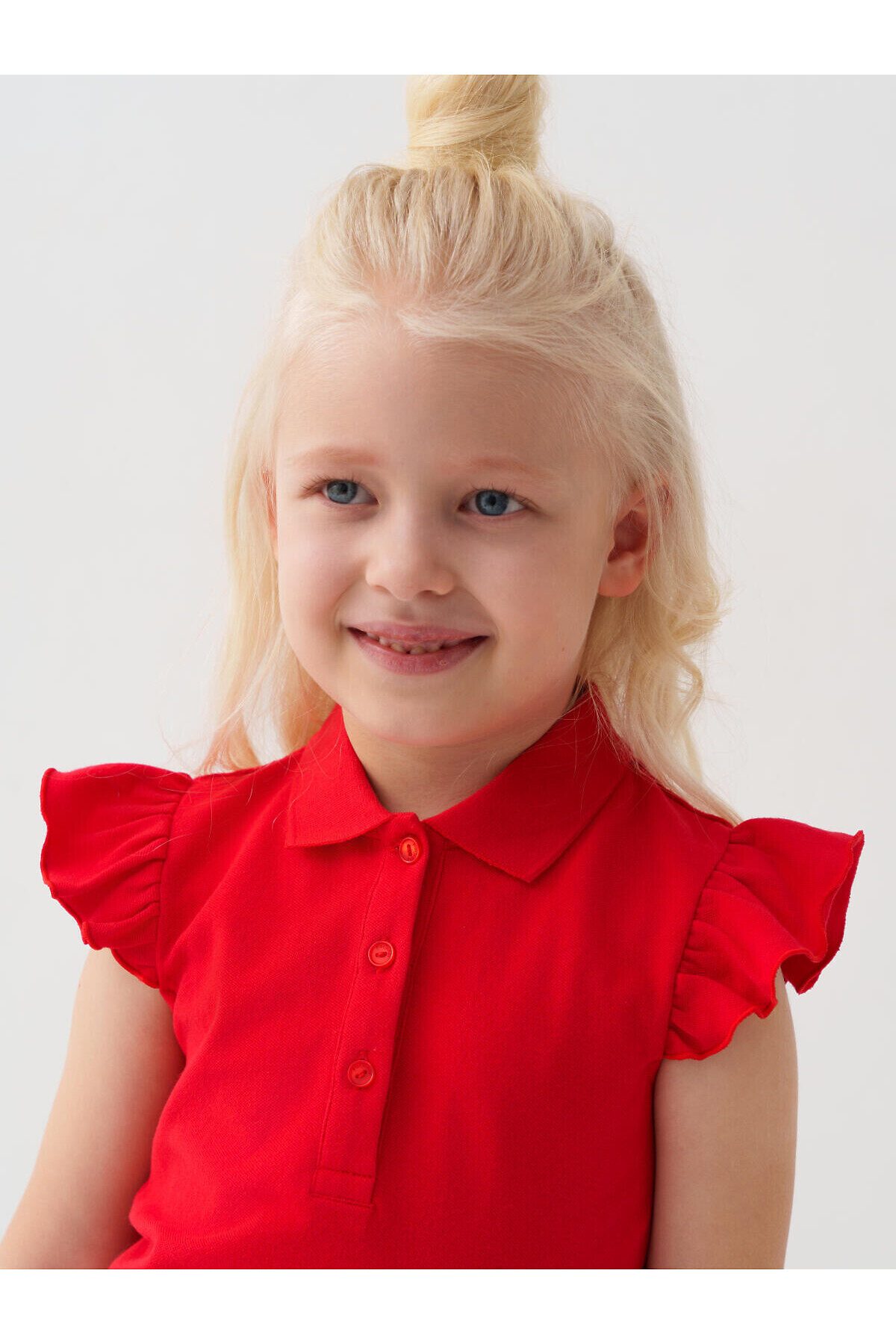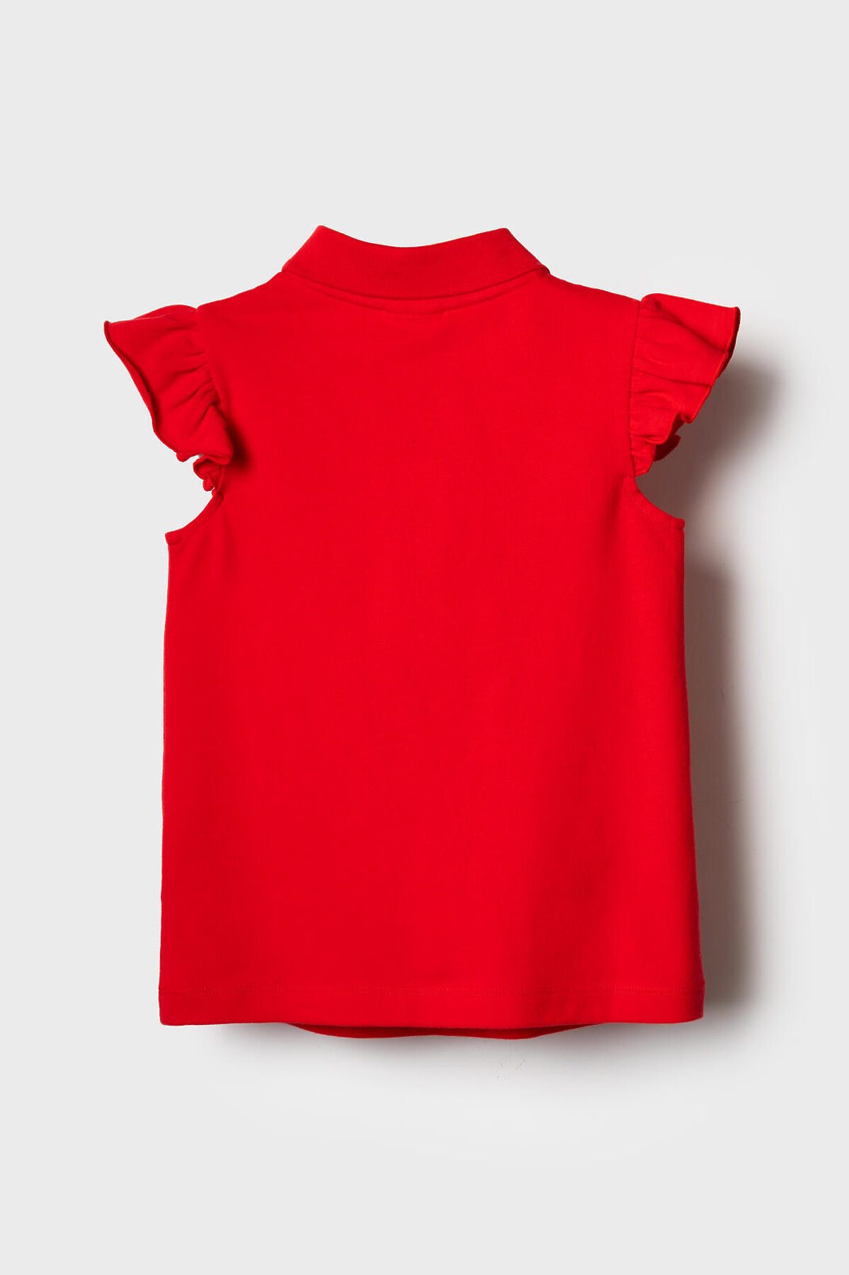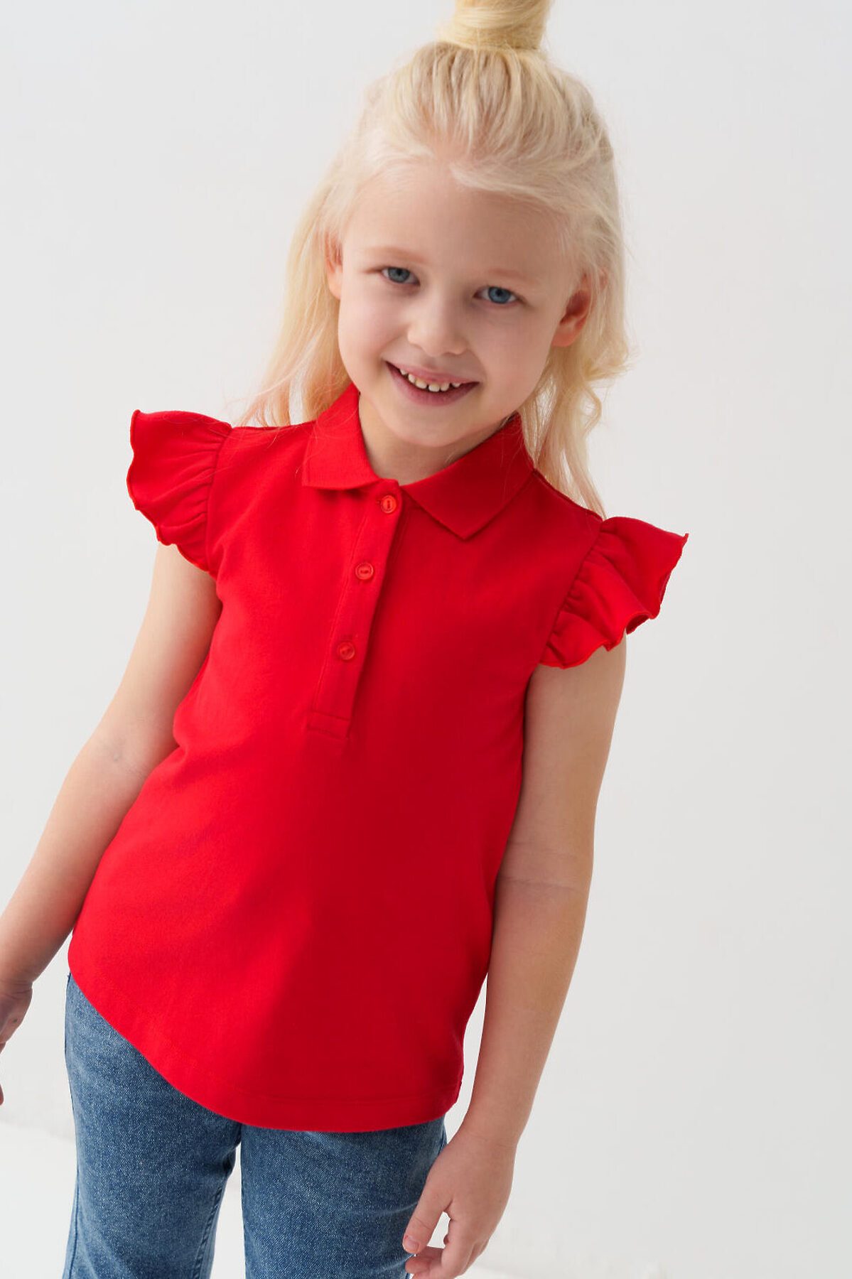 Детская футболка-поло для девочки. Модель из хлопкового трикотажа пике с короткими рукавами-крылышками. Поло прямого кроя, средней длины. Воротник и планка выполнены из рельефной трикотажной ткани. Застежка на три пуговицы.
