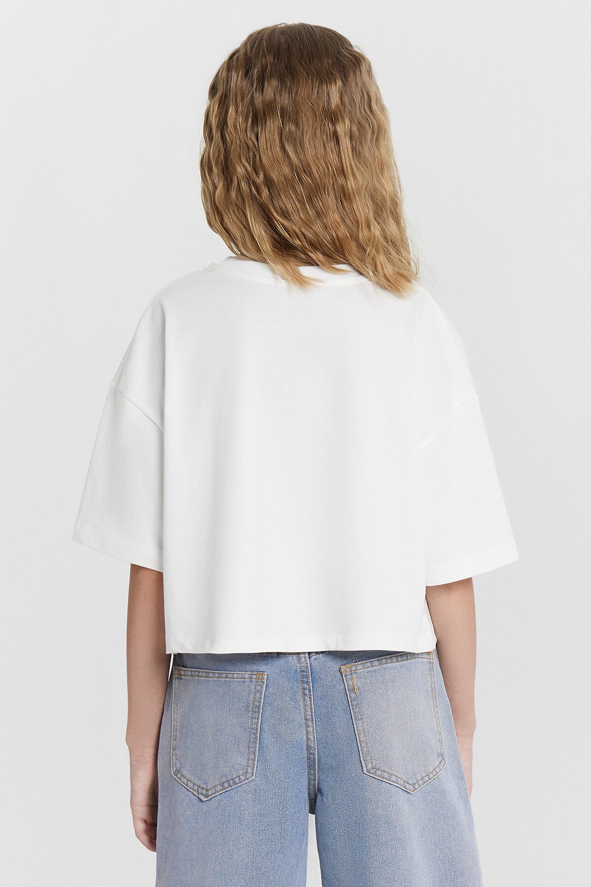 Футболка прямого силуэта укороченная. Перед и спинка цельнокроенные. Рукав втачной, короткий. Горловина круглой формы. Окантована обтачкой из рибаны. Шов втачивания обтачки по спинке закрыт бейкой из основного полотна. Низ рукавов и футболки швом в подгибку.