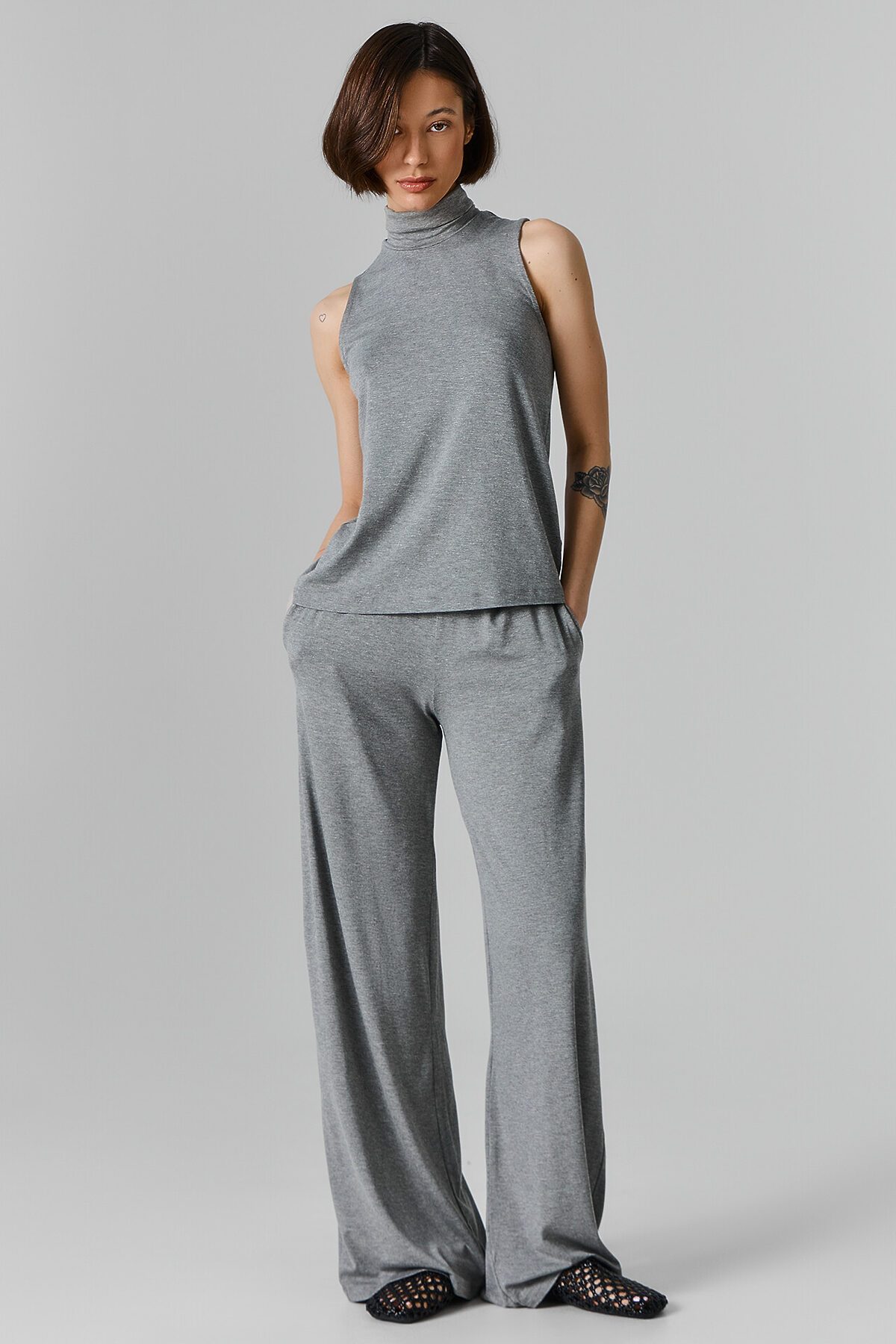 Брюки прямые, свободного силуэта. Посадка средняя, сиденье опущено. Пояс цельнокроеный с эластичной тесьмой внутри (вн. 20мм 20RV). В боковых швах обработаны карманы. Подкладка кармана из основного полотна. Нижние срезы обработаны швом вподгибку.