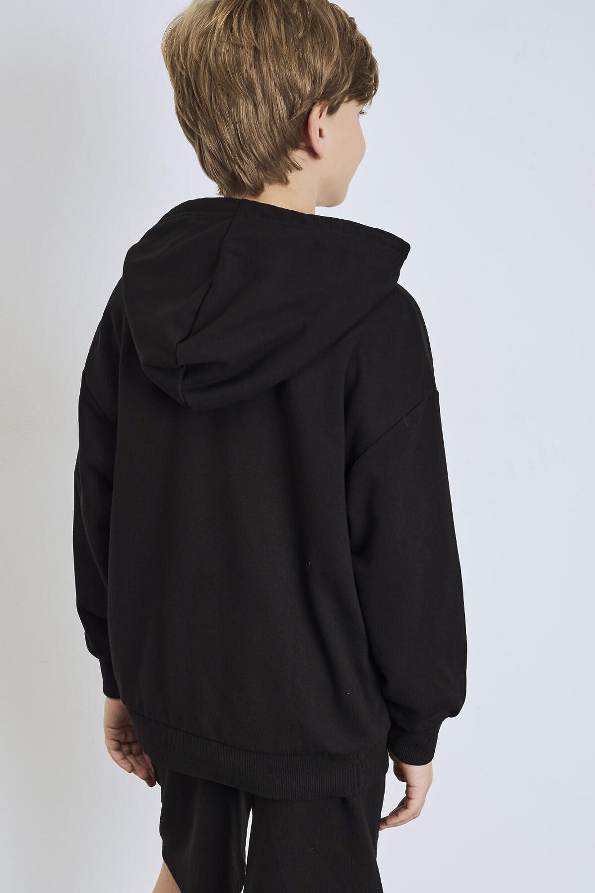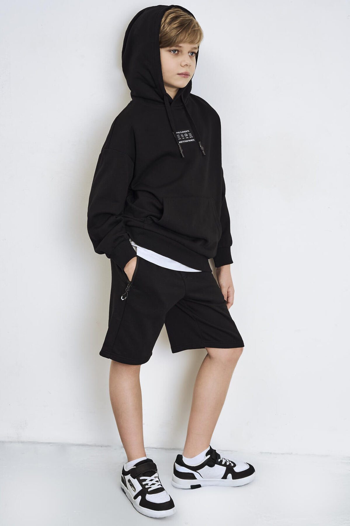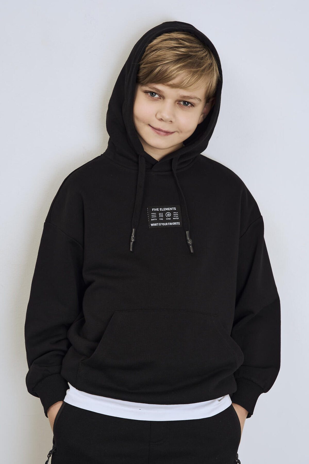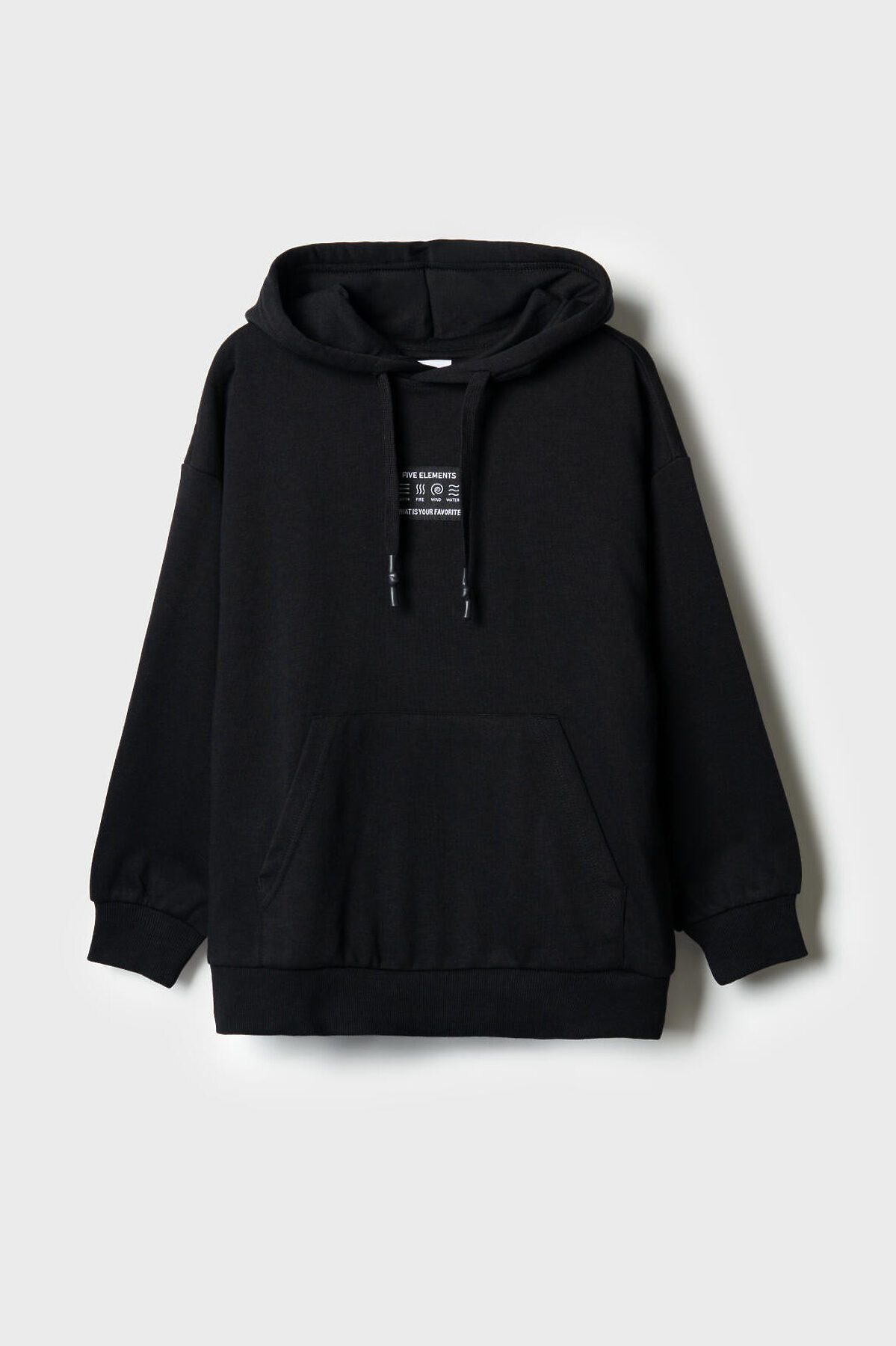 Чёрное худи оверсайз для мальчика подростка. Модель свободного кроя, с длинными рукавами и удобным карманом-кенгуру спереди. Капюшон оснащён шнурком для регулировки. По низу изделия и на рукавах — мягкие трикотажные манжеты. На груди — декоративная нашивка с надписью. Толстовка выполнена из приятного на ощупь хлопкового футера без начеса.