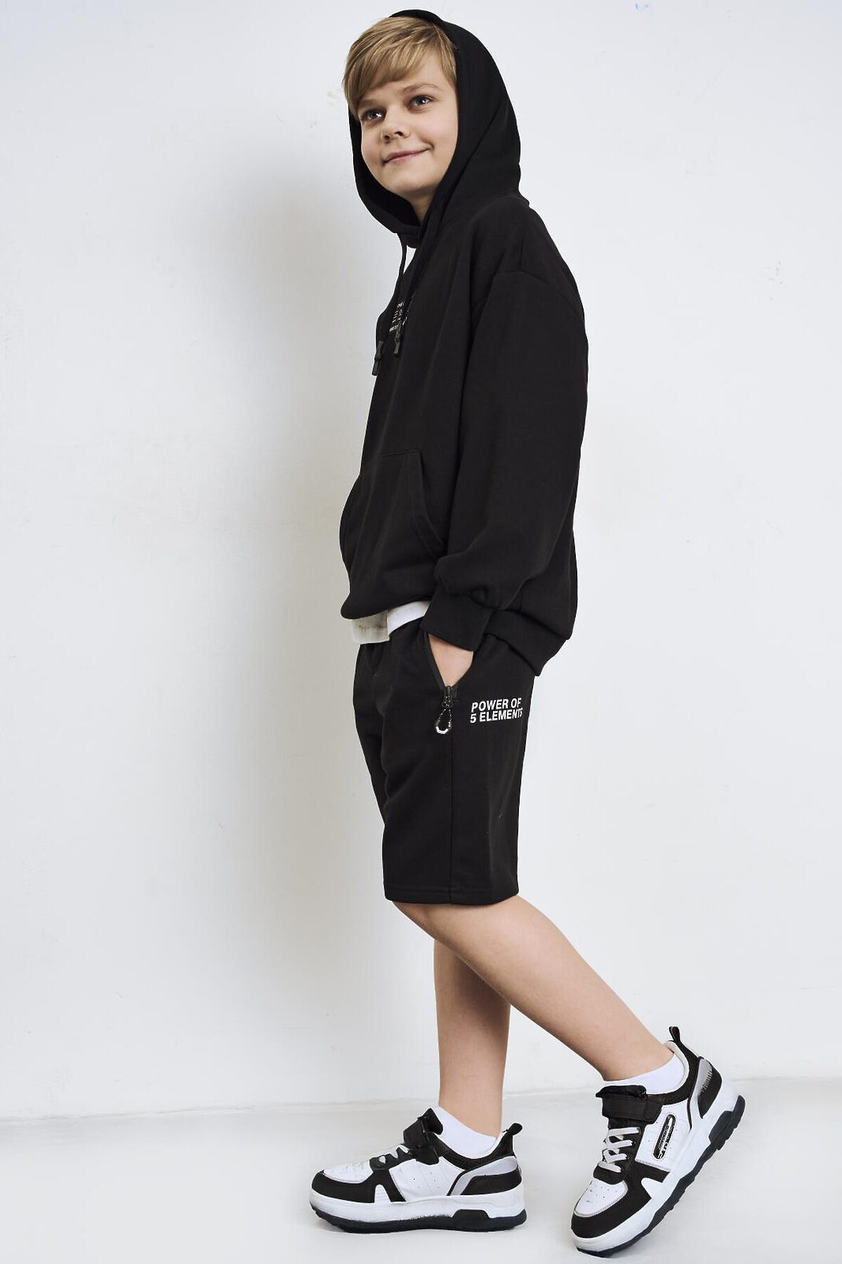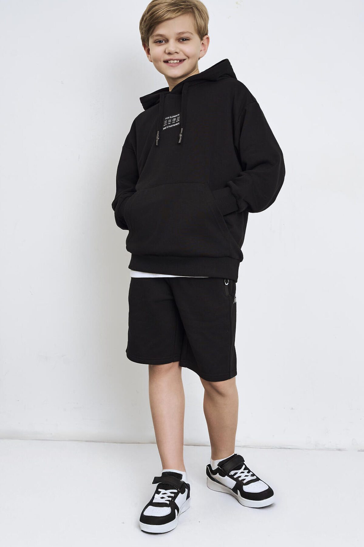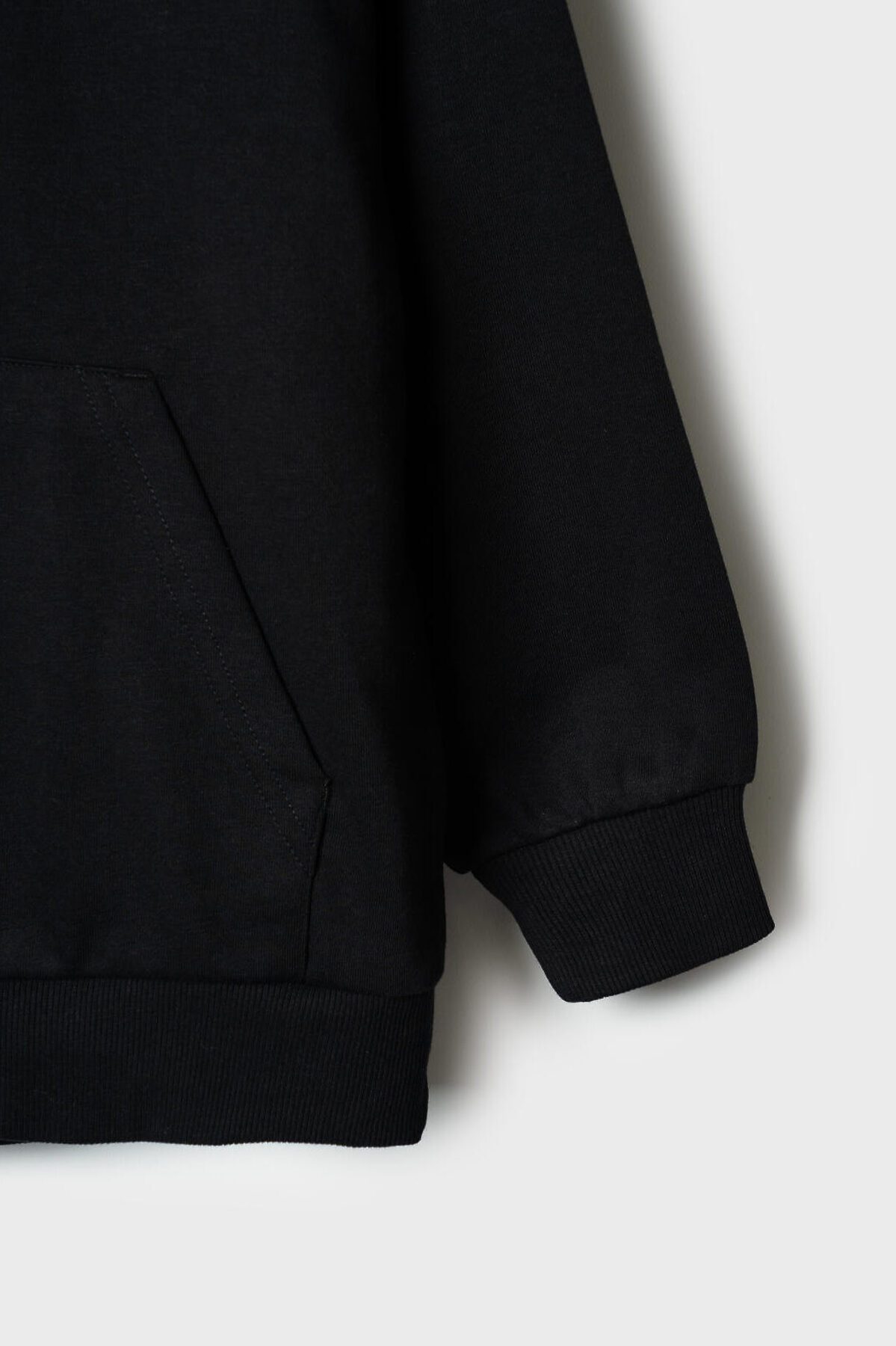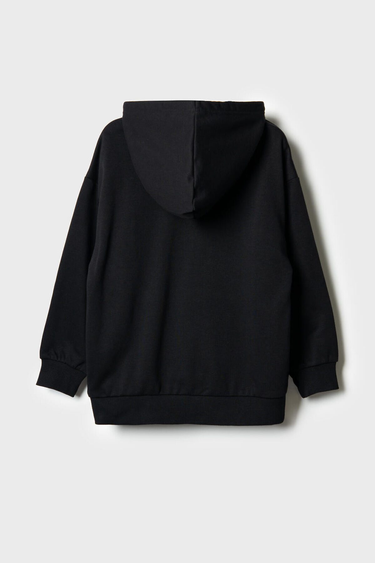 Чёрное худи оверсайз для мальчика подростка. Модель свободного кроя, с длинными рукавами и удобным карманом-кенгуру спереди. Капюшон оснащён шнурком для регулировки. По низу изделия и на рукавах — мягкие трикотажные манжеты. На груди — декоративная нашивка с надписью. Толстовка выполнена из приятного на ощупь хлопкового футера без начеса.