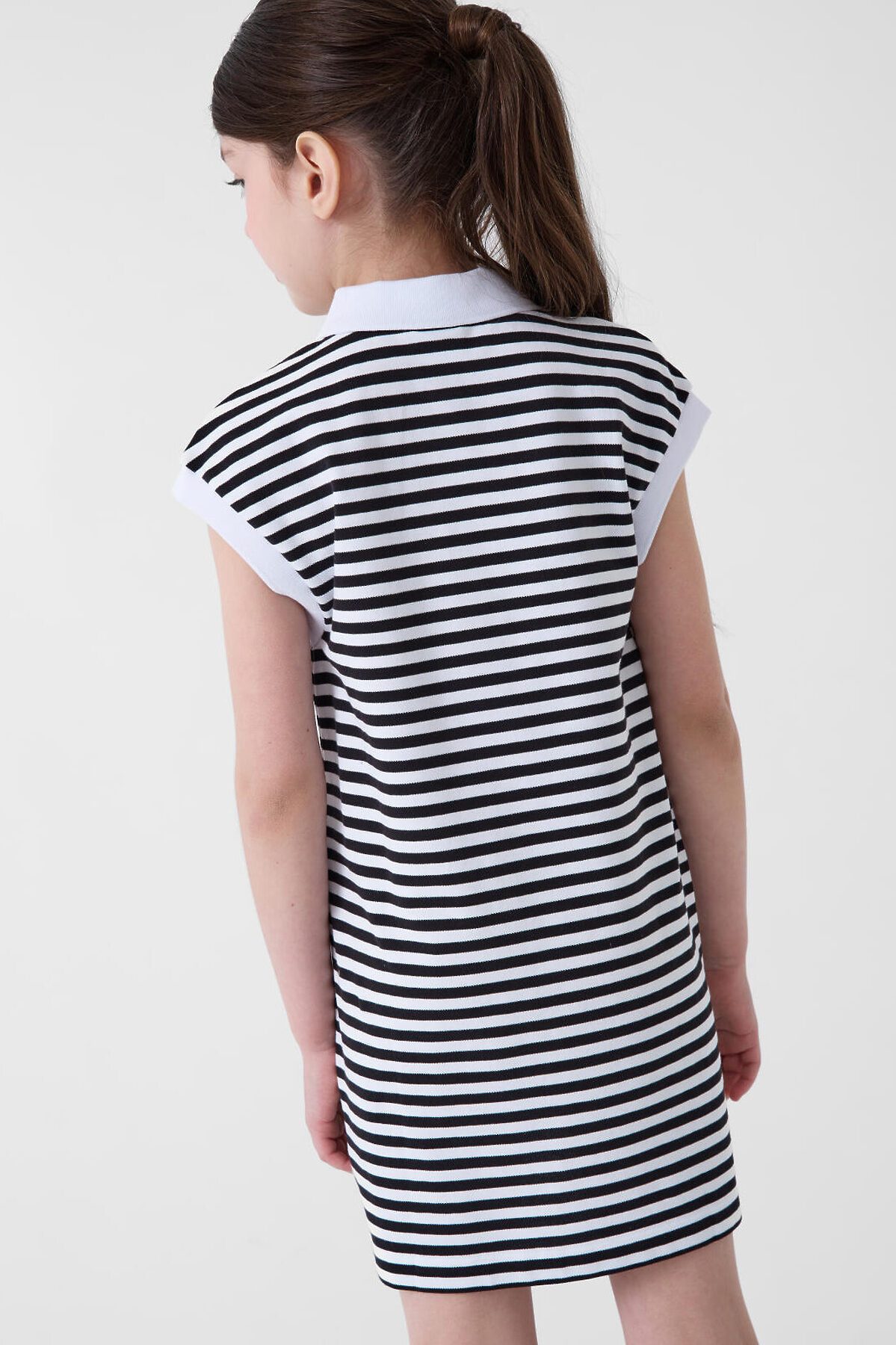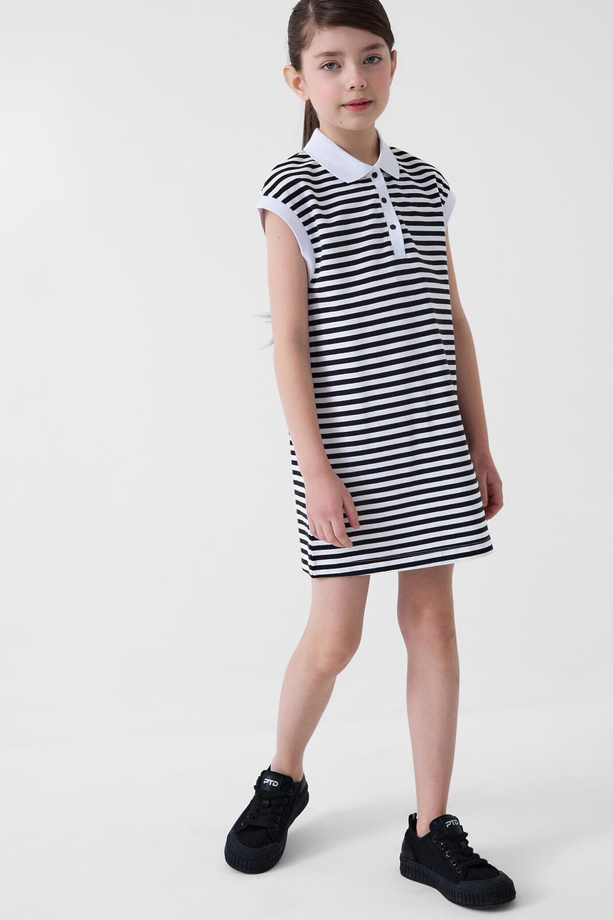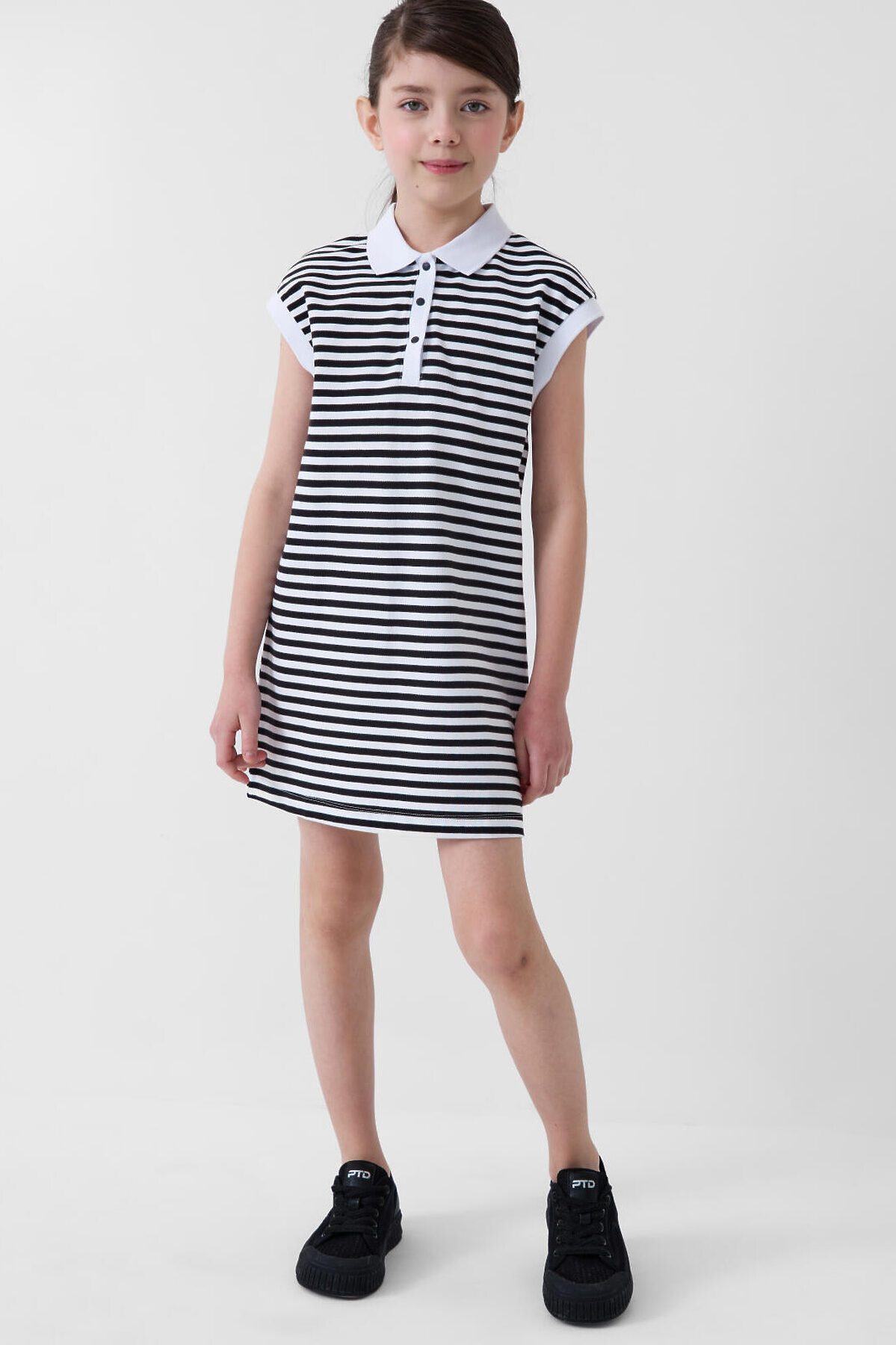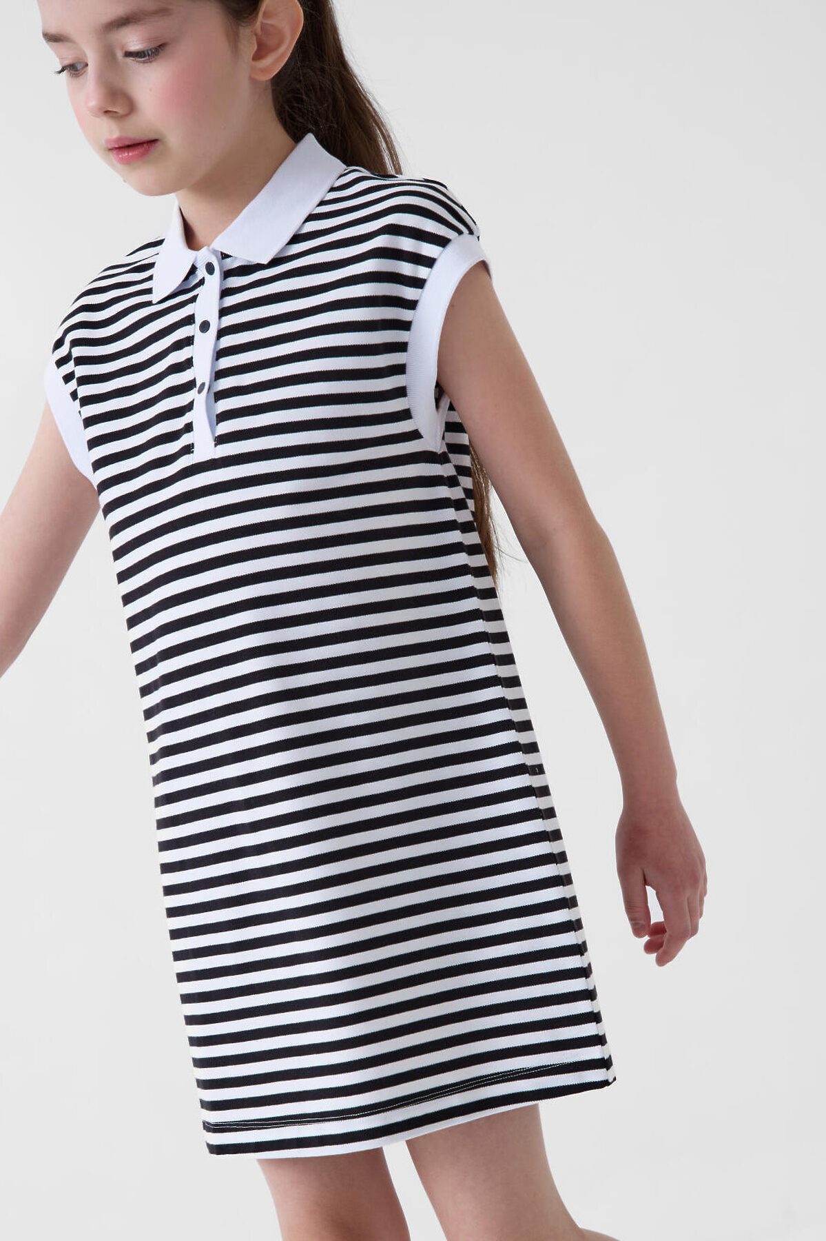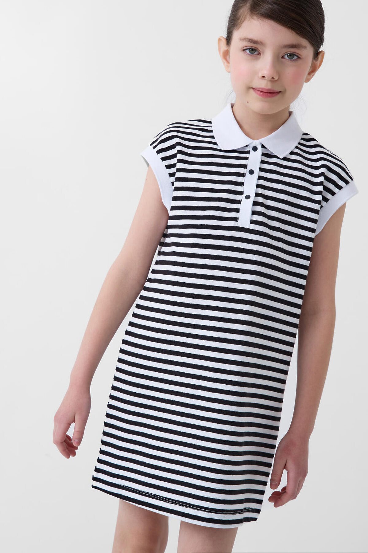 Платье-поло для девочки подростка. Выполнено из мягкого хлопкового трикотажа пике. Прямой силуэт и короткие рукава. У модели классический рубашечный воротник, планка на кнопках и аккуратные манжеты. Длина — чуть выше колена.