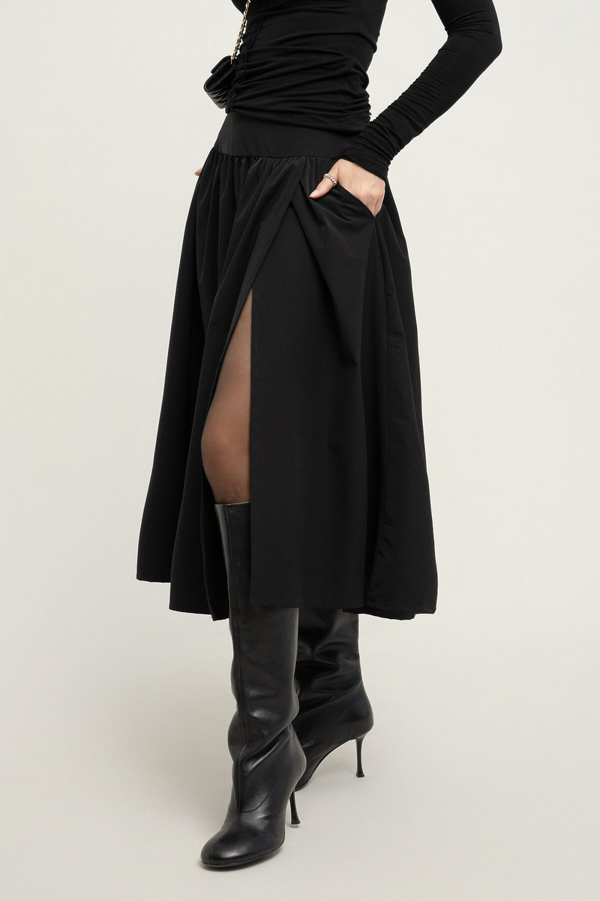 Юбка миди с летящей тканью и разрезом спереди станет прекрасным дополнением вашего гардероба. Модель выполнена в комфортном А-силуэте со средней посадкой, что обеспечивает удобство для повседневного ношения. Застежка на молнию облегчает надевание, а кокетка добавляет образу легкости и динамичности. Черный цвет это вечная классика, легко сочетающаяся с любыми оттенками и аксессуарами. Юбка идеально подходит для создания стильных и элегантных образов, будь то офисный дресс-код или особое мероприятие. Рекомендуется стирать юбку в деликатном режиме при температуре не выше 30C. Не используйте отбеливатель, избегайте сушки в барабане и гладьте при температуре не выше 110C. Допускается химическая чистка.