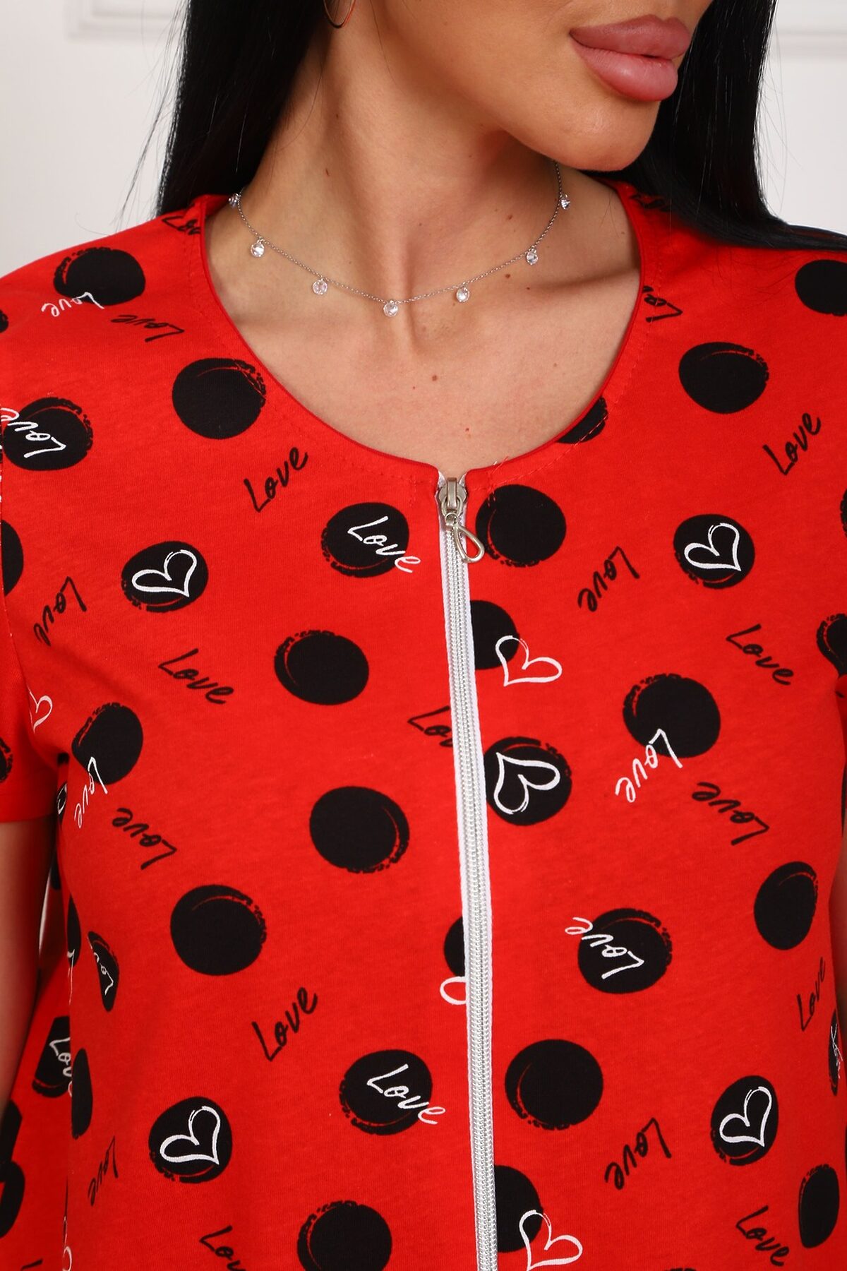 Халат молодежный из натурального, набивного, трикотажного полотна. Горловина круглая. Силуэт -расклешенный к низу. В боковых швах карманы. низ изделия прямой. рукав короткий. Застежка на тесьму молнию.