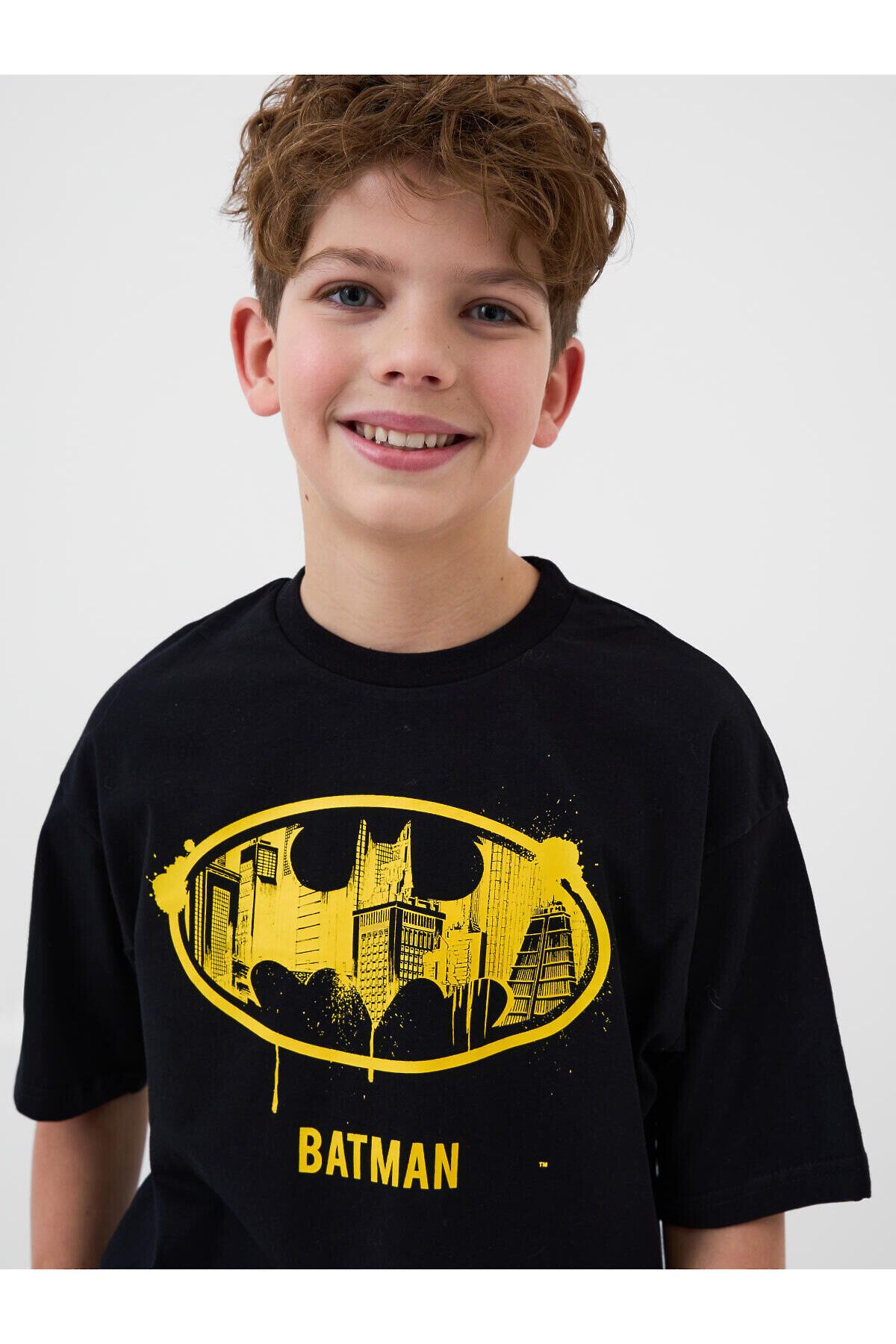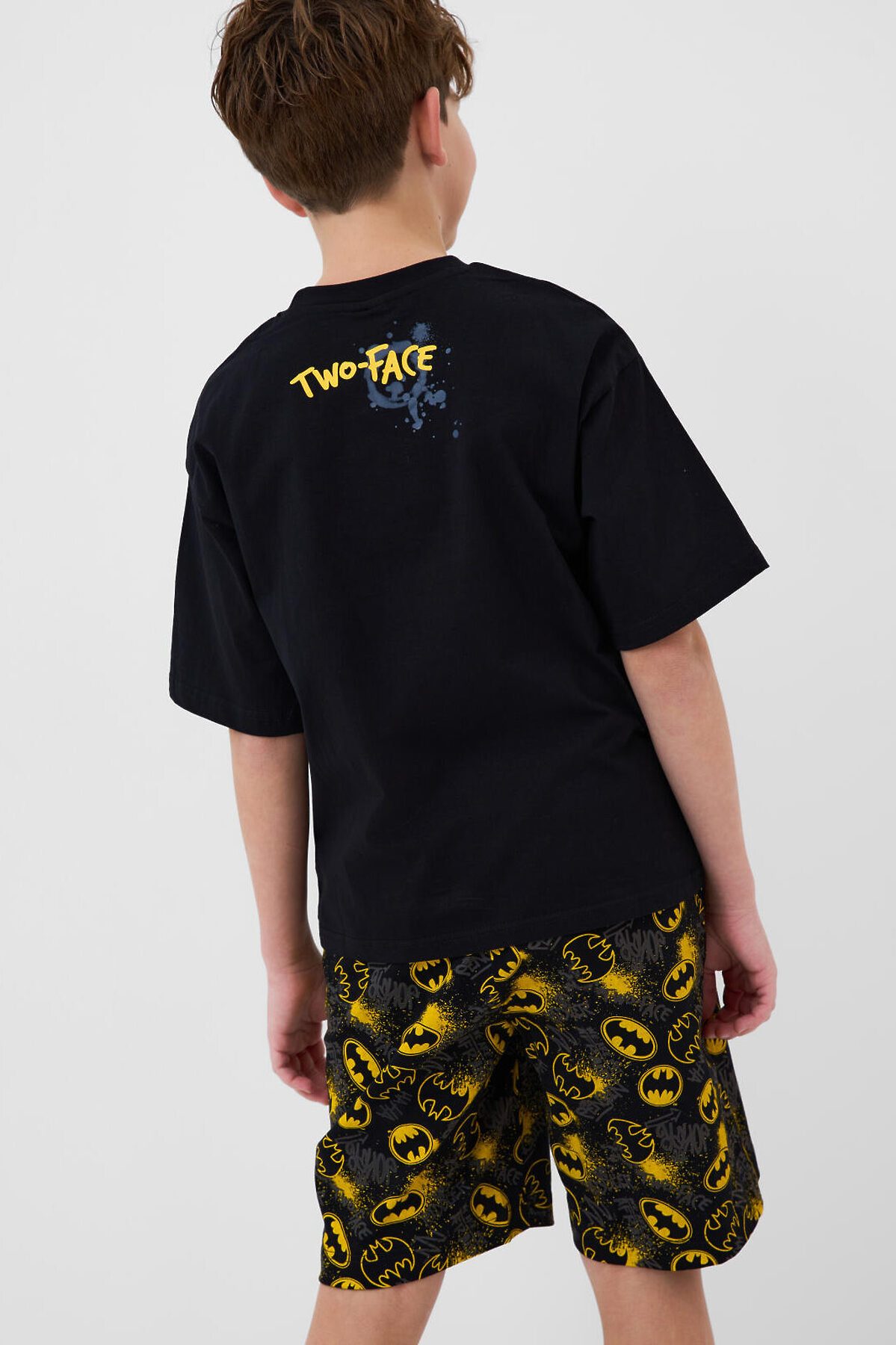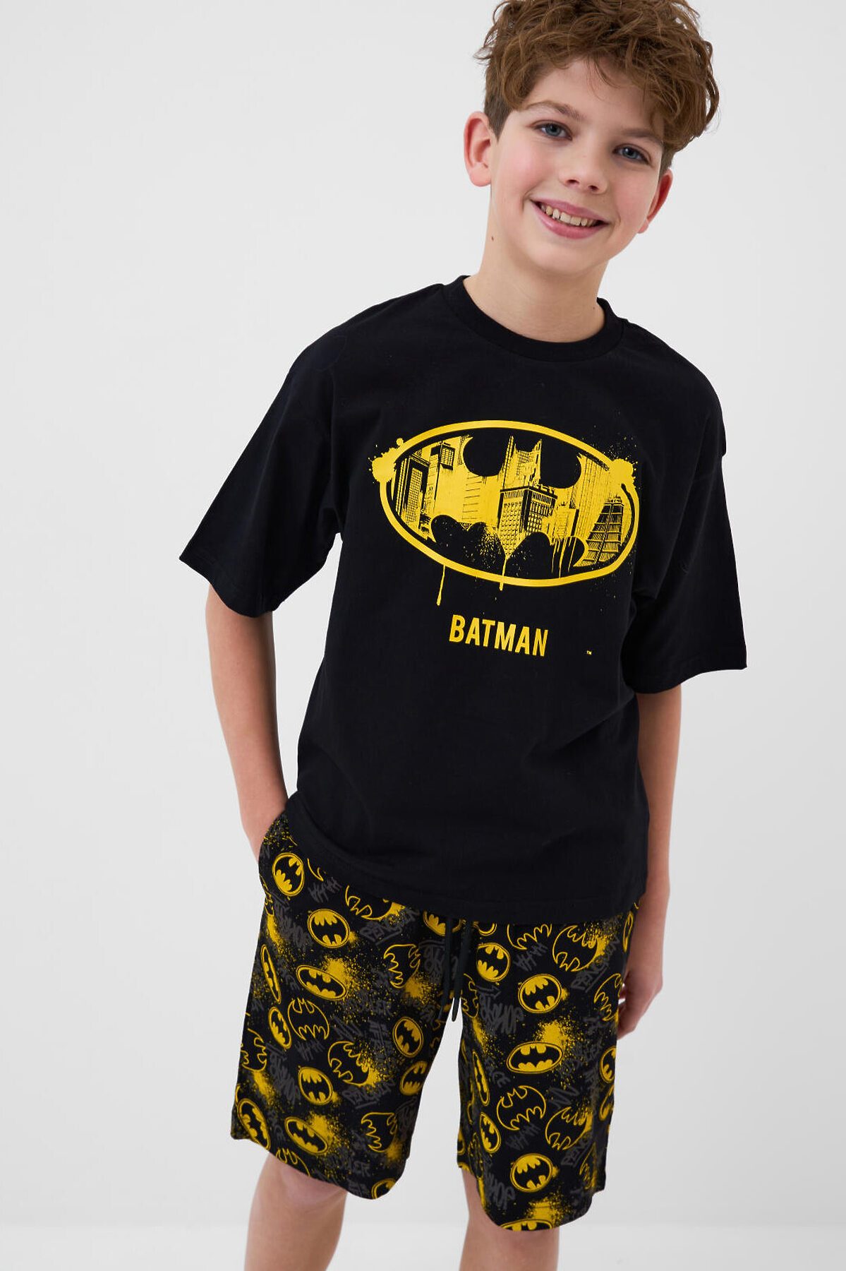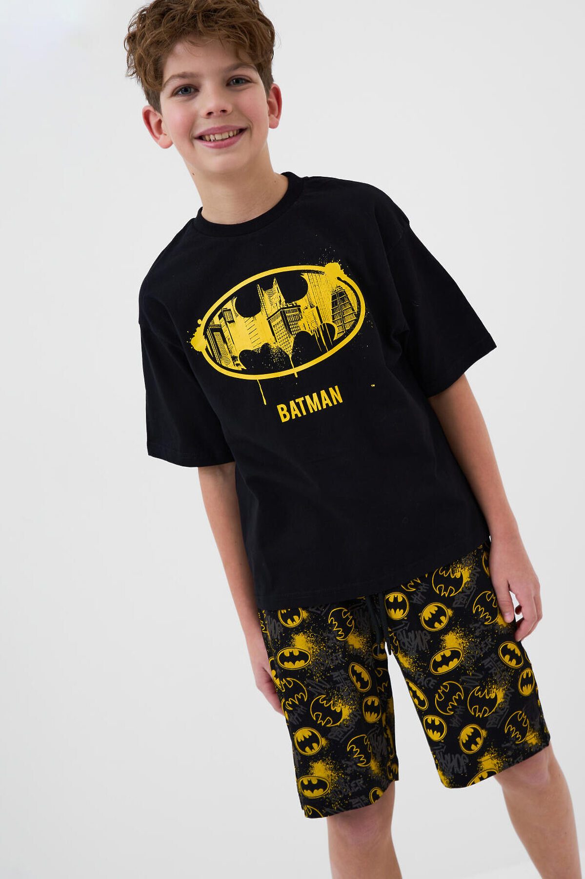Пижама для мальчика подростка. Комплект состоит из чёрной оверсайз футболки и шорт. На футболке спереди крупный яркий принт с логотипом Бэтмен. Шорты украшены ярким принтом с логотипами. Шорты средней длины, с удобным эластичным поясом и шнурком для регулировки. Материал - хлопковый, мягкий трикотаж.