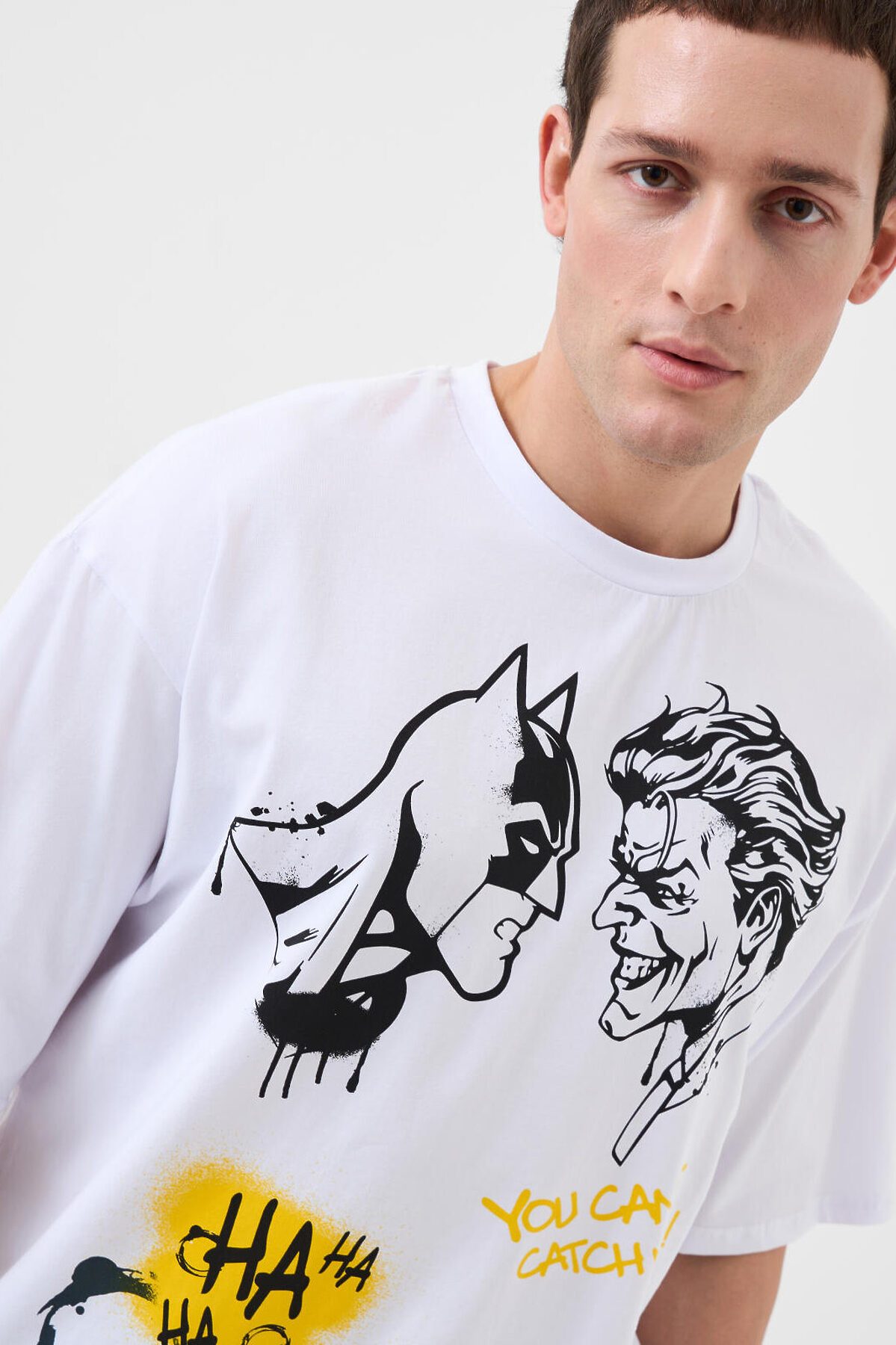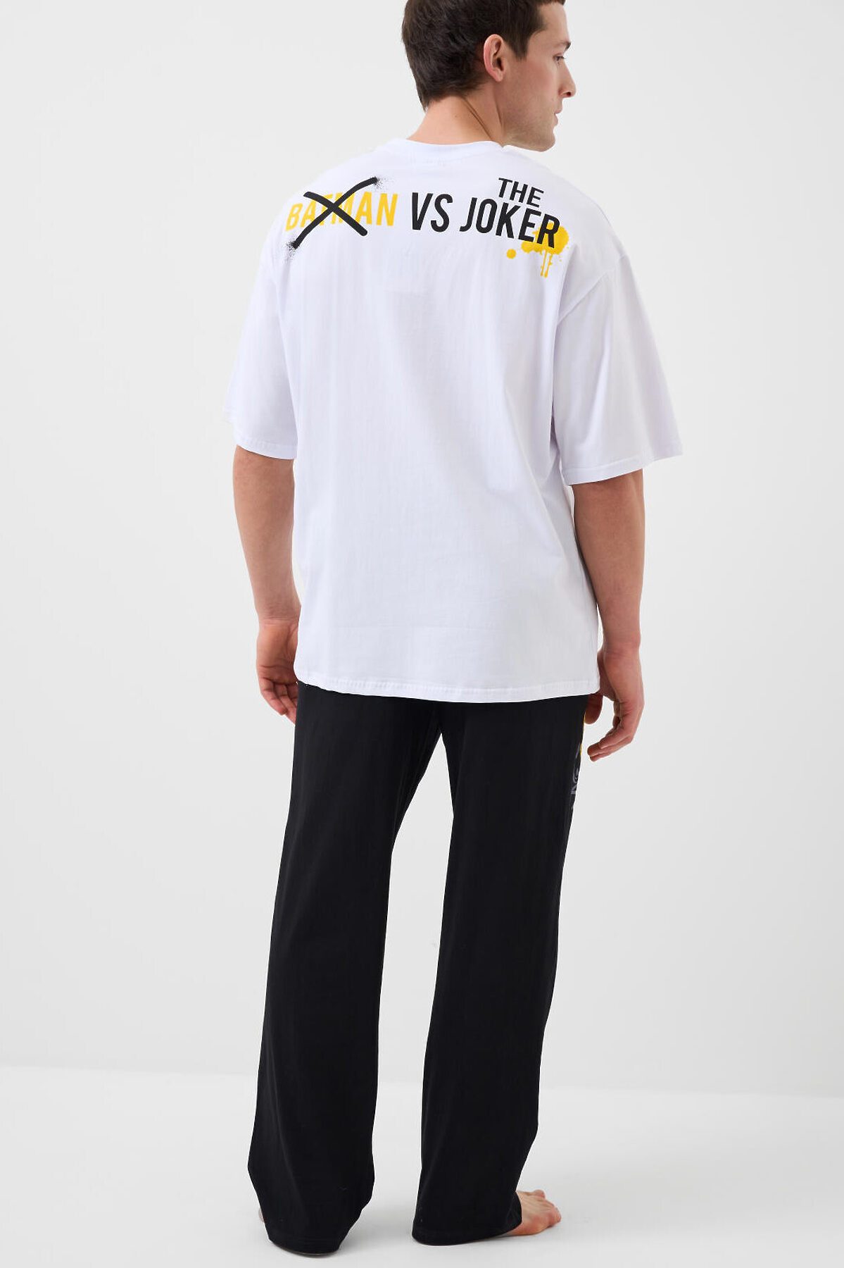 Мужская пижама. Комплект состоит из белой оверсайз футболки с коротким рукавом и чёрных брюк. На футболке изображены персонажи Бэтмен и Джокер в стиле граффити. Брюки на широкой резинке со шнурком для регулировки, с боковыми карманами. Материал - мягкий, хлопковый трикотаж. Можно составить family look c детским вариантом пижамы аналогичного дизайна.