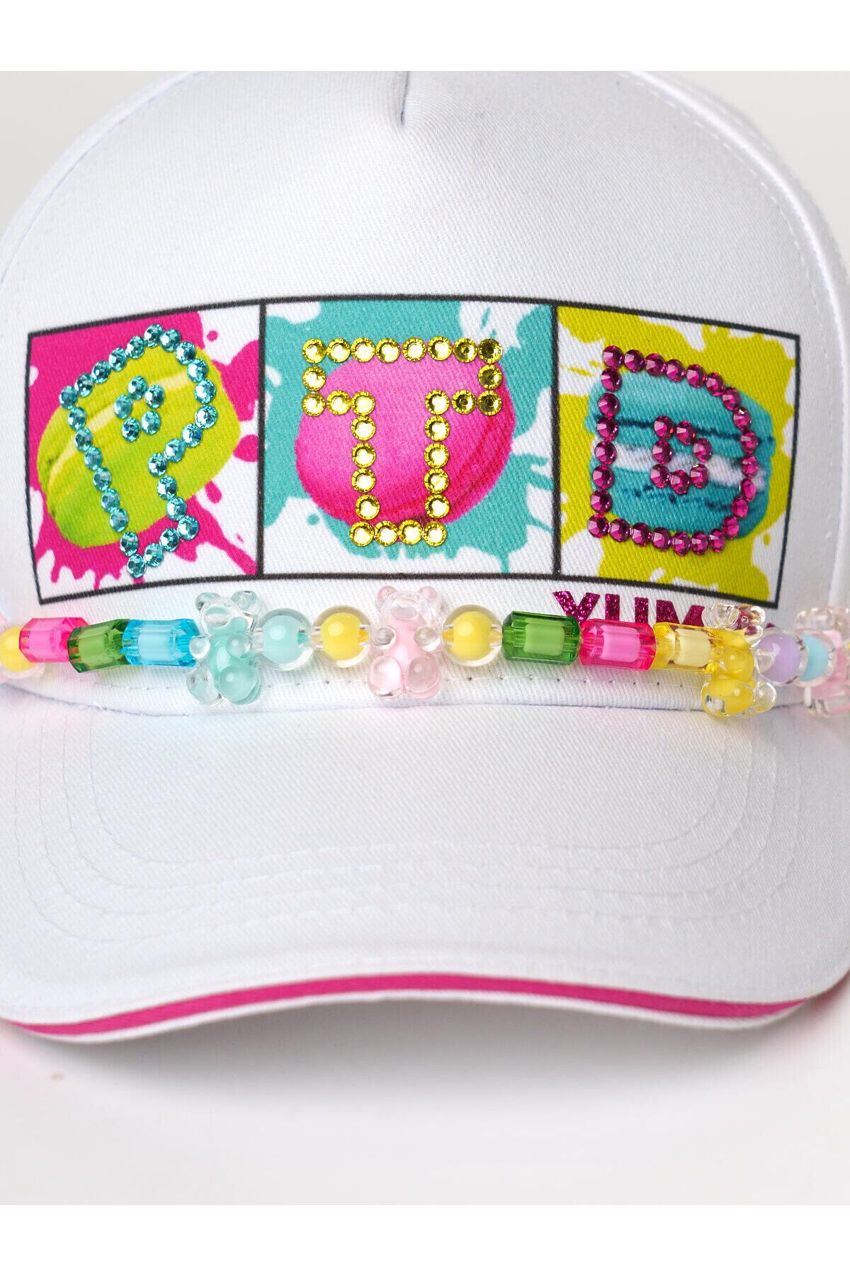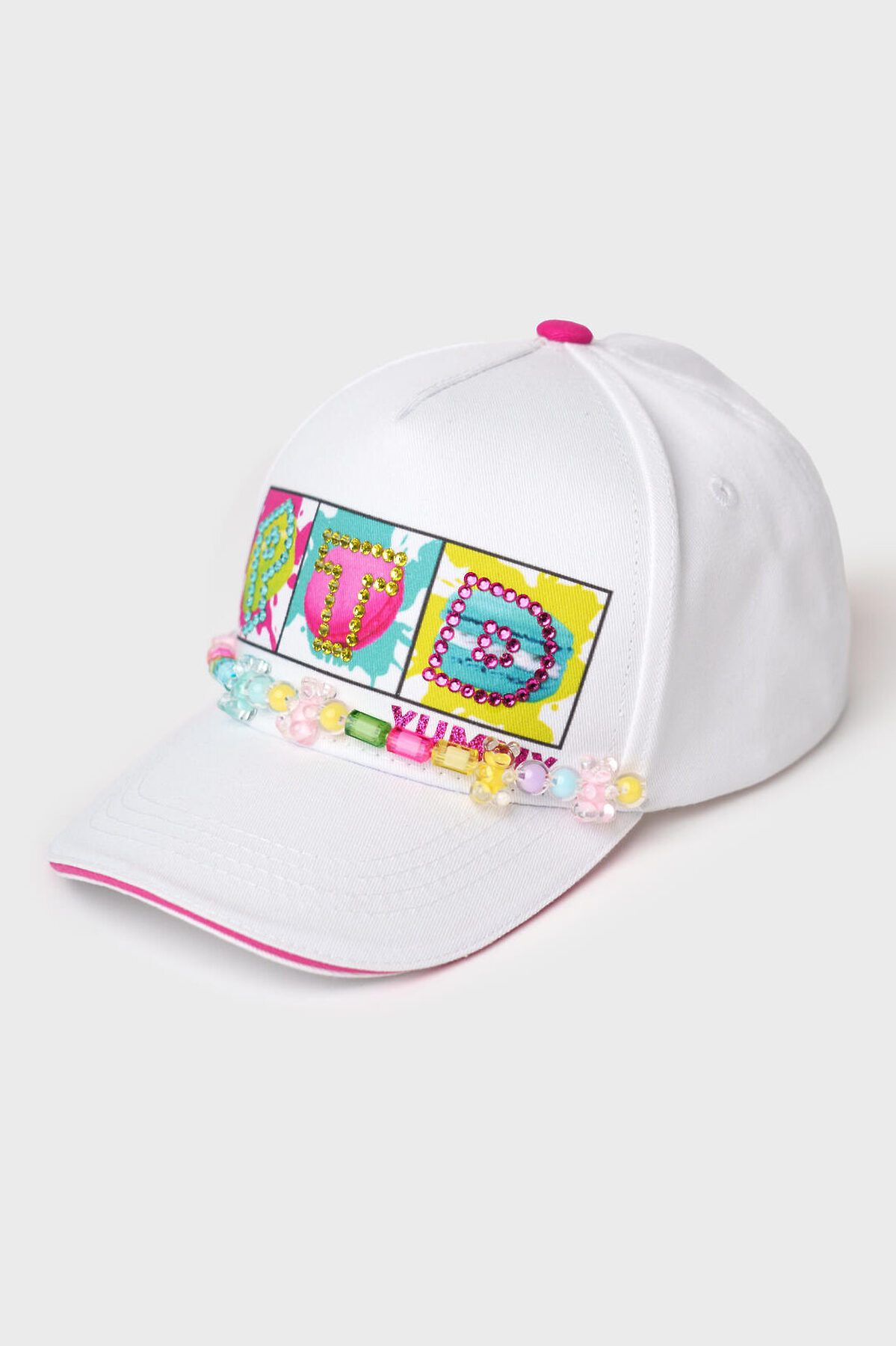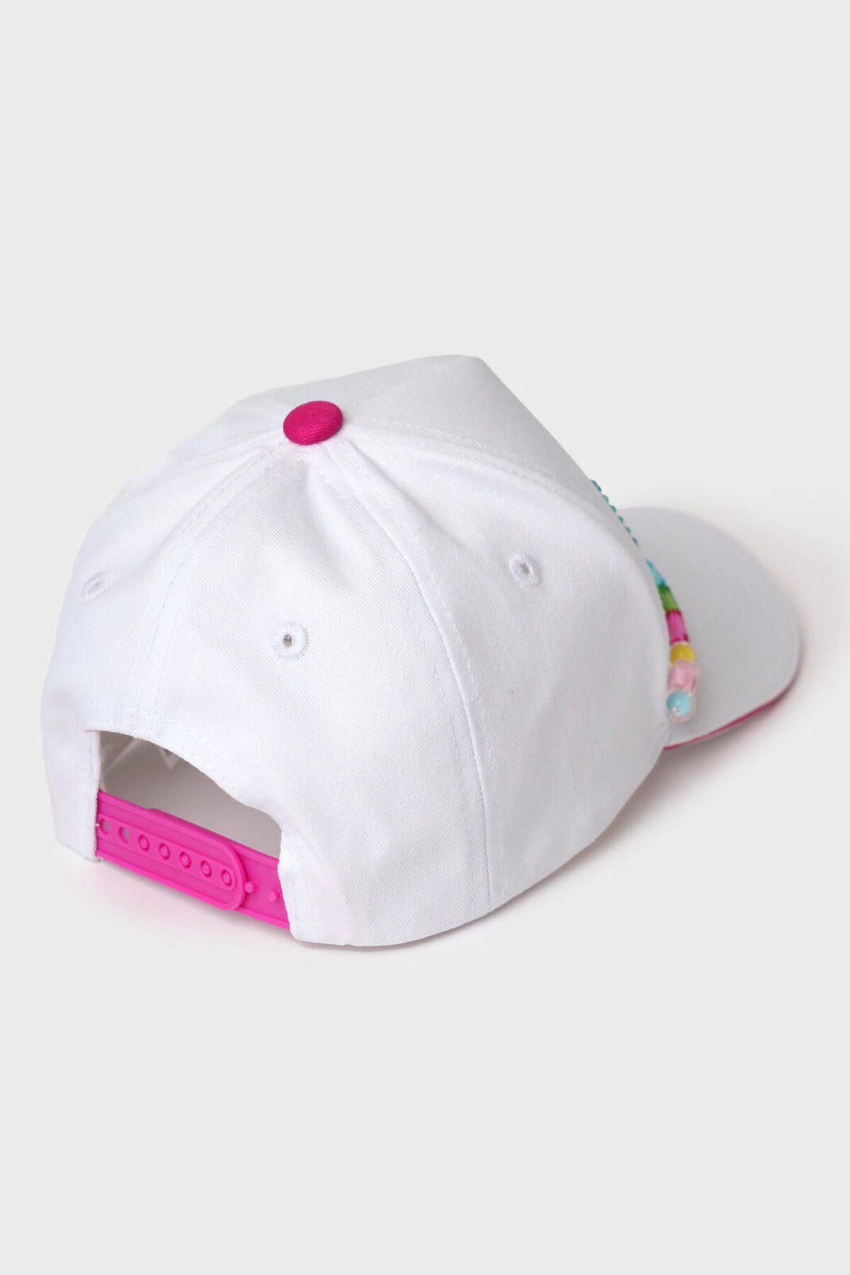 Стильная детская бейсболка для девочки. Выполнена из хлопковой ткани с классическим изогнутым козырьком. По линии шва козырька добавлена лента из разноцветных бусин, которая придаёт изделию оригинальность. Сзади — пластиковая застежка на кнопках для регулировки размера.