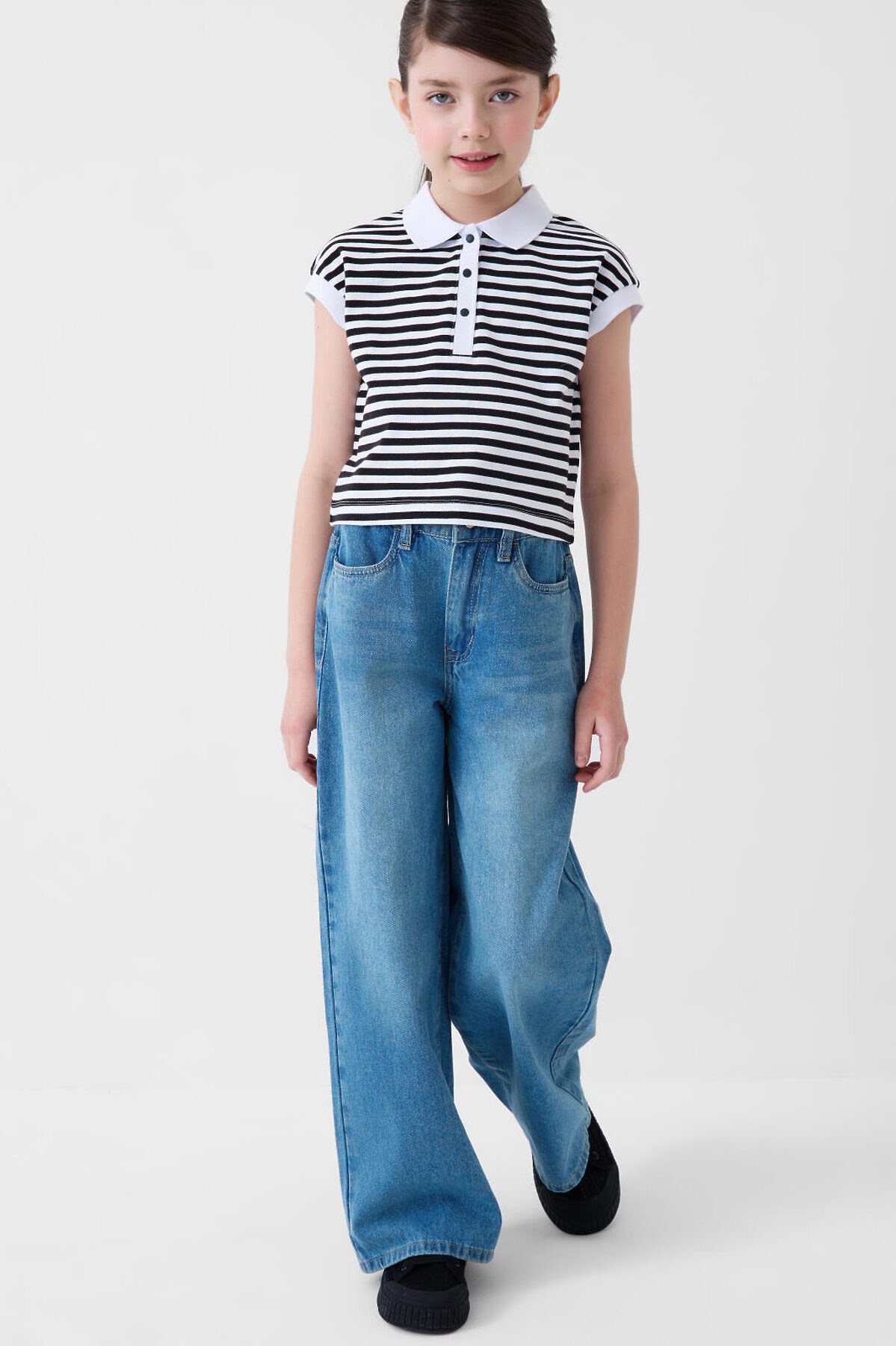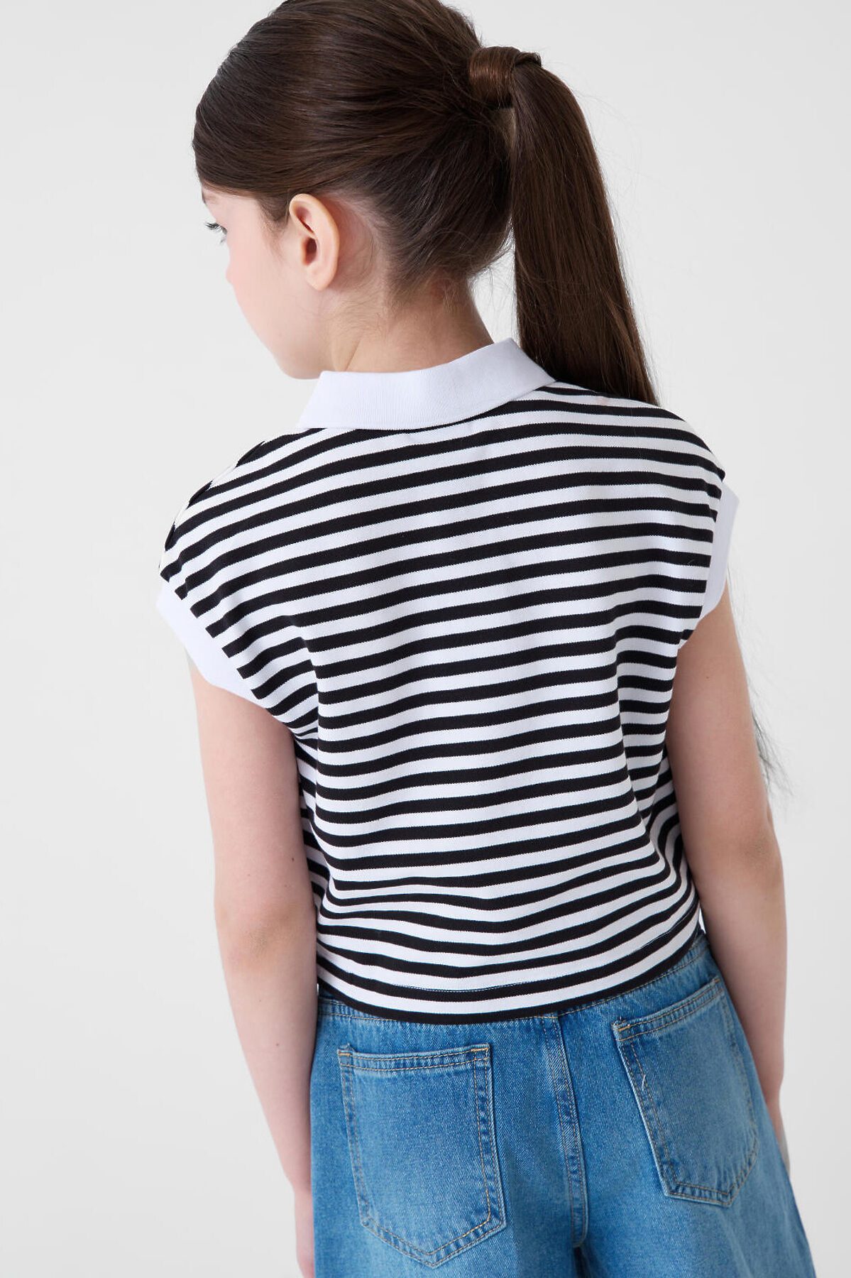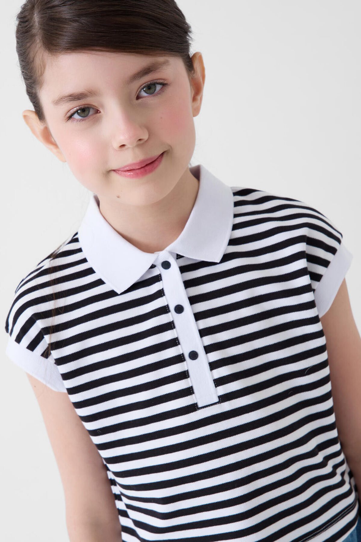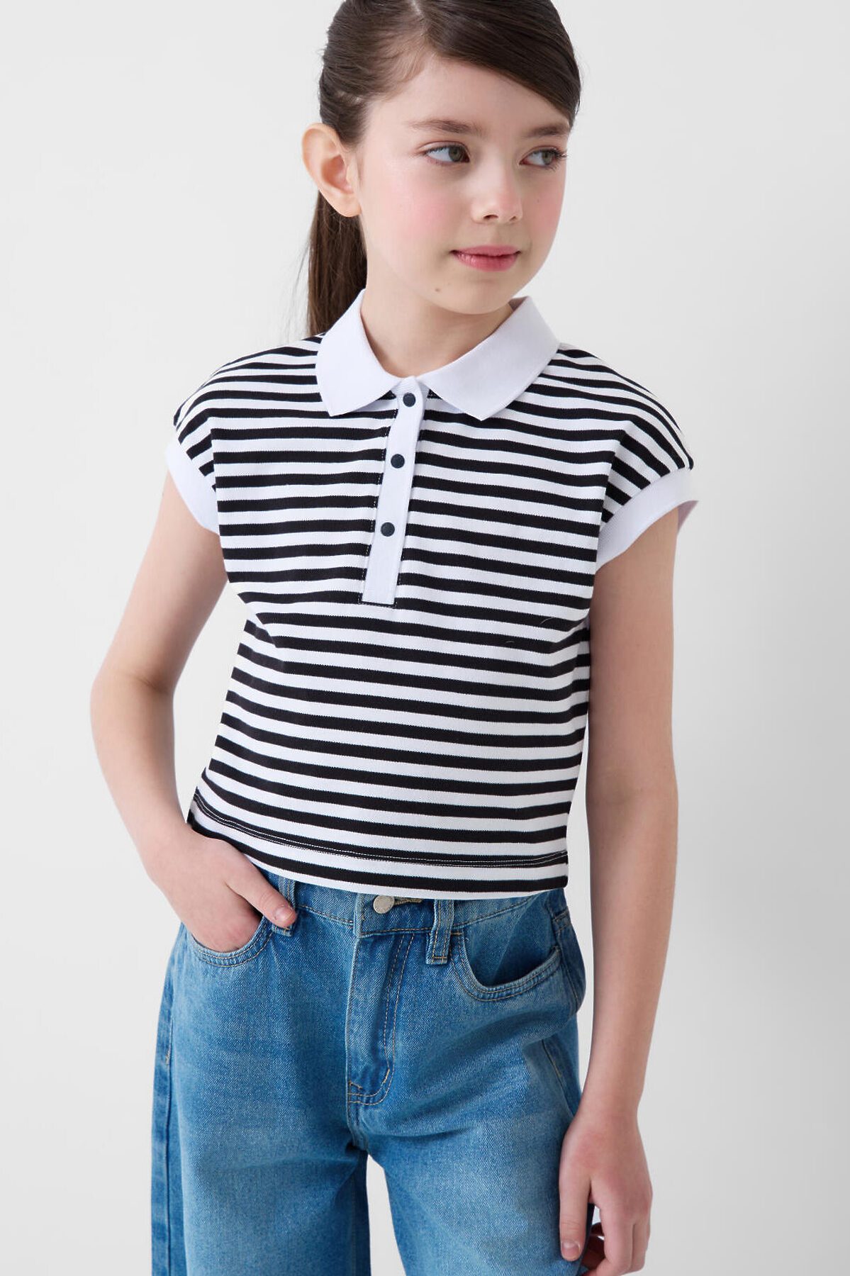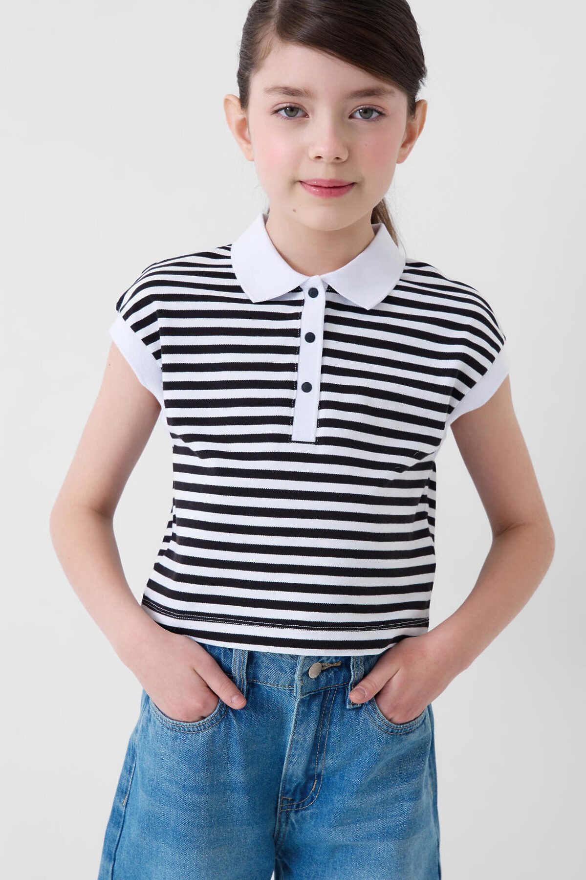 Укороченная футболка-поло в полоску для девочки подростка. Модель прямого кроя, с коротким рукавом, выполненная из хлопкового трикотажа пике. Спереди — застежка на три кнопки. Длина изделия укороченная — до уровня талии.
