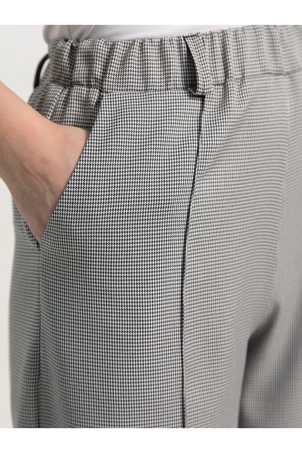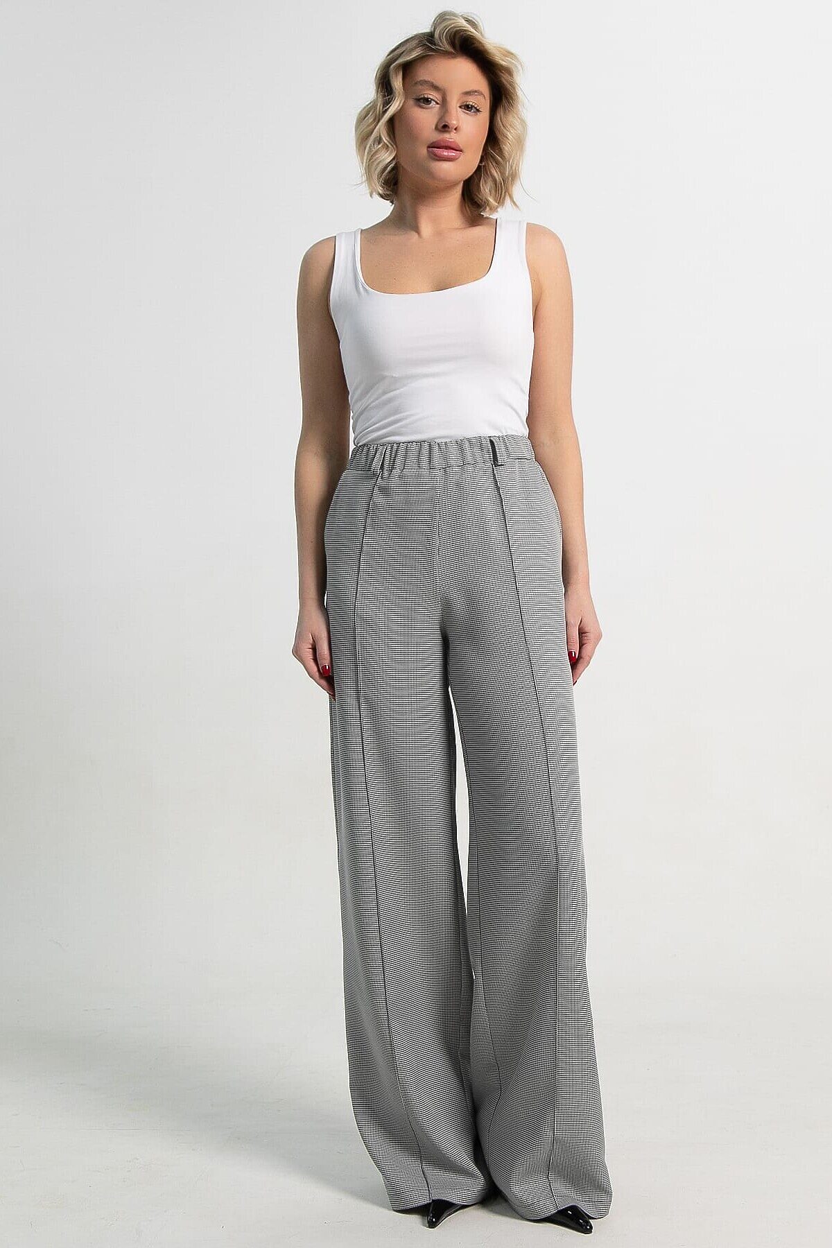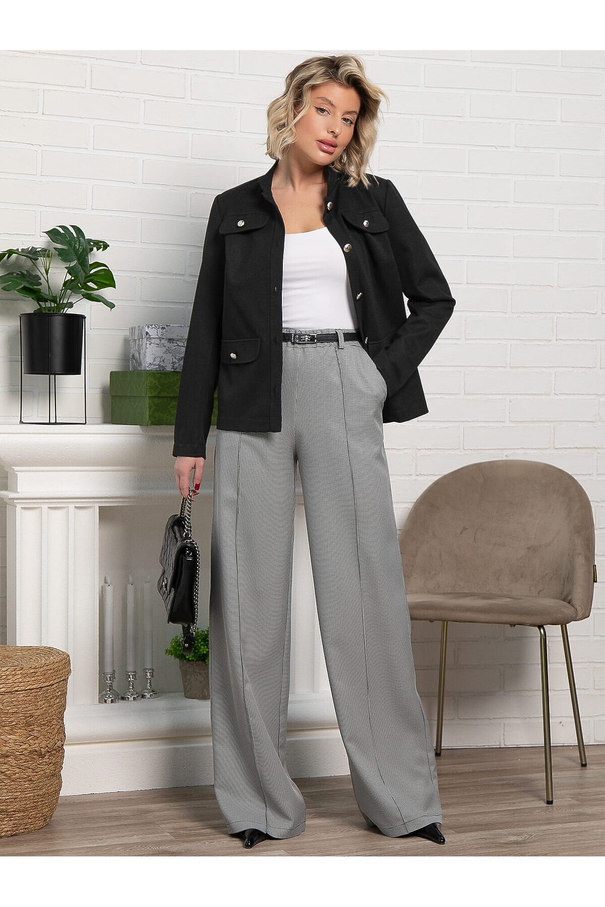 Женские брюки в черно-белом цвете с принтом «гусиная лапка» — стильный и универсальный предмет гардероба. Прямой свободный крой обеспечивает комфорт и свободу движений. По талии резинка. В боковых швах расположены карманы, а по переду — аккуратные стрелки, придающие брюкам элегантный силуэт. Идеально подходят для создания как деловых, так и повседневных образов.