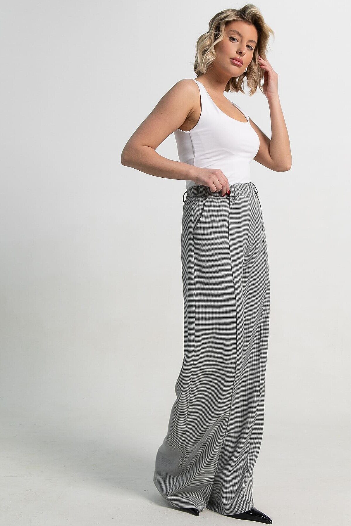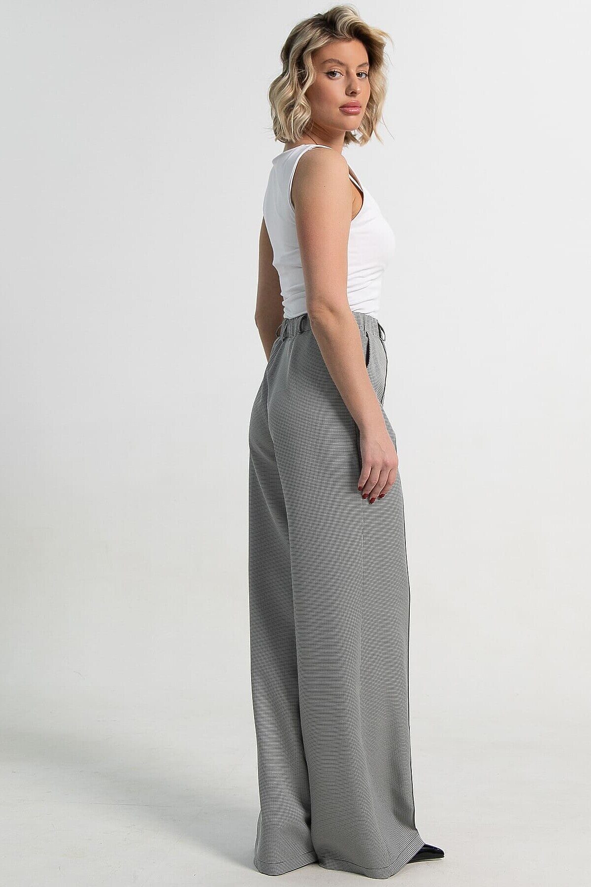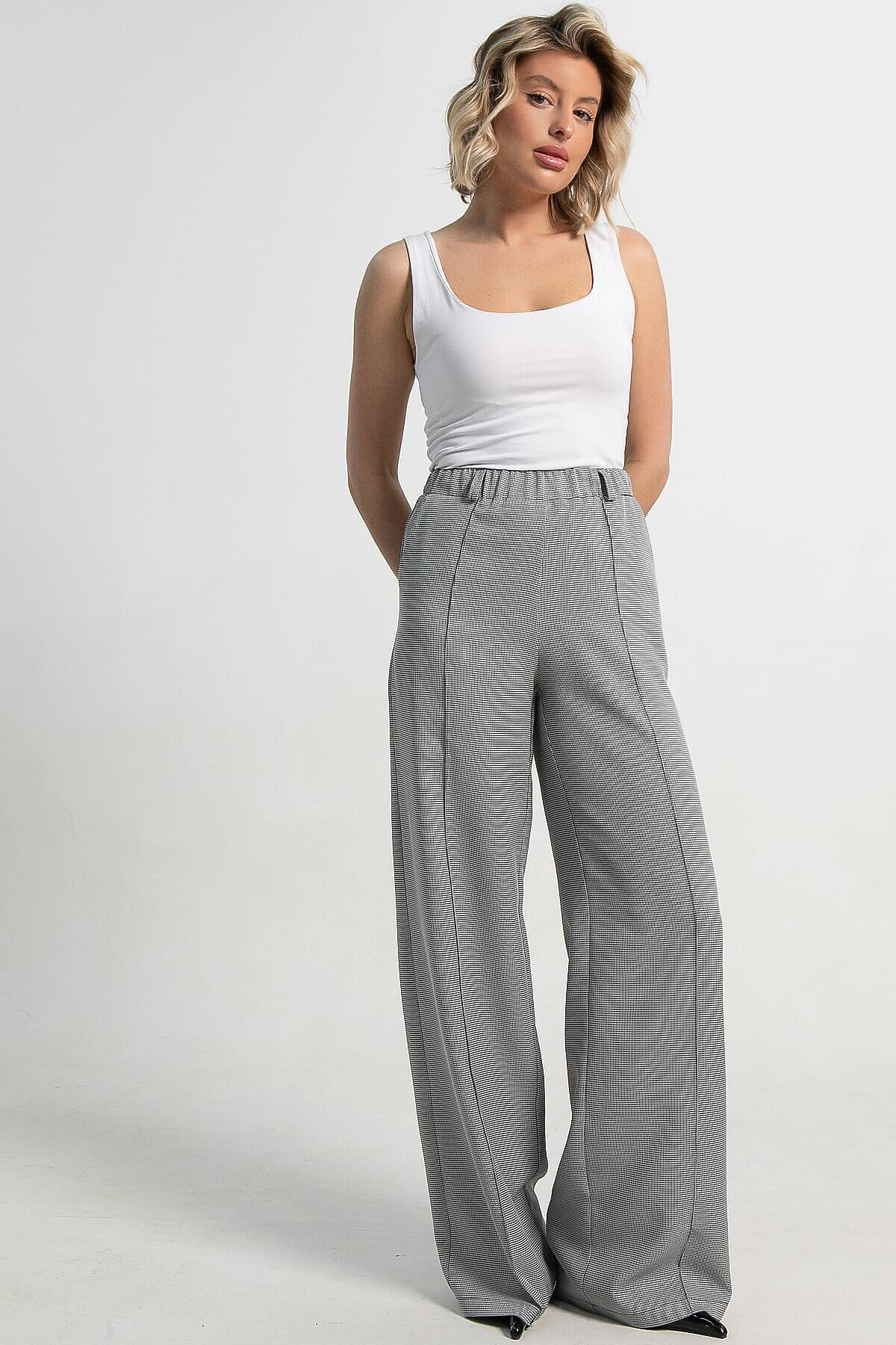 Женские брюки в черно-белом цвете с принтом «гусиная лапка» — стильный и универсальный предмет гардероба. Прямой свободный крой обеспечивает комфорт и свободу движений. По талии резинка. В боковых швах расположены карманы, а по переду — аккуратные стрелки, придающие брюкам элегантный силуэт. Идеально подходят для создания как деловых, так и повседневных образов.