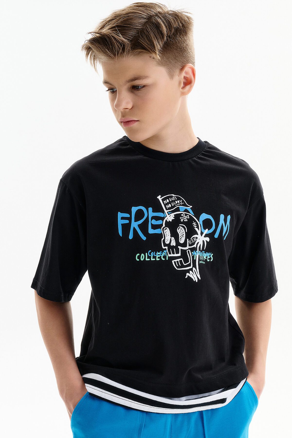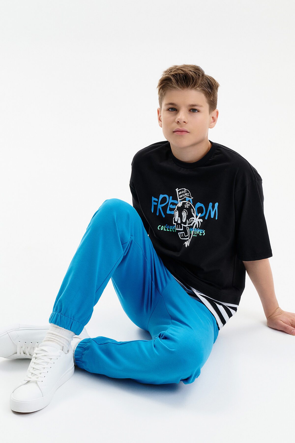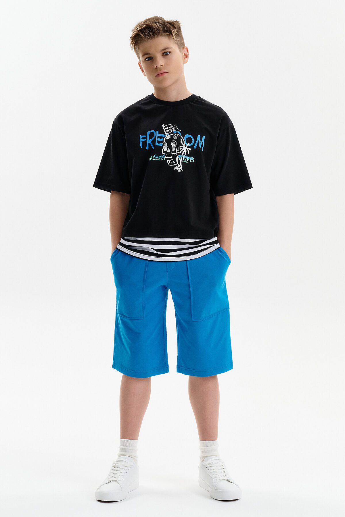 Футболка для мальчика. Комфортная, умеренного оверсайз-объёма со спущенным плечом. Вырез горловины обработан эластичной рибаной (ткань в рубчик) — она отлично держит форму, не растягивается, при этом ребёнку удобно надевать и снимать футболку. Футболка с иммитацией многослойности за счет вставок по низу переда и спинки из материала в полоску. Перевод: Нет смелости — нет славы: Свобода: Коллекционируй приключения: Настоящий.