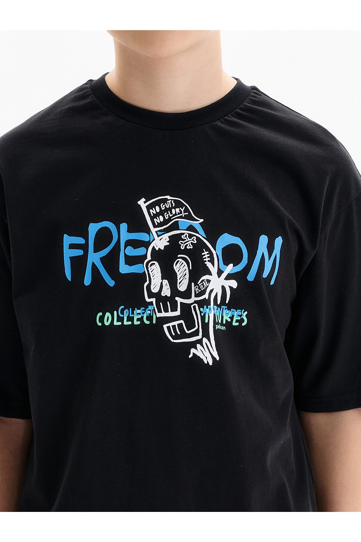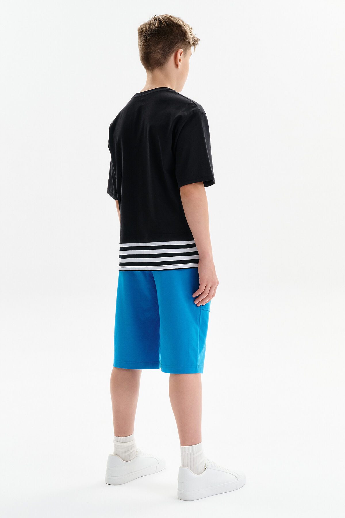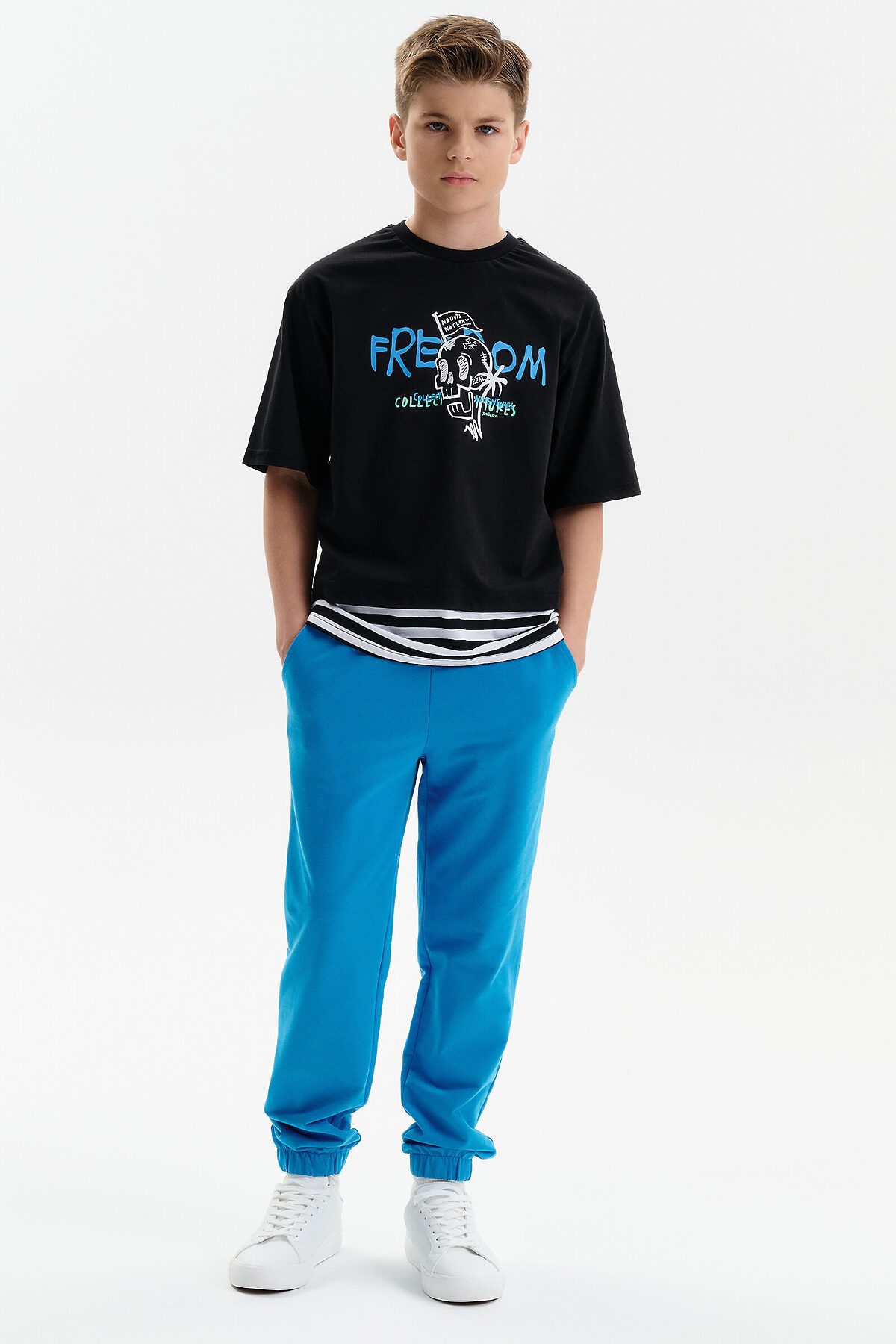 Футболка для мальчика. Комфортная, умеренного оверсайз-объёма со спущенным плечом. Вырез горловины обработан эластичной рибаной (ткань в рубчик) — она отлично держит форму, не растягивается, при этом ребёнку удобно надевать и снимать футболку. Футболка с иммитацией многослойности за счет вставок по низу переда и спинки из материала в полоску. Перевод: Нет смелости — нет славы: Свобода: Коллекционируй приключения: Настоящий.