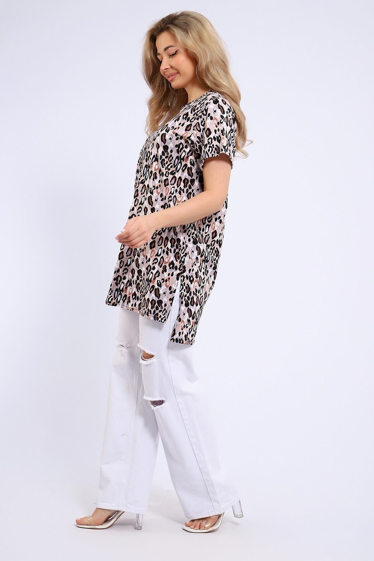 Туника женская свободного кроя выполнена из кулирки 100% хлопок оригинальной расцветки. Спинка удлиненная, по бокам большие разрезы, горловина обработана кантом, низ изделия и рукава подшиты. Туника идеально подойдет как для дома, так и для отдыха.
