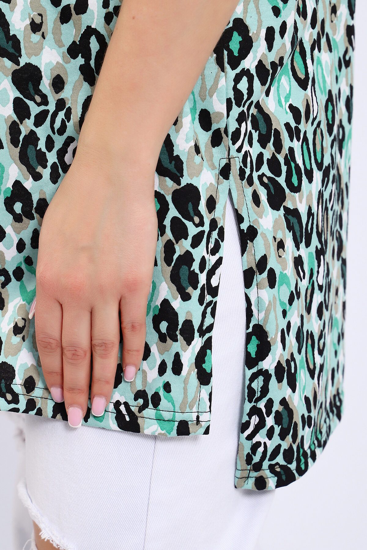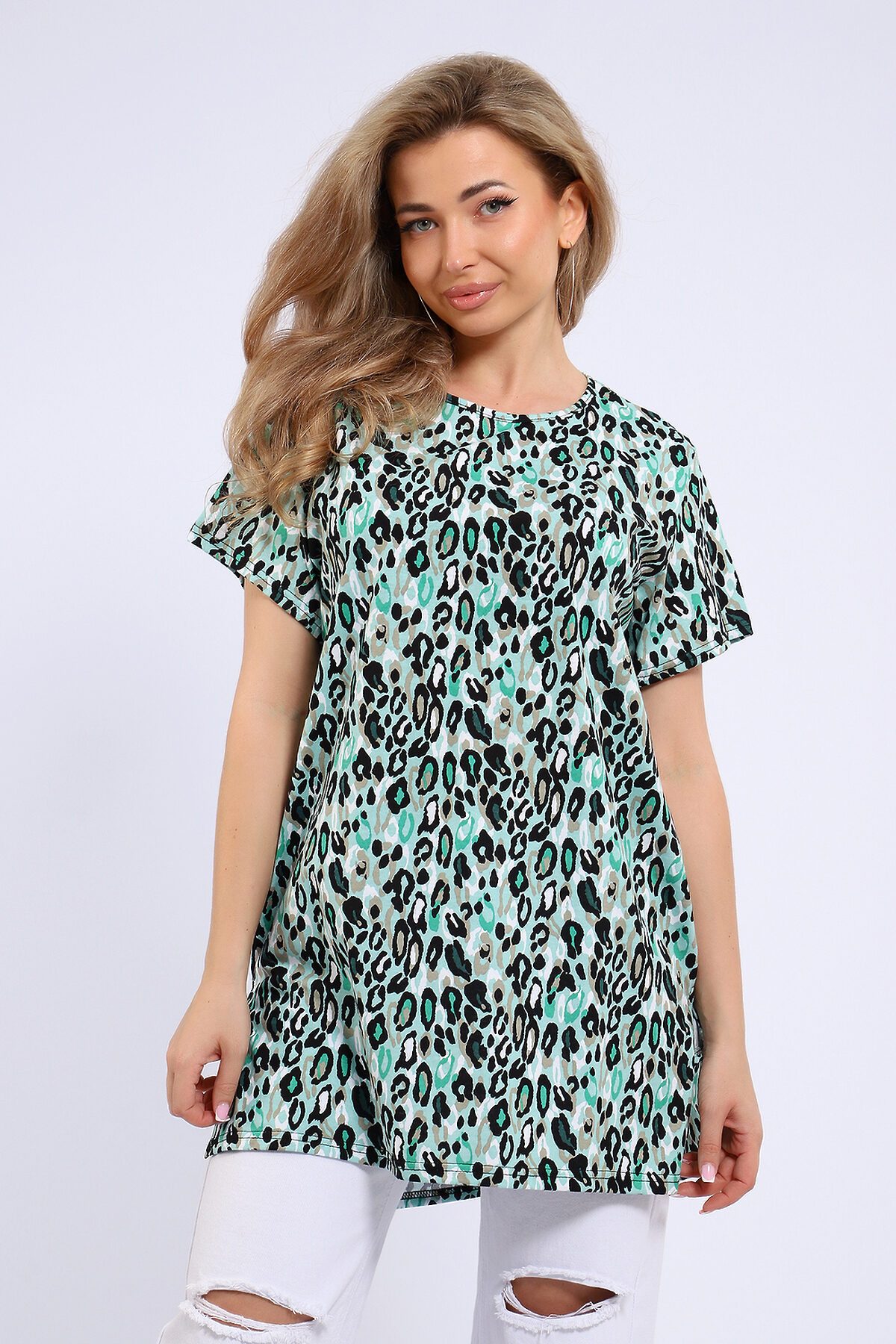 Туника женская свободного кроя выполнена из кулирки 100% хлопок оригинальной расцветки. Спинка удлиненная, по бокам большие разрезы, горловина обработана кантом, низ изделия и рукава подшиты. Туника идеально подойдет как для дома, так и для отдыха.