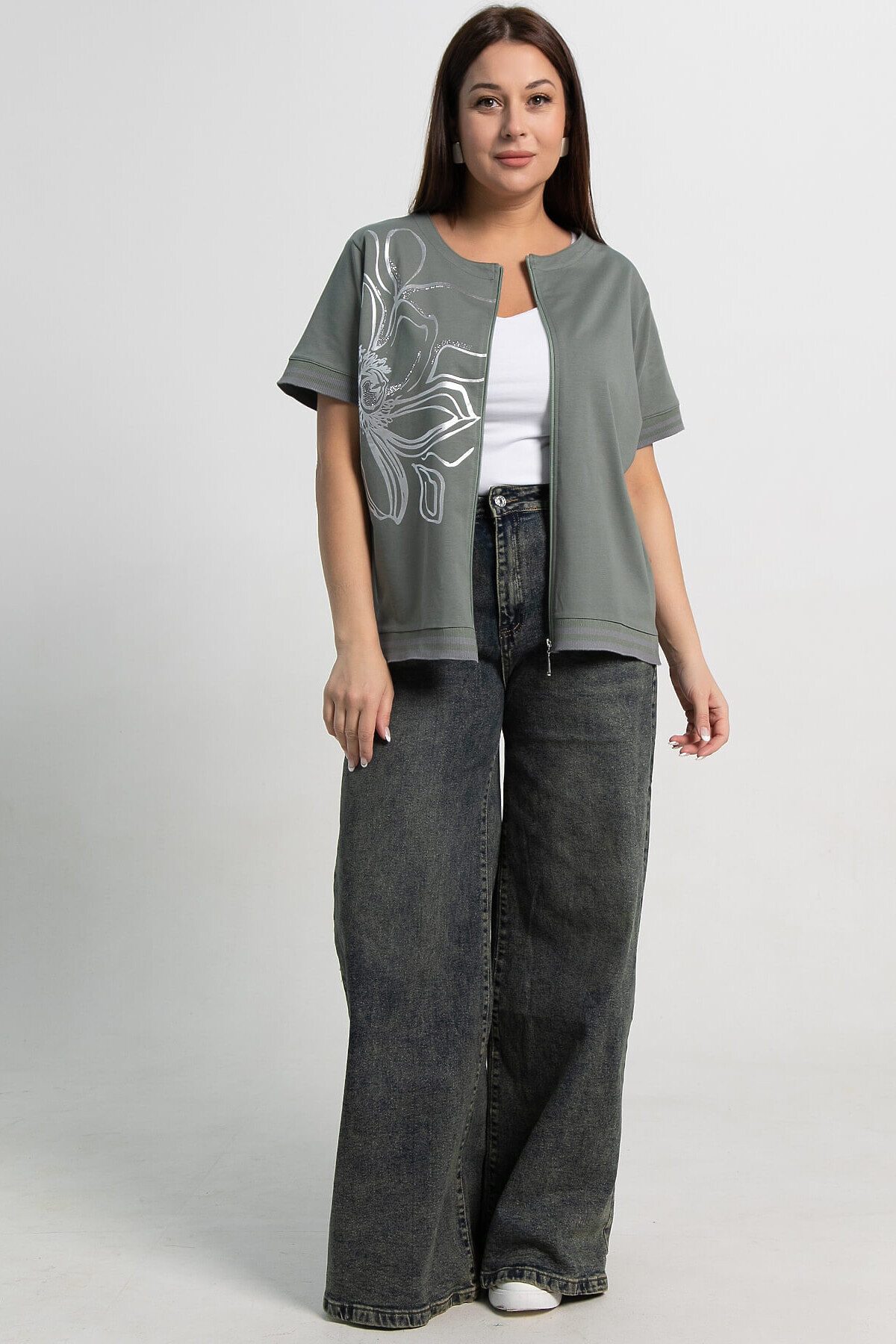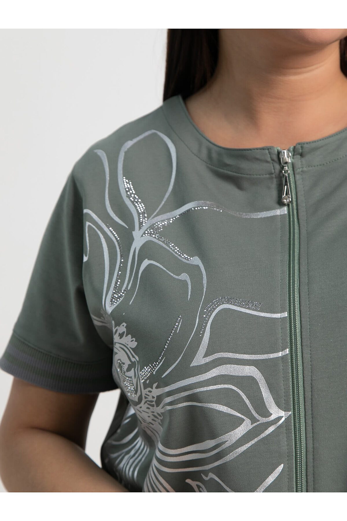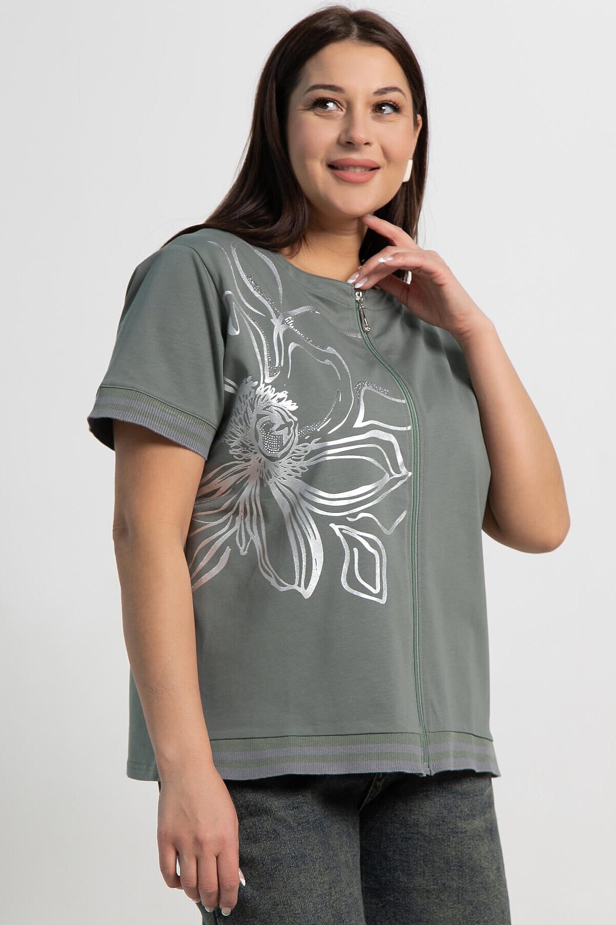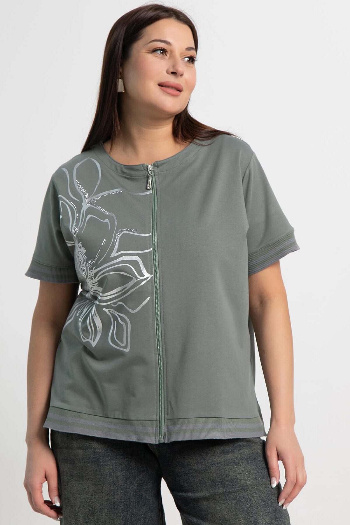 Оливковая блузка с серебристым цветочным принтом и со стразами — воплощение стиля и комфорта в летних тонах. Укороченный рукав делает её идеальной для повседневной носки. Можно носить как самостоятельно, так и в качестве второго слоя поверх топа. Эта блузка прекрасно сочетается с джинсами, брюками и юбками, создавая разнообразные стильные образы. Оригинальный принт и продуманный дизайн подчеркнут вашу индивидуальность.