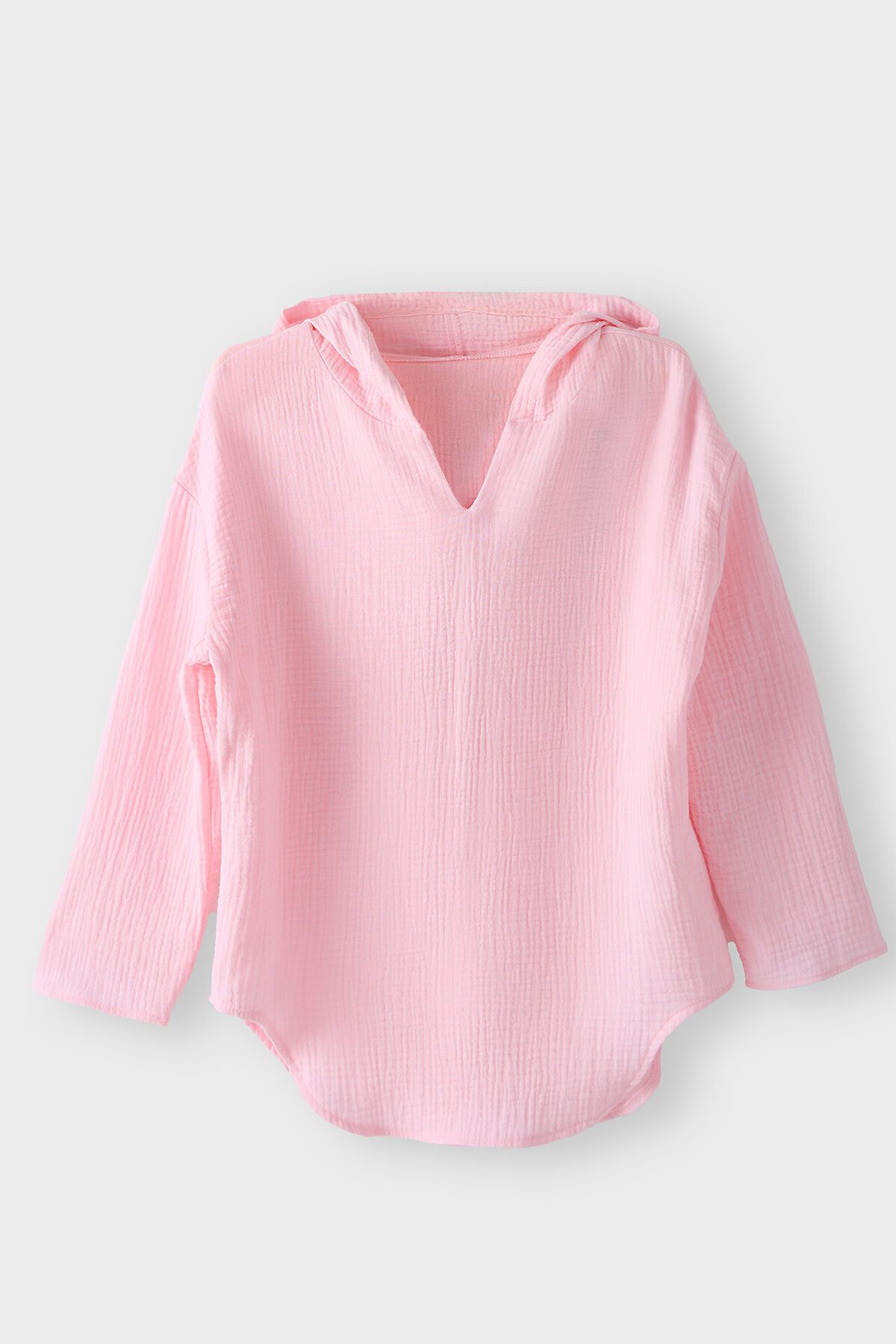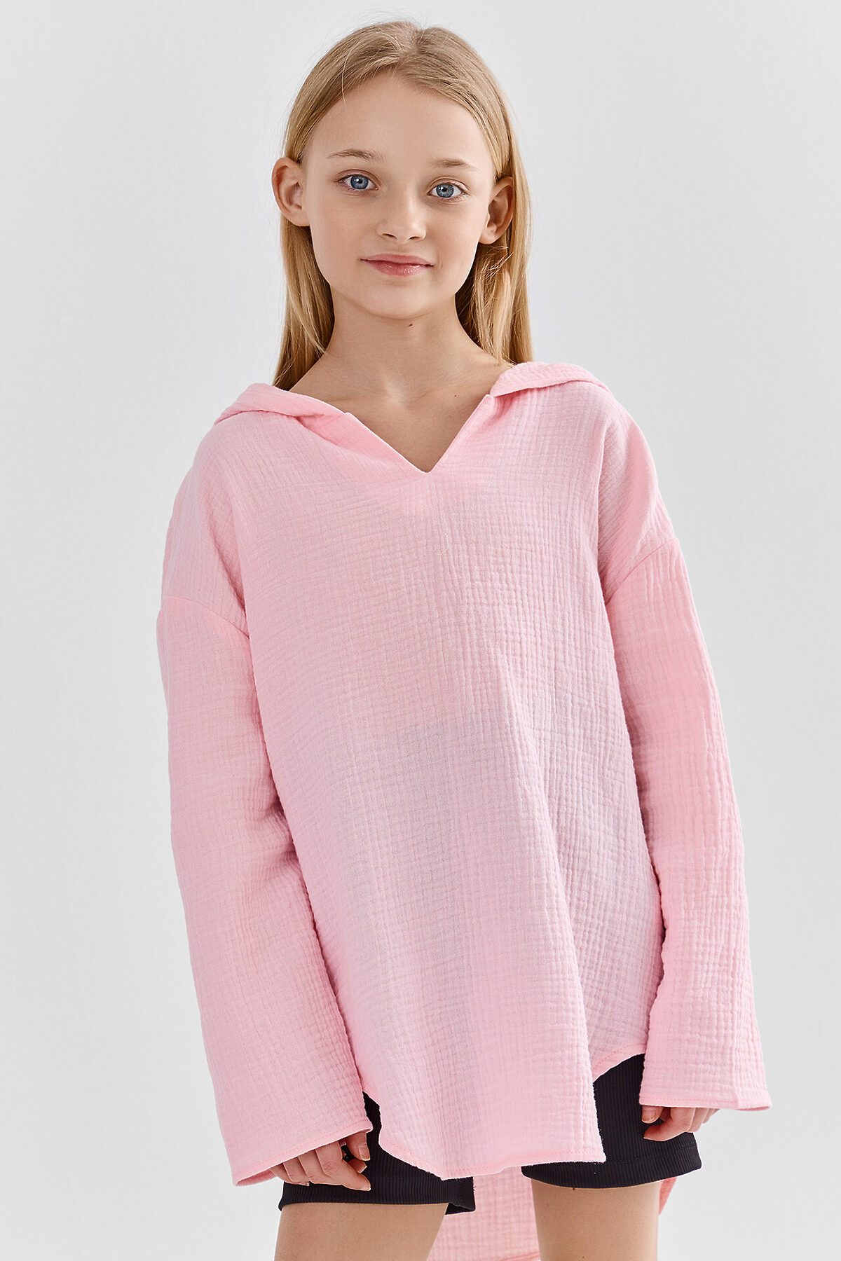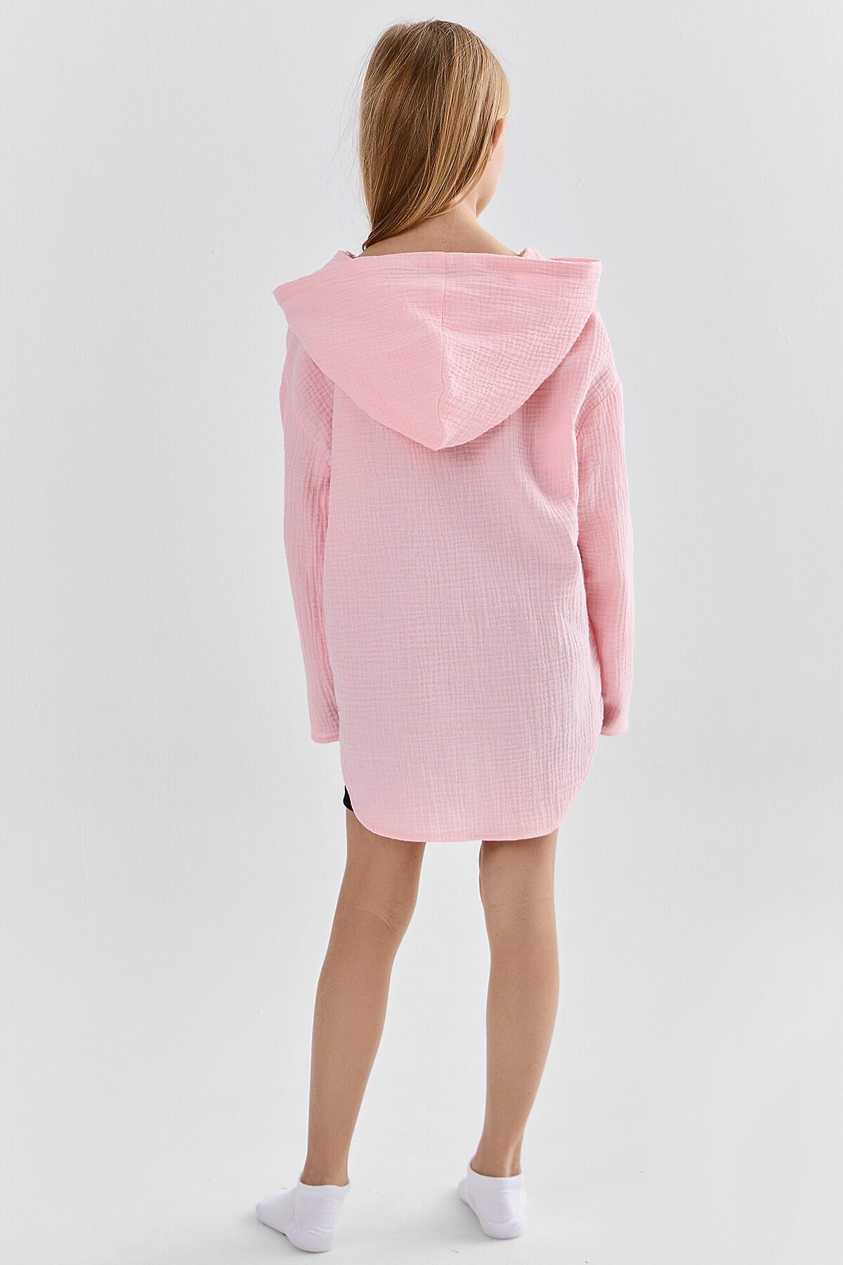 Туника для девочек свободного силуэта с капюшоном, выполнена из муслина. Горловина V-образная. Длина - ниже бедра. Спинка удлиненная. Рукава длинные втачные, линия плеча спущена. Низ изделия и рукавов обработаны в подгибку.