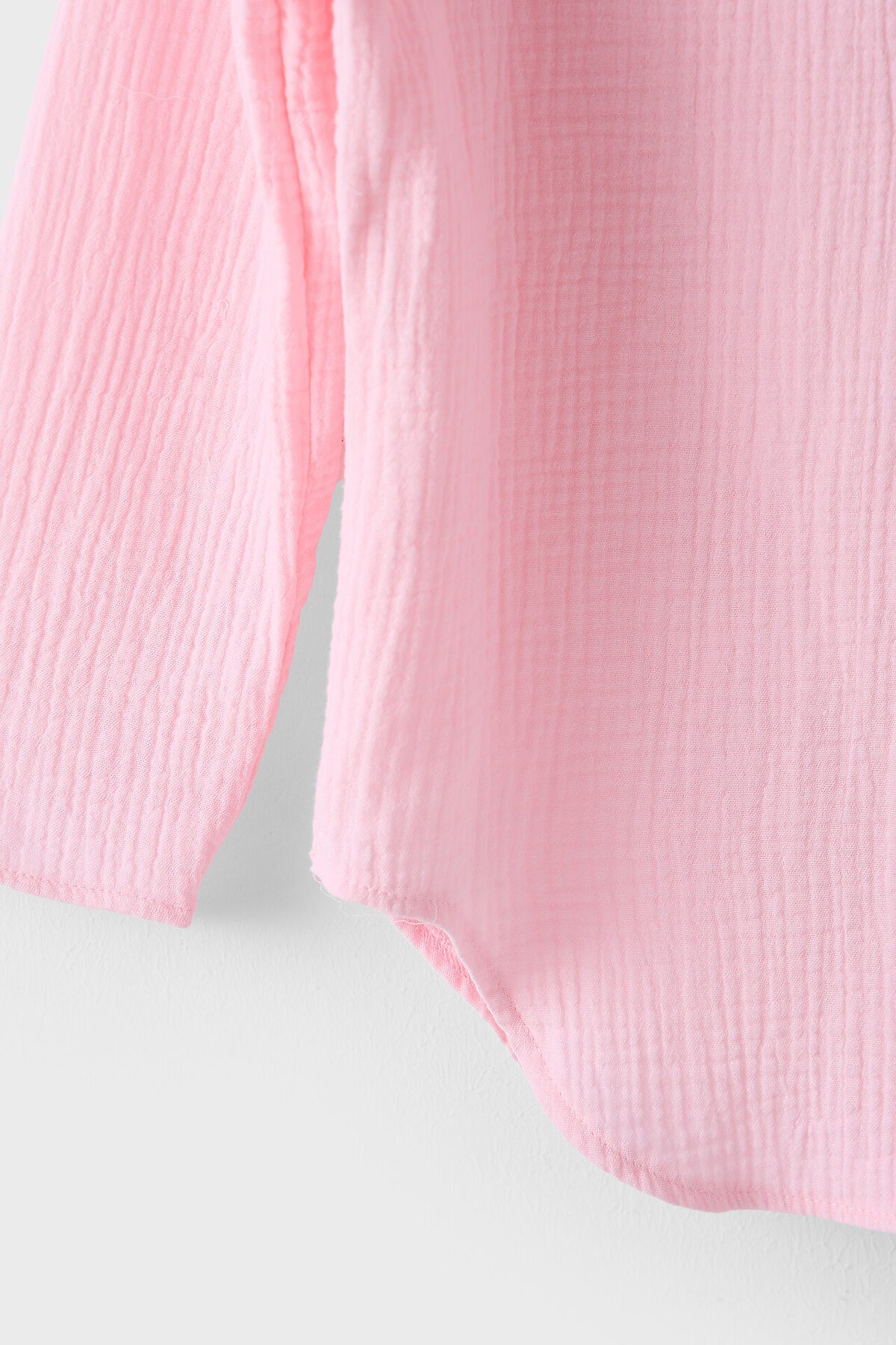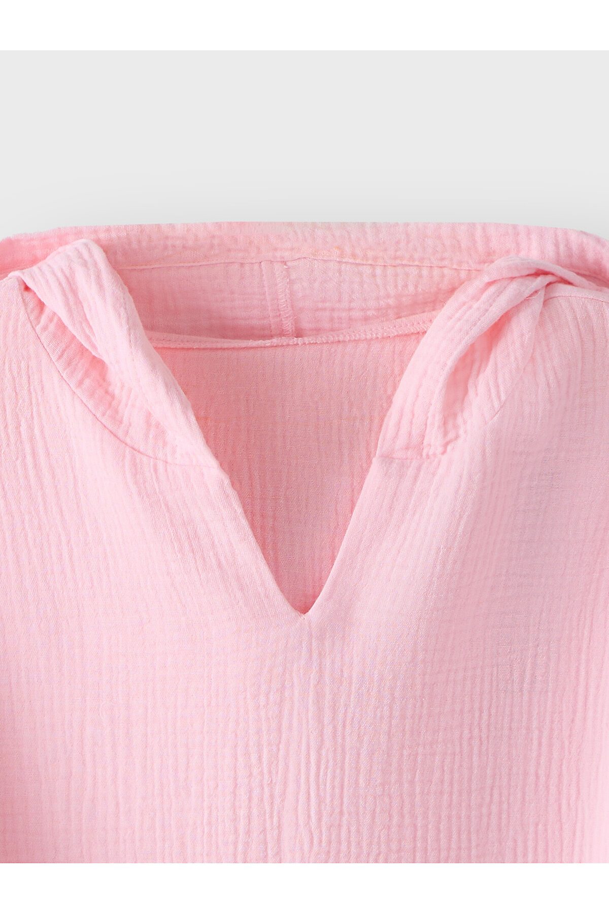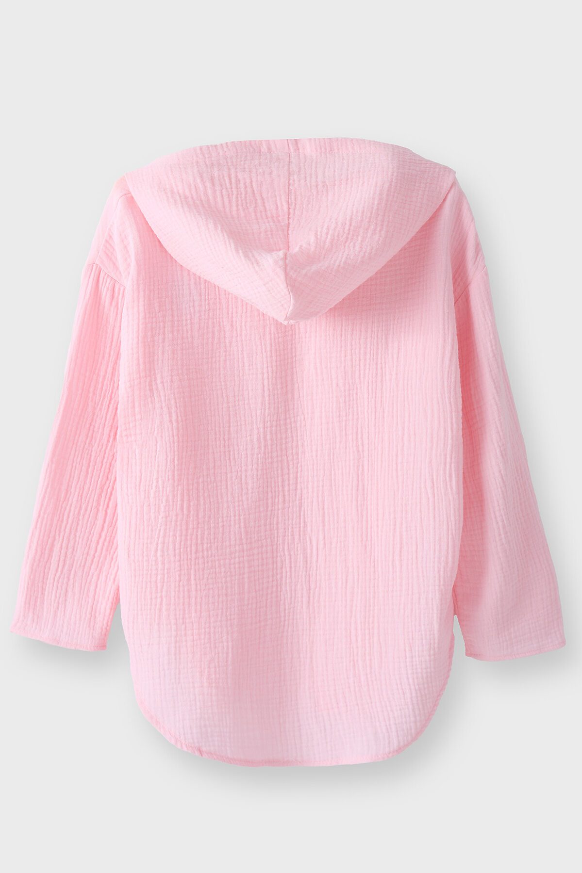 Туника для девочек свободного силуэта с капюшоном, выполнена из муслина. Горловина V-образная. Длина - ниже бедра. Спинка удлиненная. Рукава длинные втачные, линия плеча спущена. Низ изделия и рукавов обработаны в подгибку.