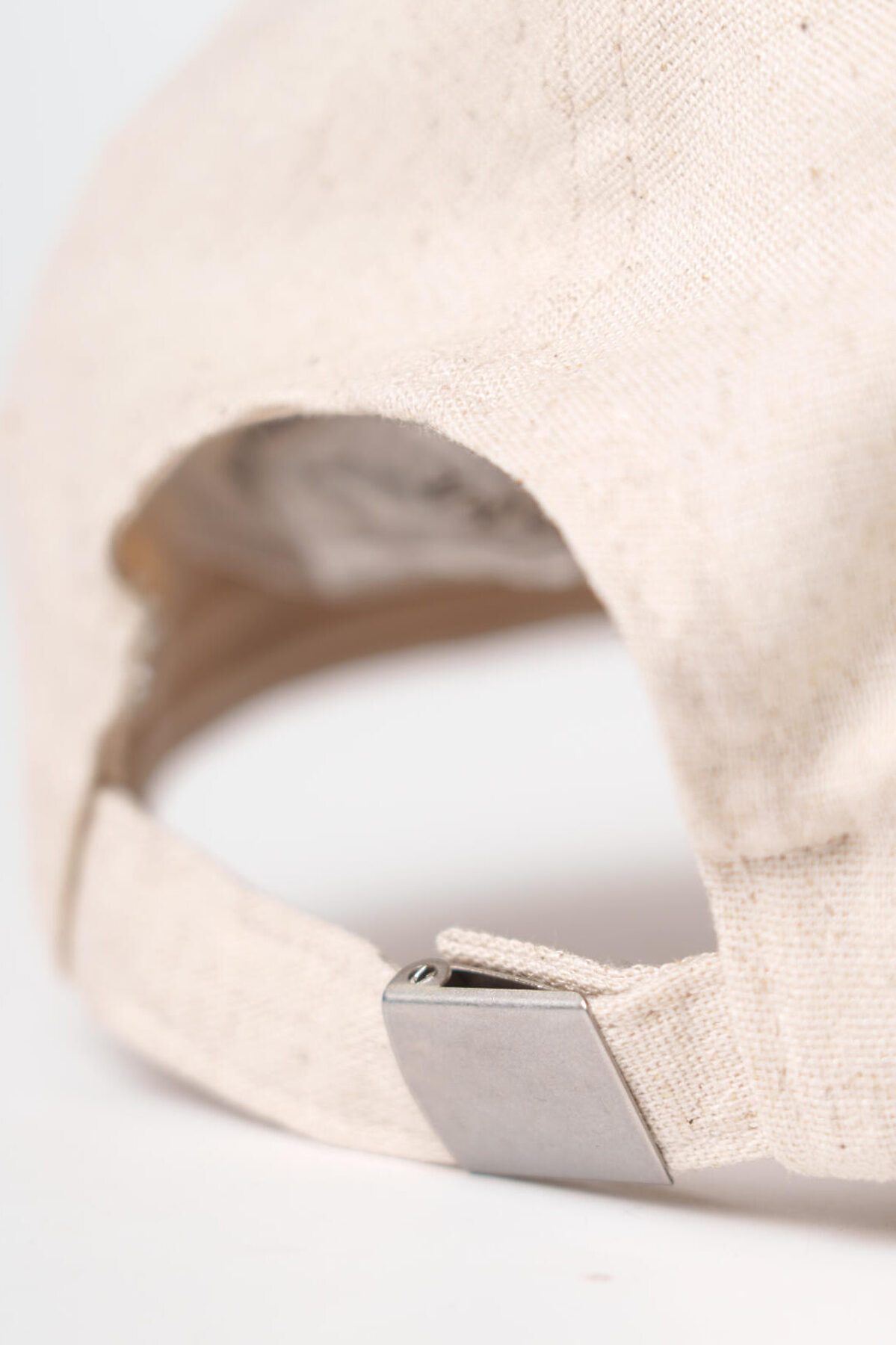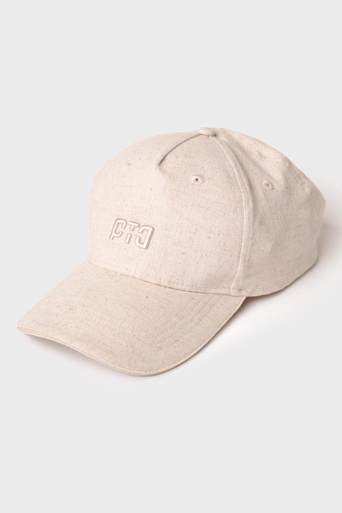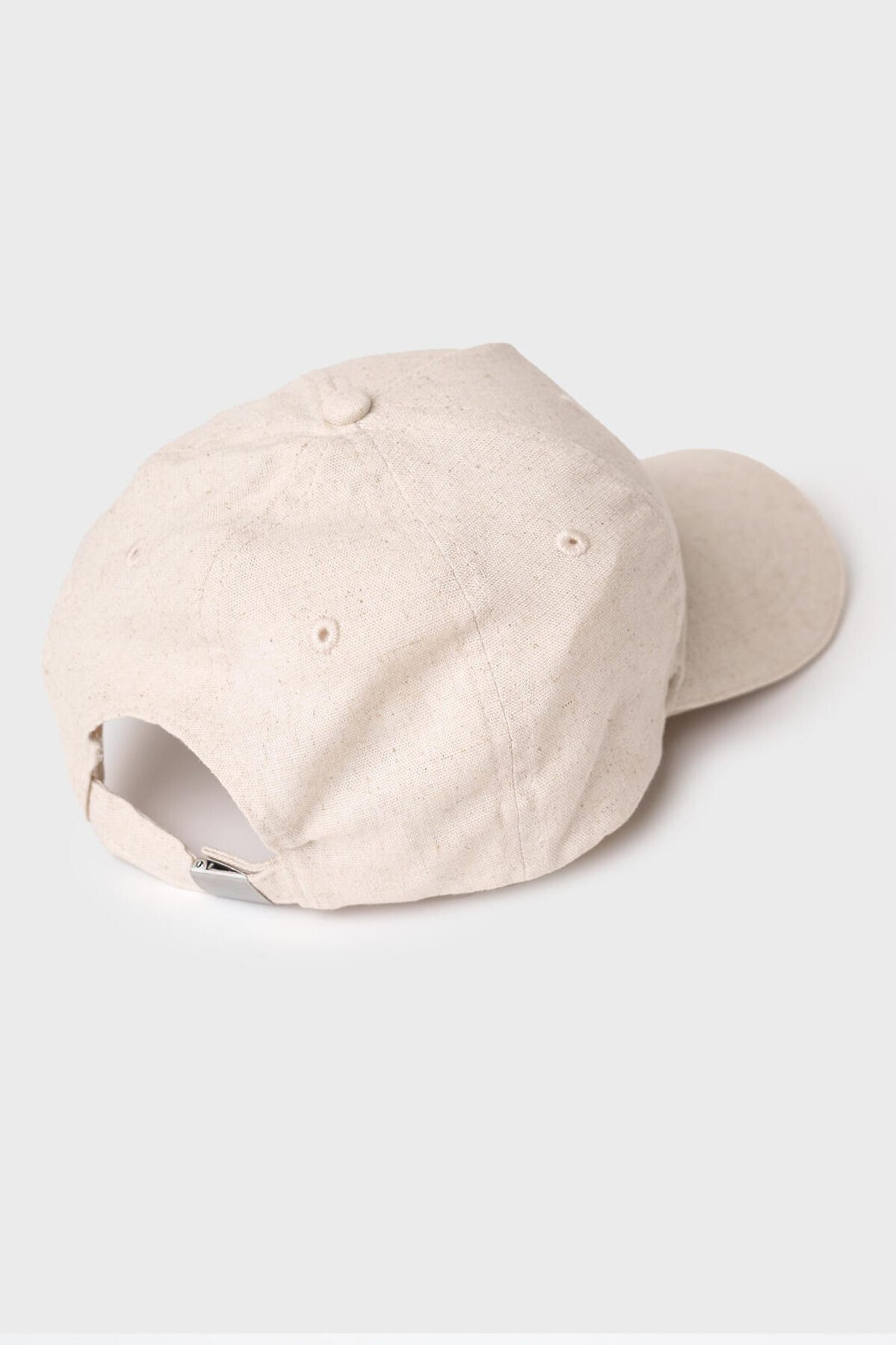 Бейсболка мужская. Модель выполнена из однотонной ткани бежевого цвета и украшена вышивкой. Классическая форма с изогнутым козырьком с контрастным кантом и металлической застёжкой-пряжкой сзади для регулировки размера. Вентиляционные отверстия.