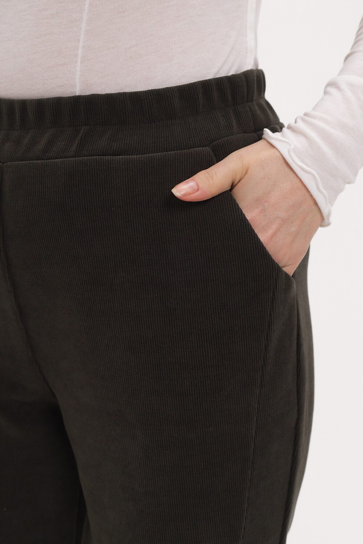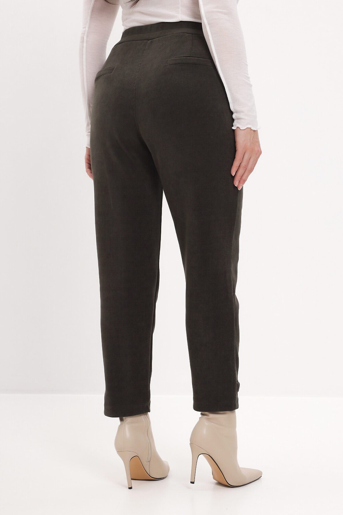 Укороченная модель брюк выполнена из мягкого эластичного вельвета. Пояс на резинке с завышенной линией талии, боковые карманы. По низу изделия декоративные пуговицы. Модель идеально подойдет для любого образа - от классического до спортивного.