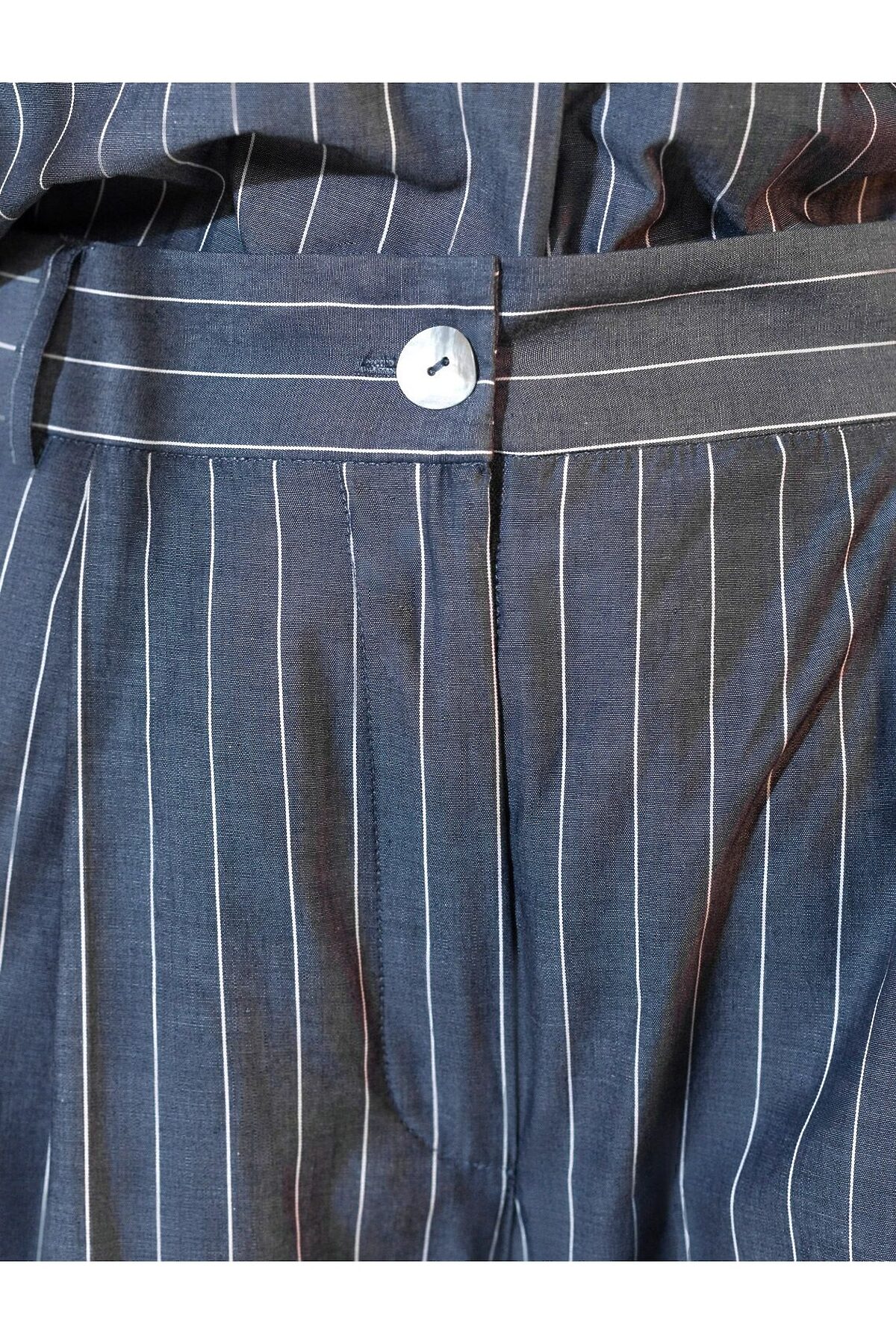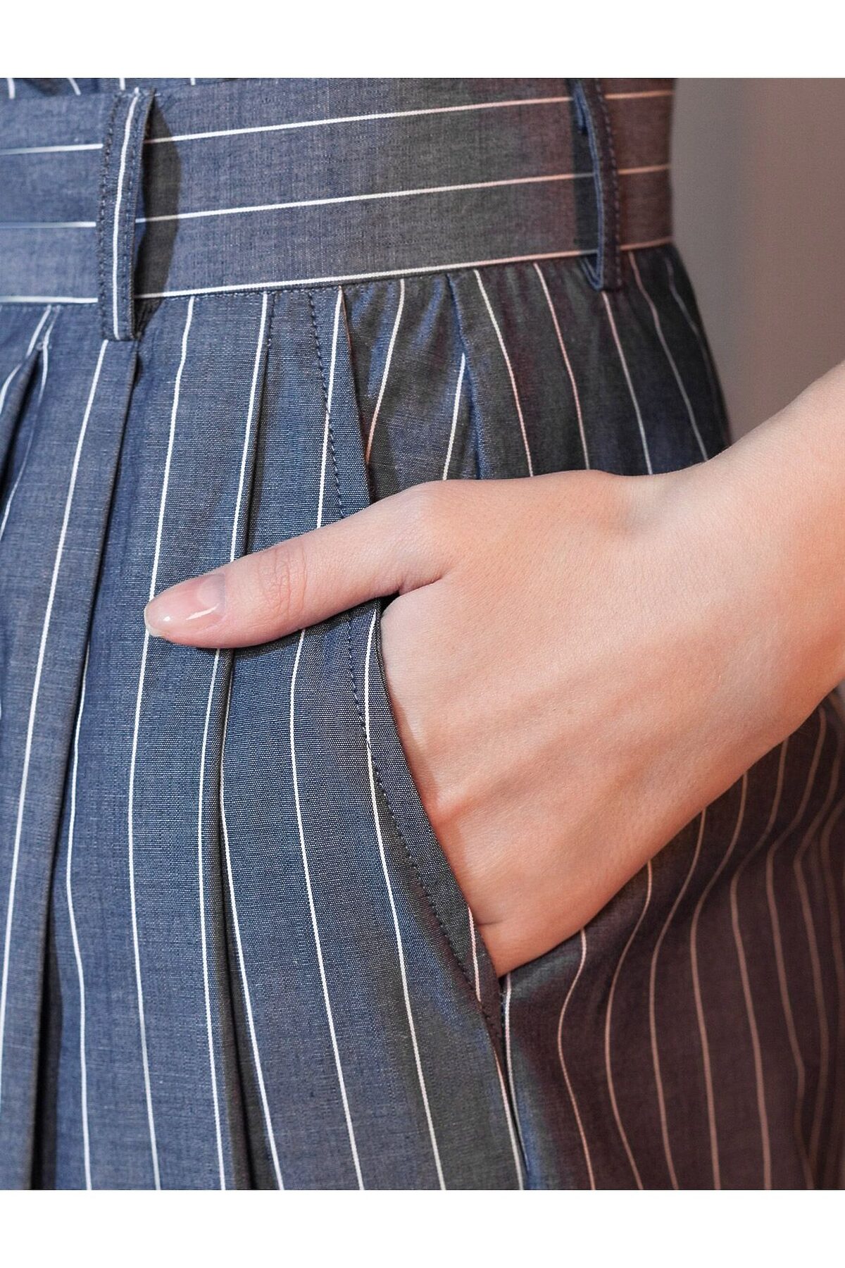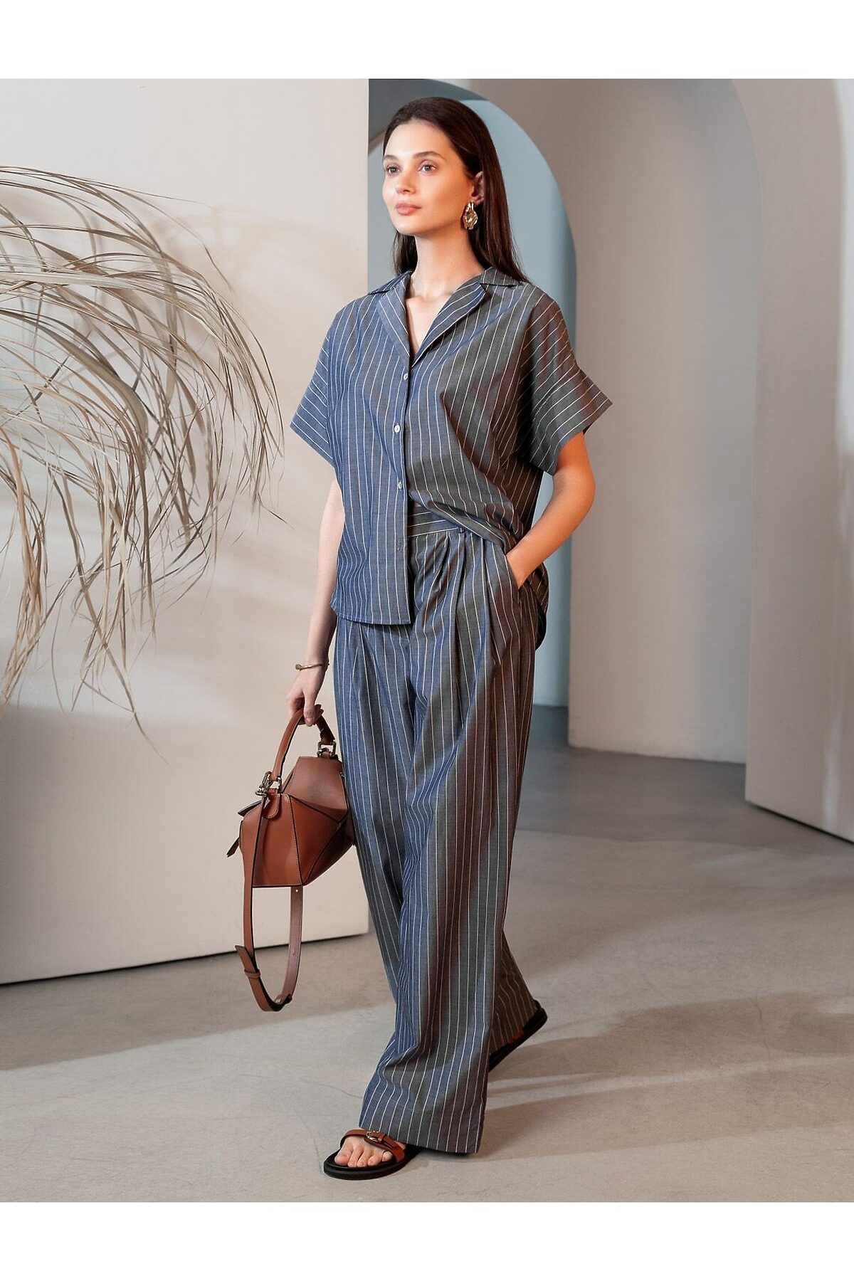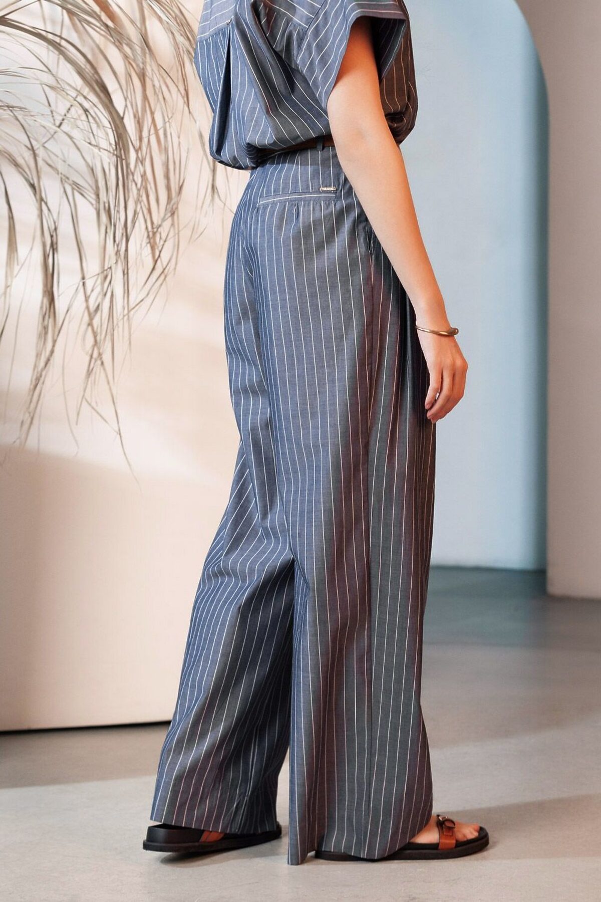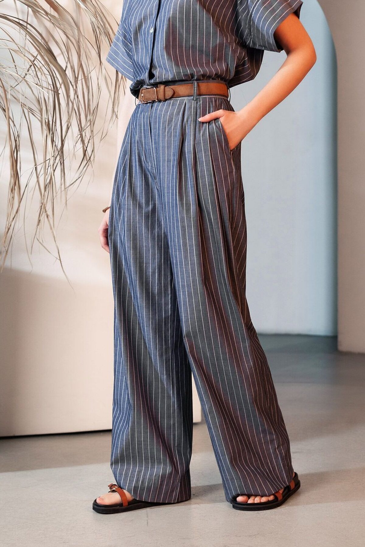 Свободные брюки палаццо серо-синего цвета в полоску из легкого хлопкового поплина плотностью 106 Г/м2— выбор, который легко выделит в любой обстановке. Классические брюки в тонкую полоску создают идеальный силуэт, визуально вытягивают и стройнят фигуру. Принт добавляет динамики и оригинальности даже самым лаконичным комплектам, делая этот предмет гардероба настоящим хитом сезона. Натуральный состав ткани обладает высокой воздухопроницаемостью, а также способностью поглощать и отдавать влагу. В повседневных брюках будет очень комфортно, благодаря правильной регуляции температуры тела. Брюки подходят на маленький и высокий рост, а так же на любую фигуру, позволяя подчеркнуть достоинства и скрыть возможные недостатки. С палаццо на высокой посадке вы можете создать различные образы, от делового шика до повседневного кэжуал, главное правило — баланс объемов , т.е. менее свободный верх к широкому низу, заправлять верх или выбирать укороченные модели. Полоска добавляет графичности, поэтому отлично сочетается с монохромным верхом для вытягивания силуэта или контрастными цветами. С этими стильными брюками можно создавать эффектные наряды как на выход, так и для ежедневных рабочих дел или простых прогулок. Рекомендуем сочетать с артикулами; D29.340, D27.003