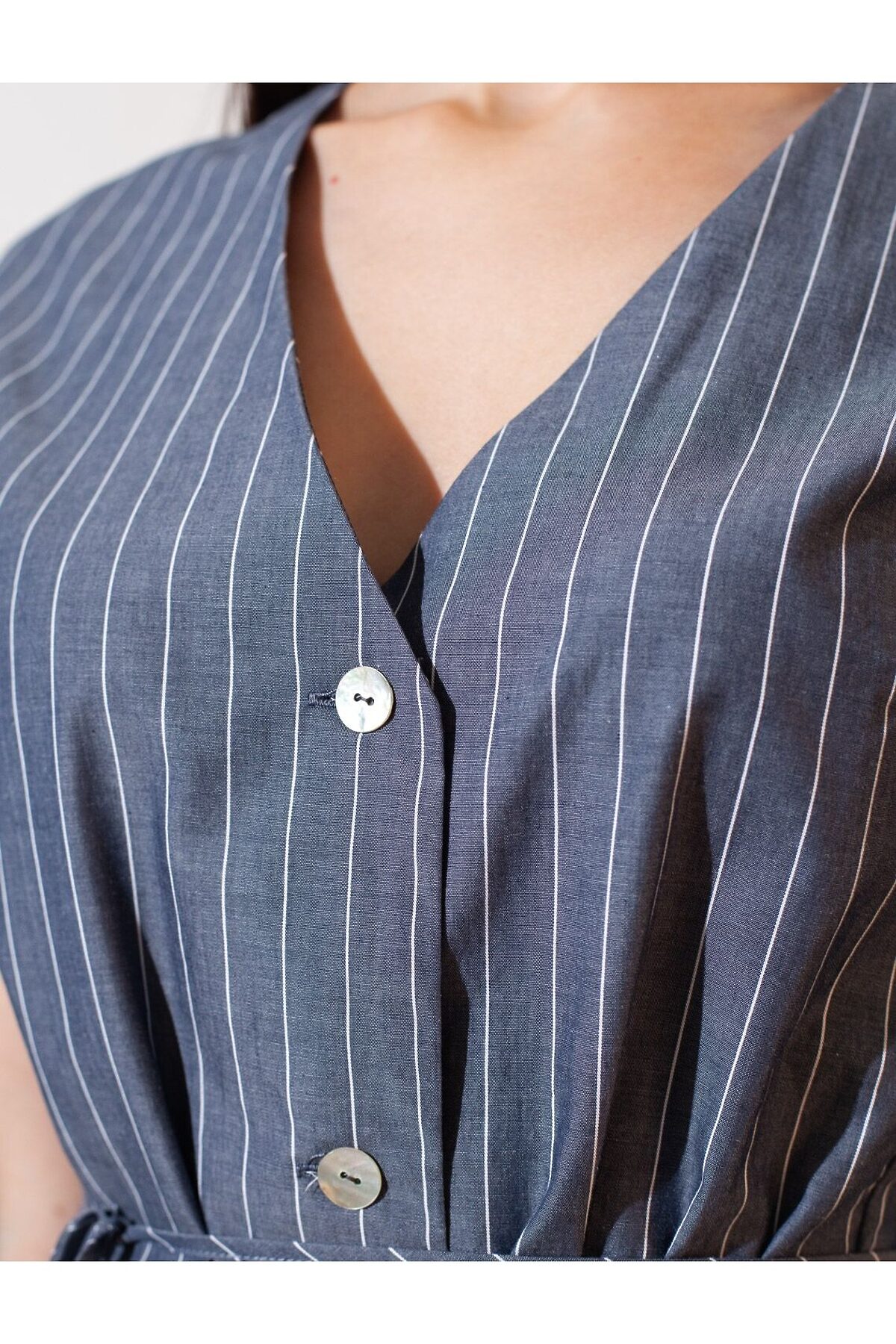 Эффектный удлиненный жилет серо-синего цвета в полоску выполнен из легкого хлопкового поплина плотностью 106 Г/м2. Стильный фасон и легкий материал делают эту жилетку идеальным вариантом для лета и межсезонья. Пояс мягко акцентирует талию, красиво подчеркивая силуэт и корректирует пропорции. Вертикальная полоска визуально вытягивает фигуру и скрывает недостатки, а крой плавно повторяет контуры тела, сохраняя свободу движения. Благодаря продуманному крою она сидит идеально на разных фигурах, в том числе и на больших размерах. Натуральный состав ткани обладает высокой воздухопроницаемостью, а также способностью поглощать и отдавать влагу. В жилетке будет очень комфортно, благодаря правильной регуляции температуры тела.Такой жилет помогает создать актуальный и функциональный летний гардероб: он превосходно сочетается с разными низами, мгновенно преображая любой аутфит. Рекомендуем сочетать с артикулами: D24.298, D26.207