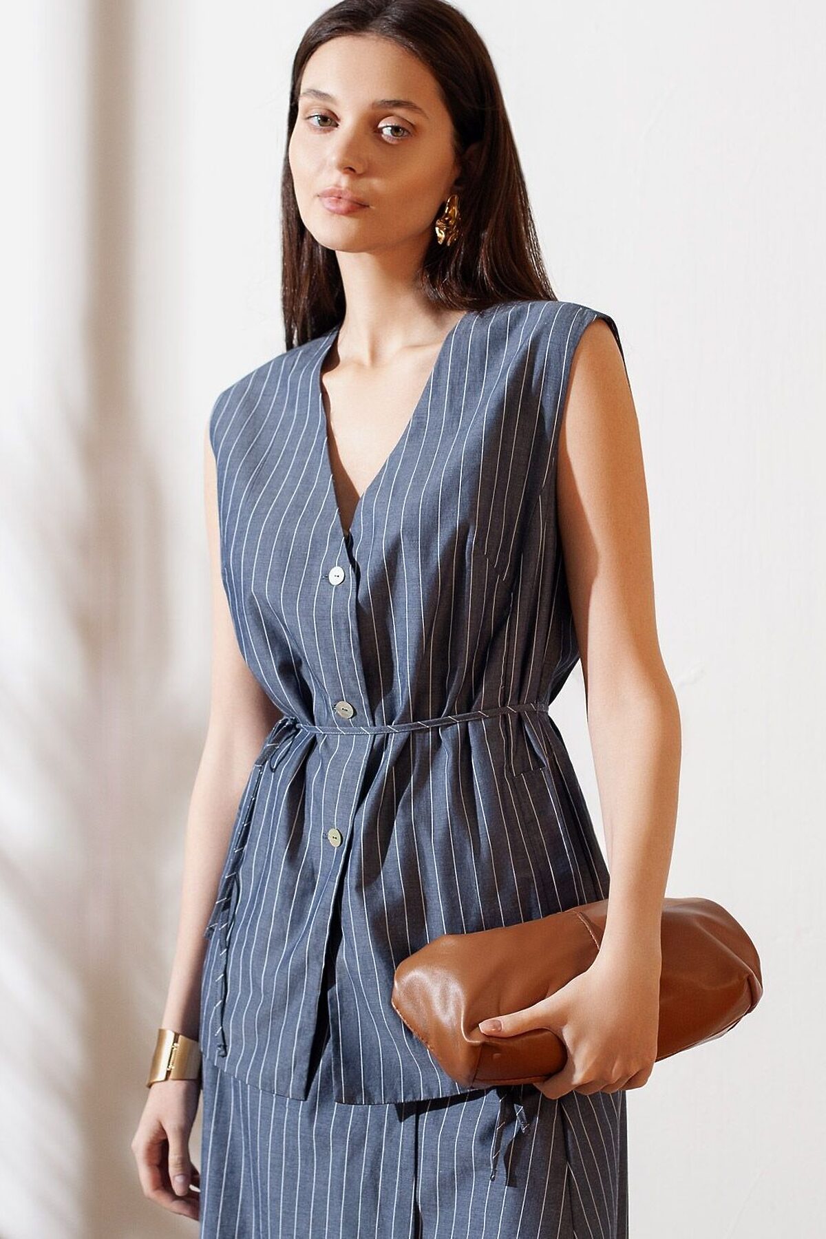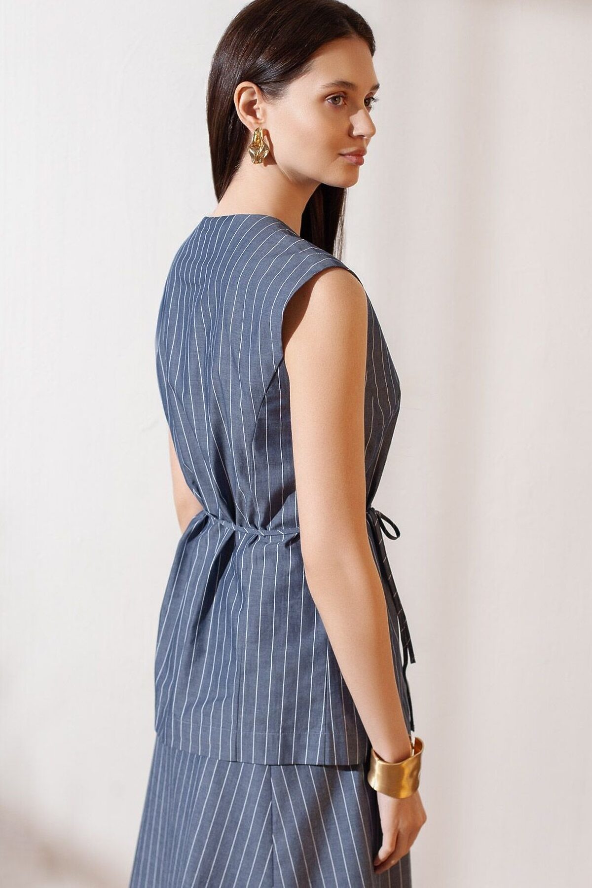 Удлиненный костюмный жилет в полоску с поясом из легкого хлопкового поплина VILATTE, серо-синий