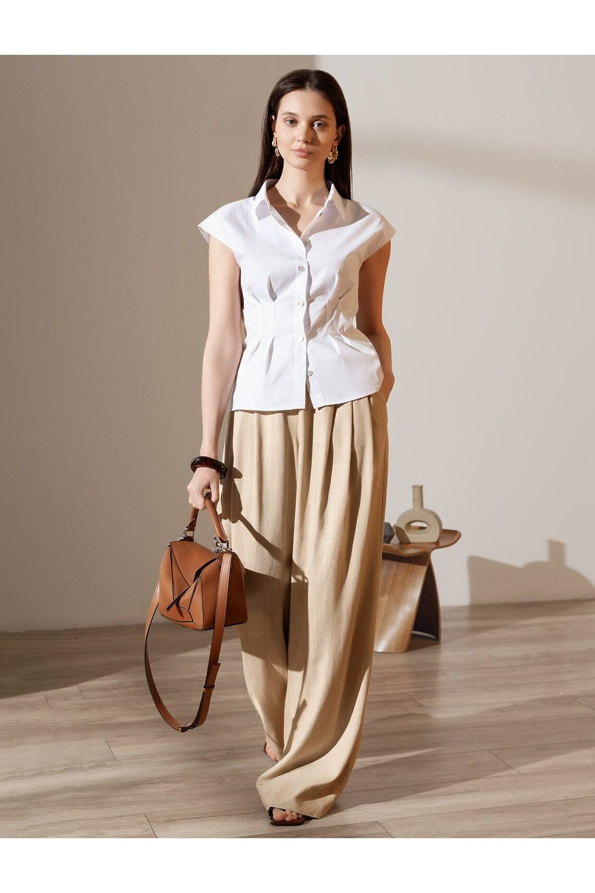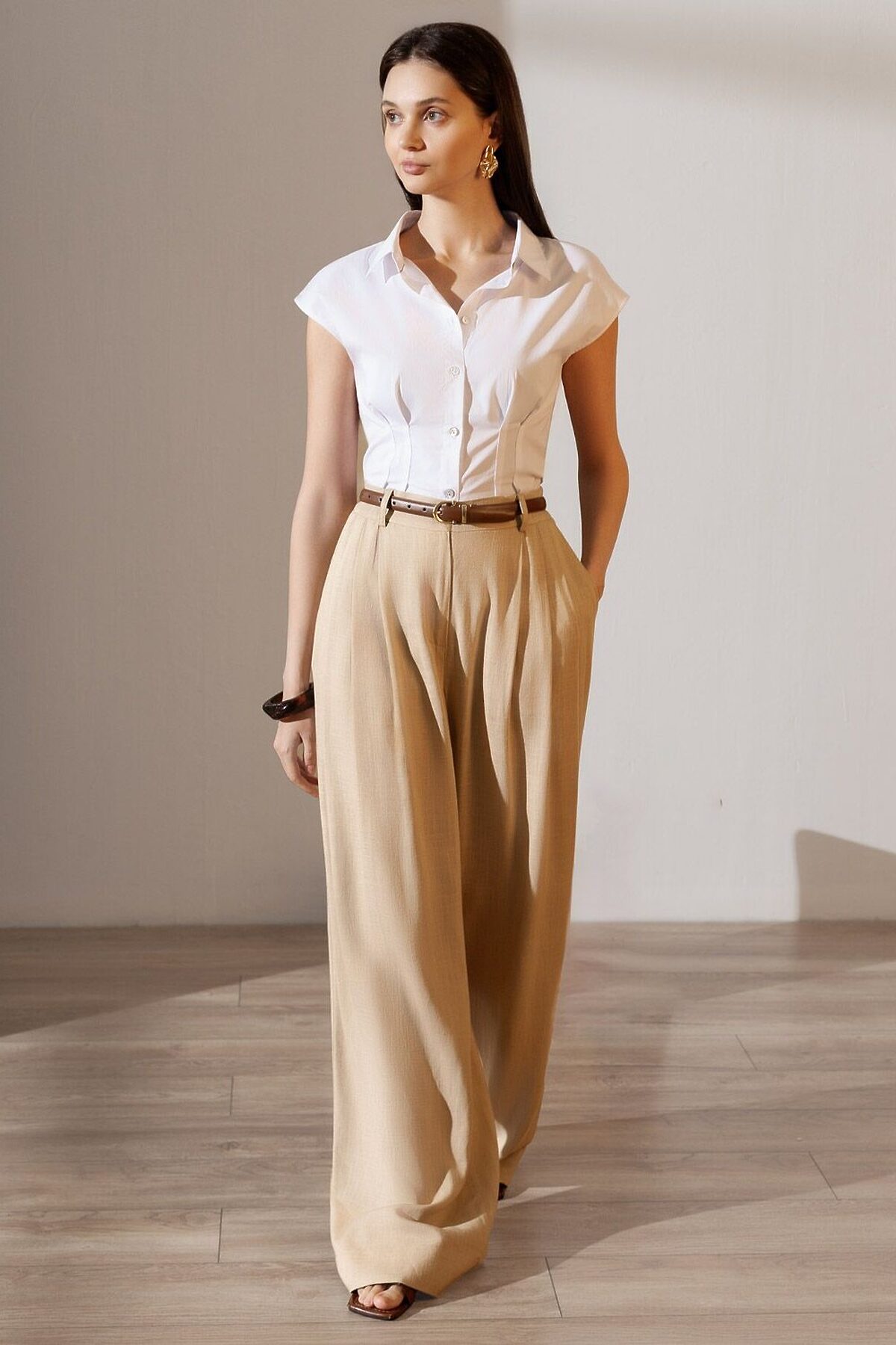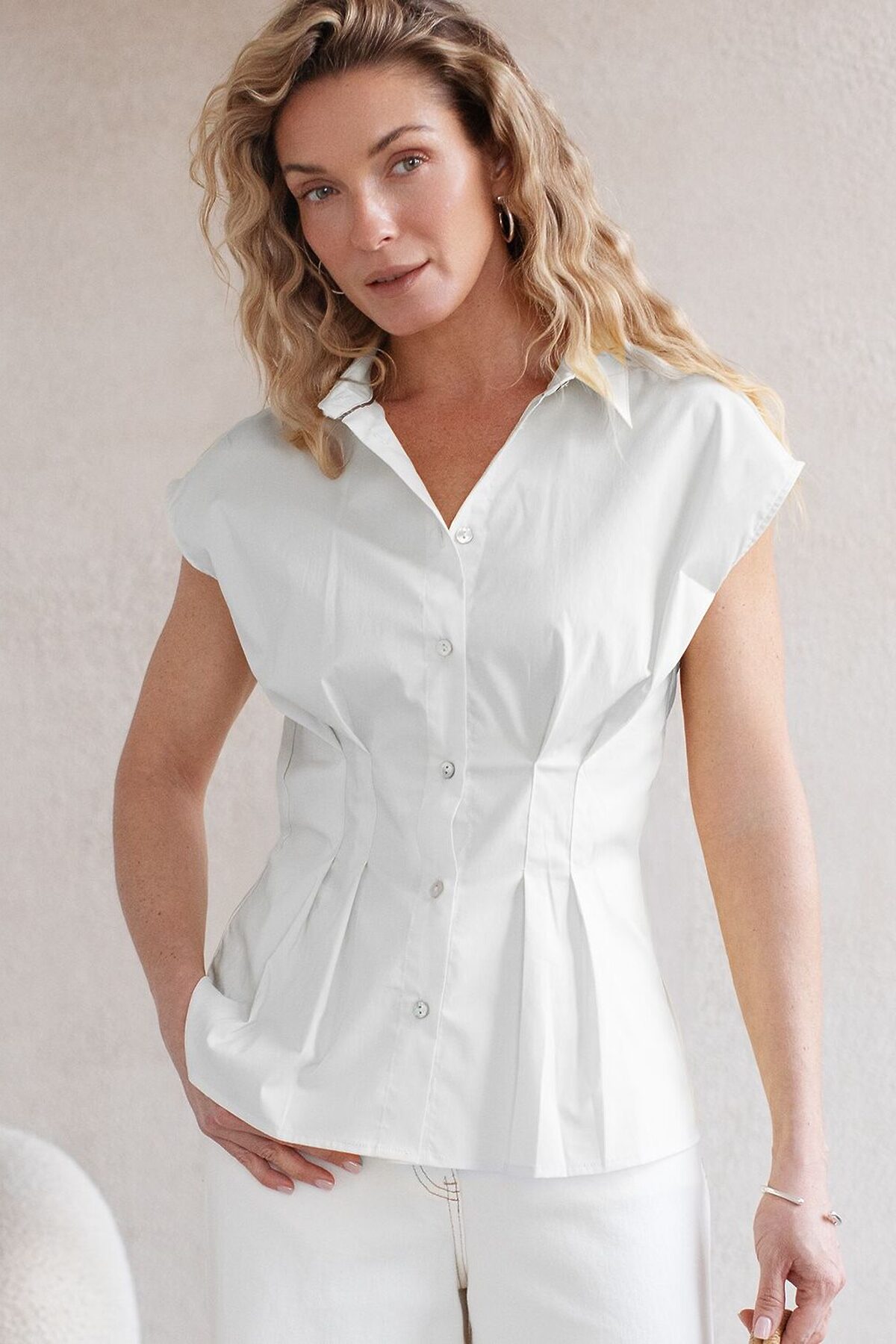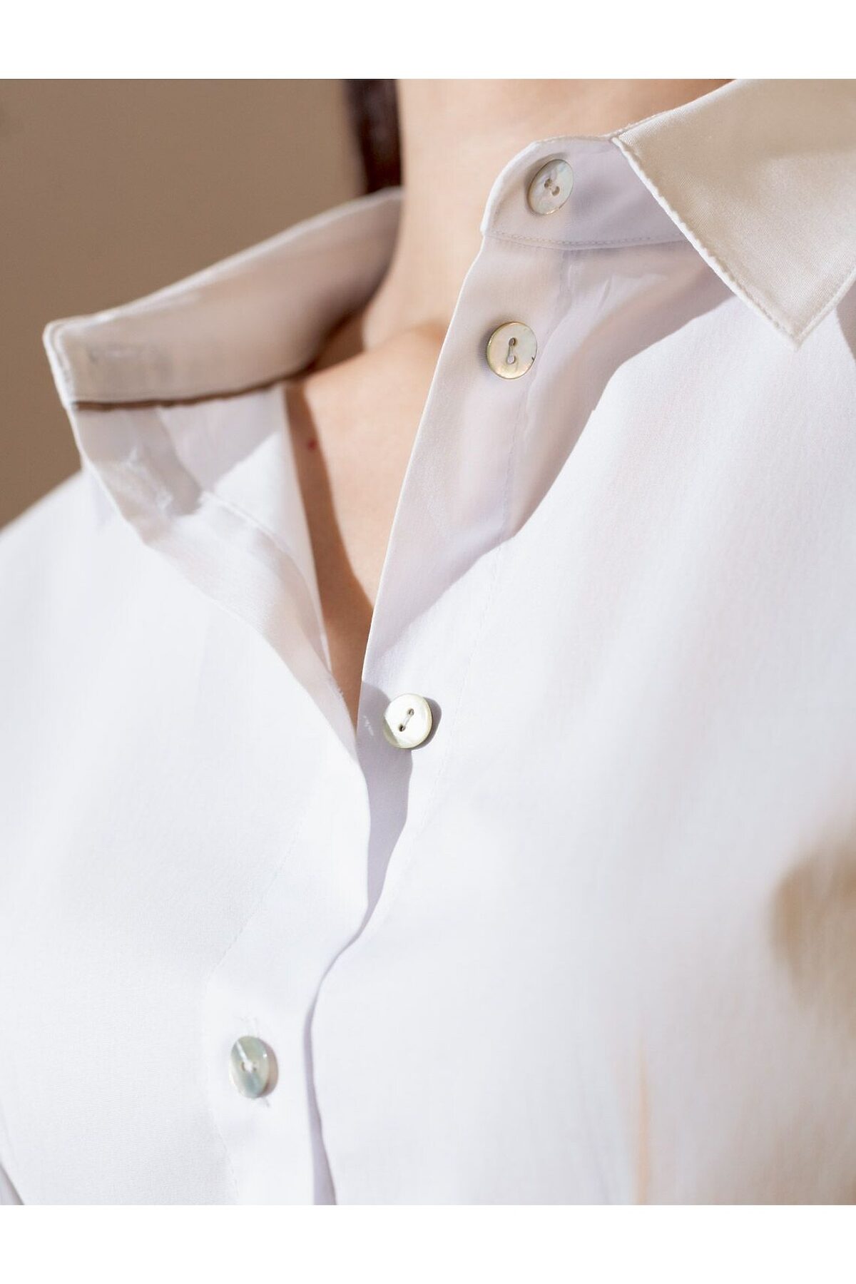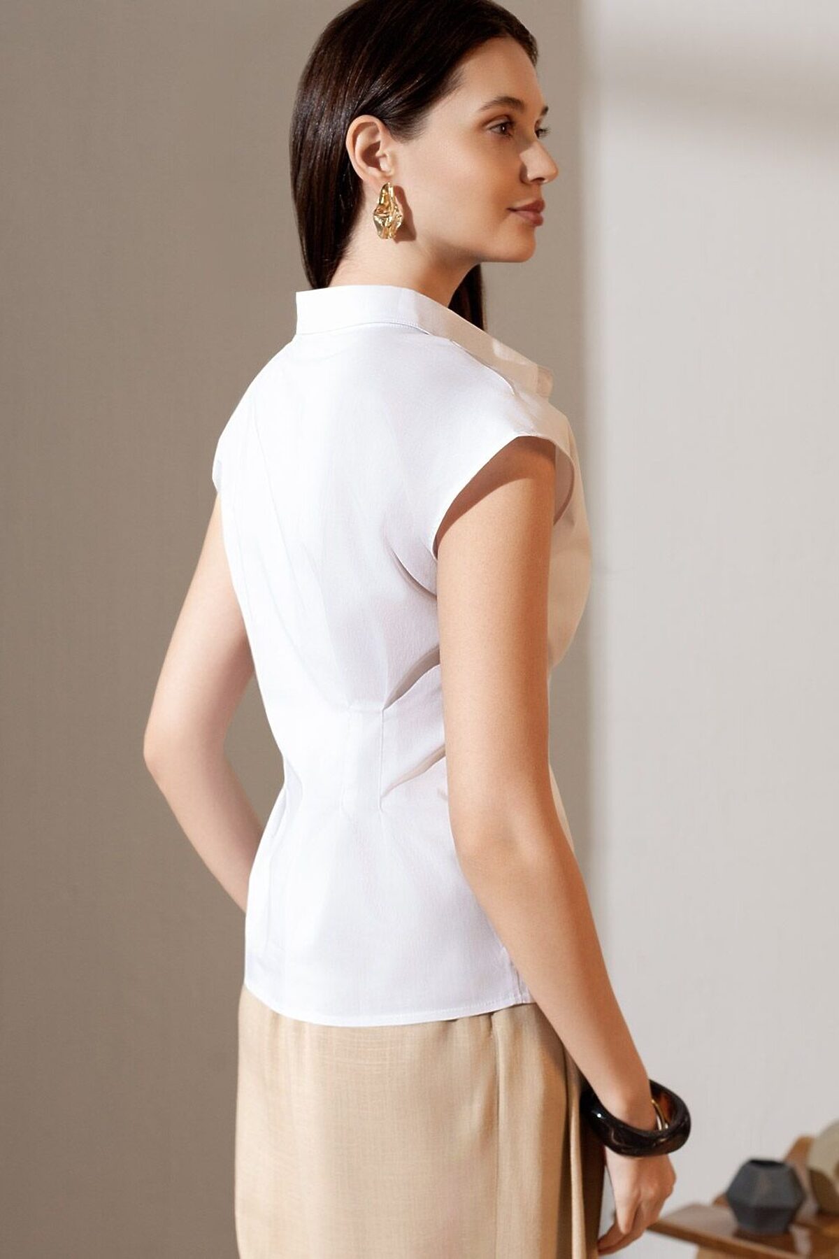 Изысканная женственная блузка белого цвета выполнена из легкого хлопкого поплина плотностью 96 Г/м2 и будет идеальна для создания комфортного и красивого образа в теплое время года. Натуральный материал отличается мягкостью и воздухопроницаемостью, что особенно ценно в жаркую погоду. Основное преимущество повседневной блузки — аккуратный приталенный силуэт, подчеркивающий достоинства фигуры и создающий акцент на линии талии. Короткий цельнокроеный рукав придает образу свежесть и легкость. Однотонная рубашка с отложным воротничком подойдет для работы в офисе, встреч с друзьями, прогулок, для особого случая или праздника. Лаконичная легкая блузка отлично сочетается с разнообразными элементами гардероба, благодаря ей можно создать классический или романтичный образ.