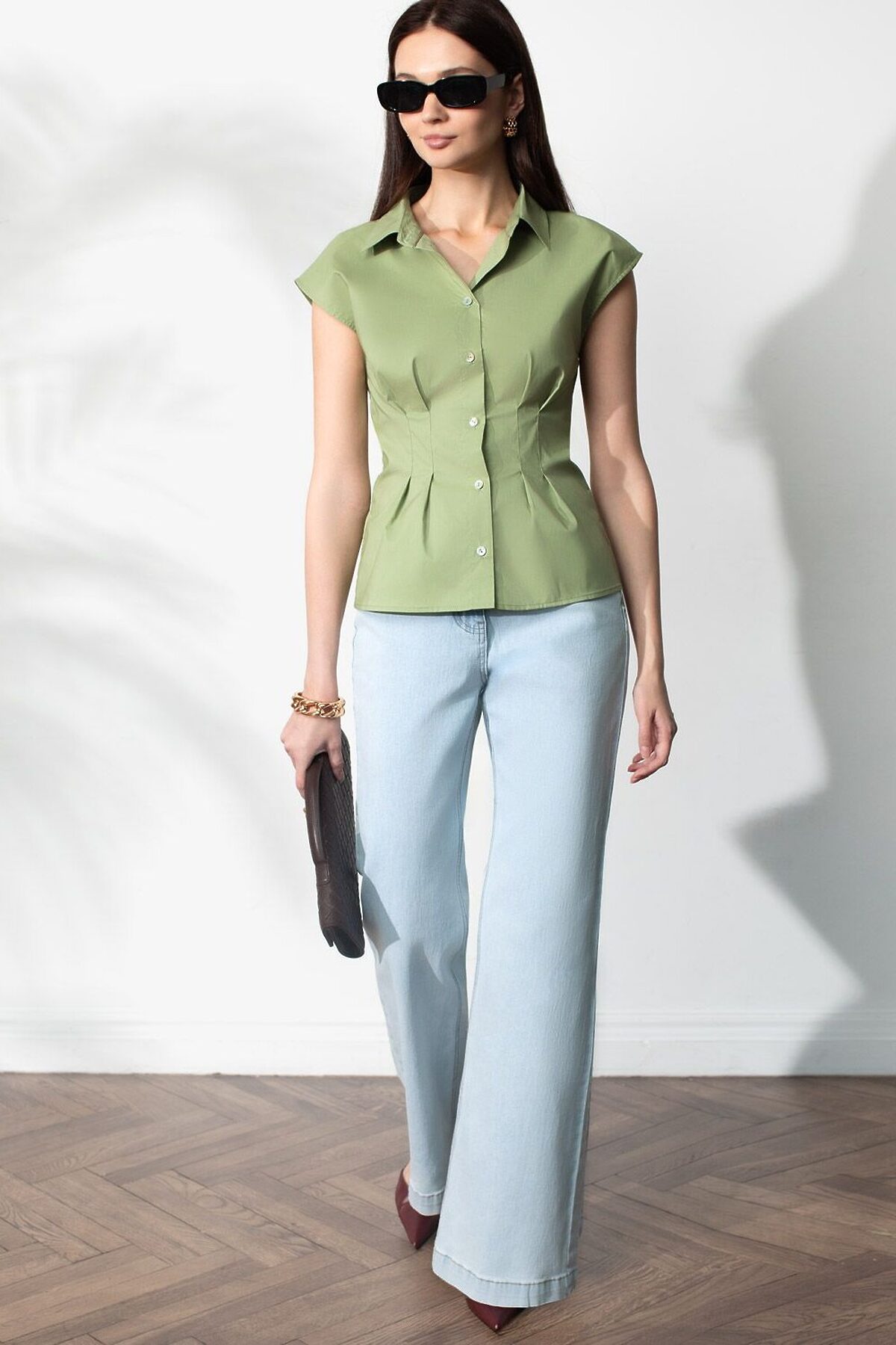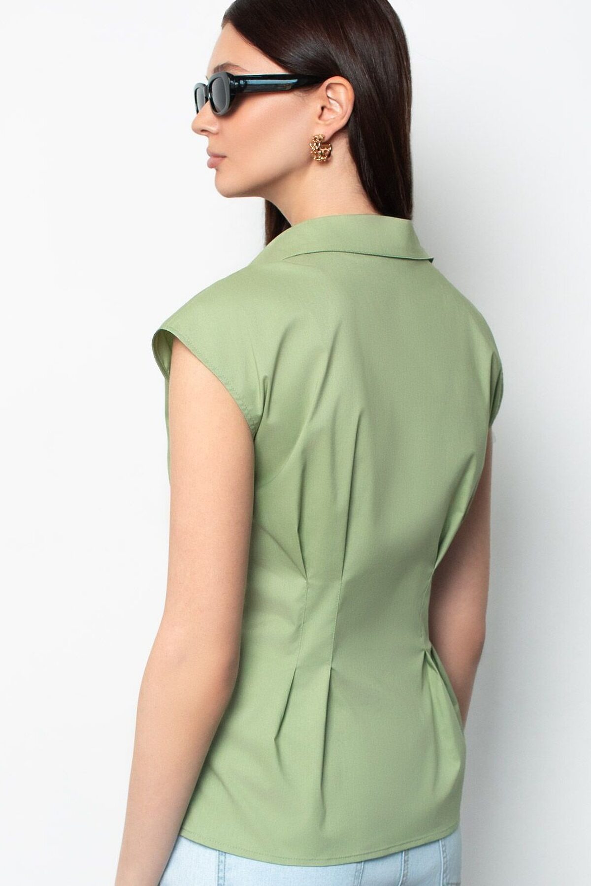 Изысканная женственная блузка оливкового цвета выполнена из легкого хлопкого поплина плотностью 96 Г/м2 и будет идеальна для создания комфортного и красивого образа в теплое время года. Натуральный материал отличается мягкостью и воздухопроницаемостью, что особенно ценно в жаркую погоду. Основное преимущество повседневной блузки — аккуратный приталенный силуэт, подчеркивающий достоинства фигуры и создающий акцент на линии талии. Короткий цельнокроеный рукав придает образу свежесть и легкость. Однотонная рубашка с отложным воротничком подойдет для работы в офисе, встреч с друзьями, прогулок, для особого случая или праздника. Лаконичная легкая блузка отлично сочетается с разнообразными элементами гардероба, благодаря ей можно создать классический или романтичный образ.