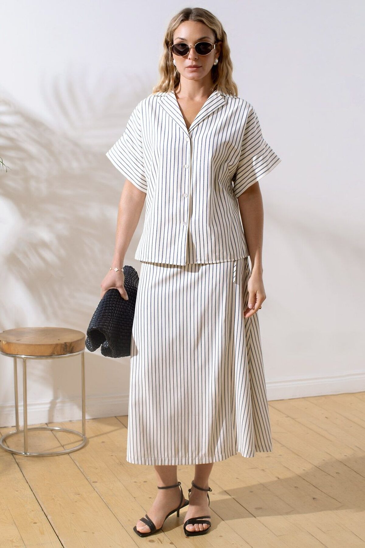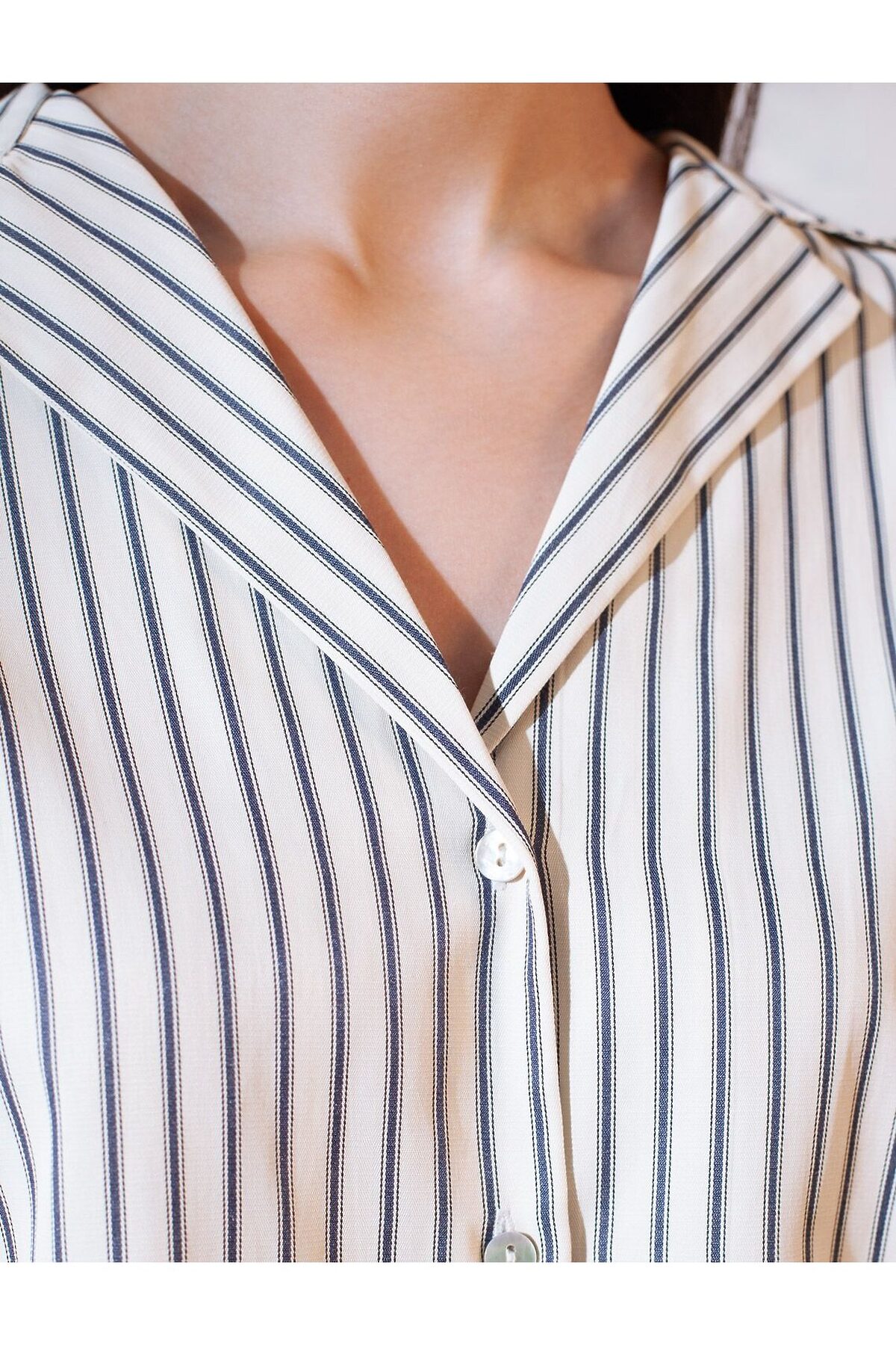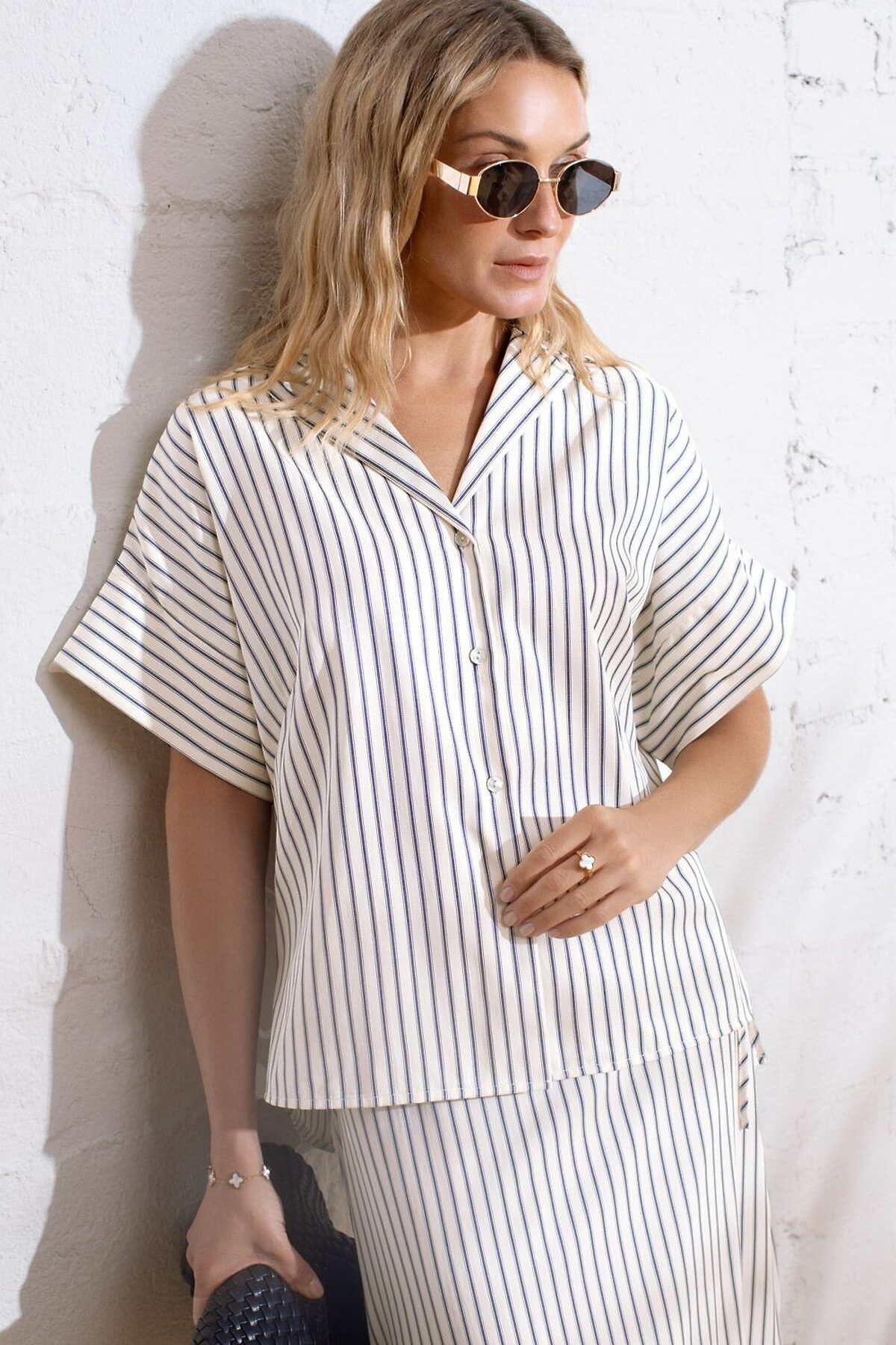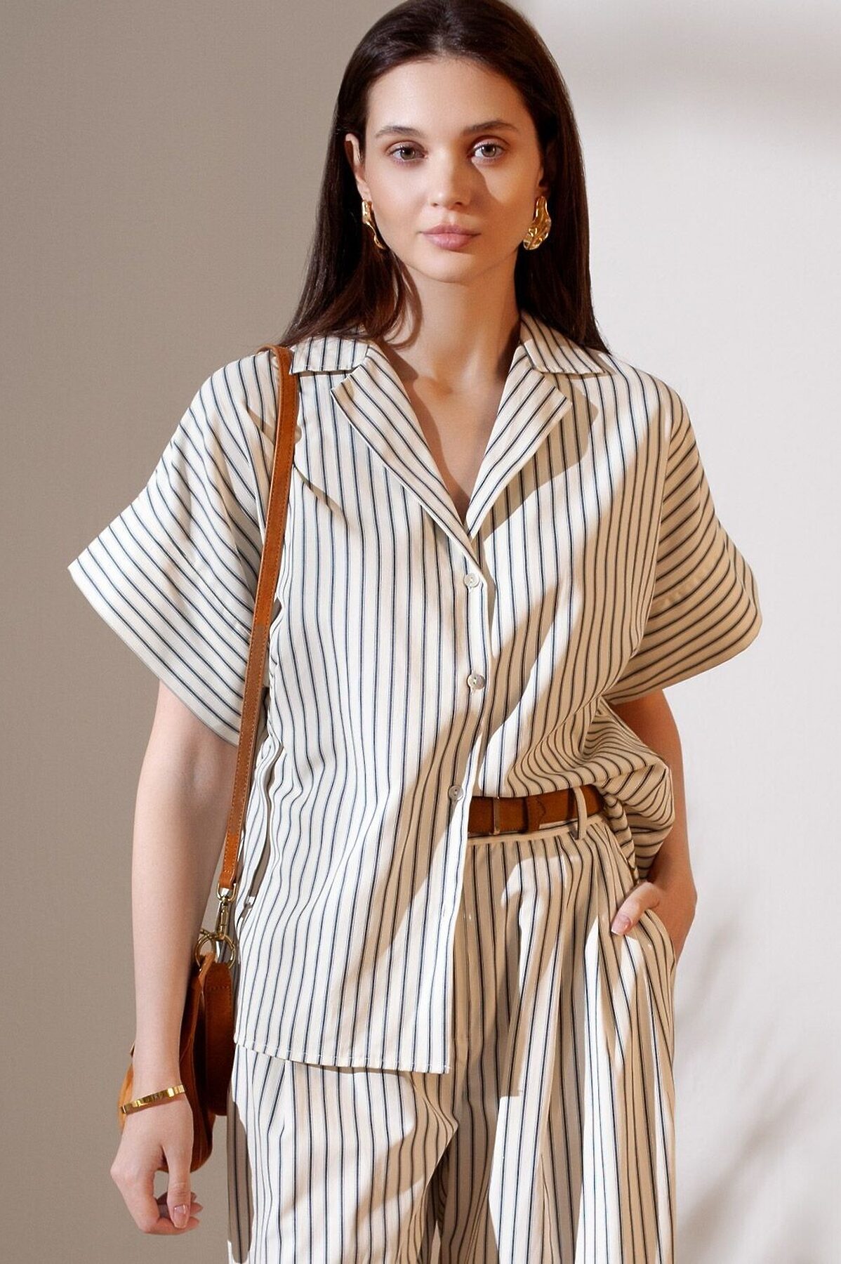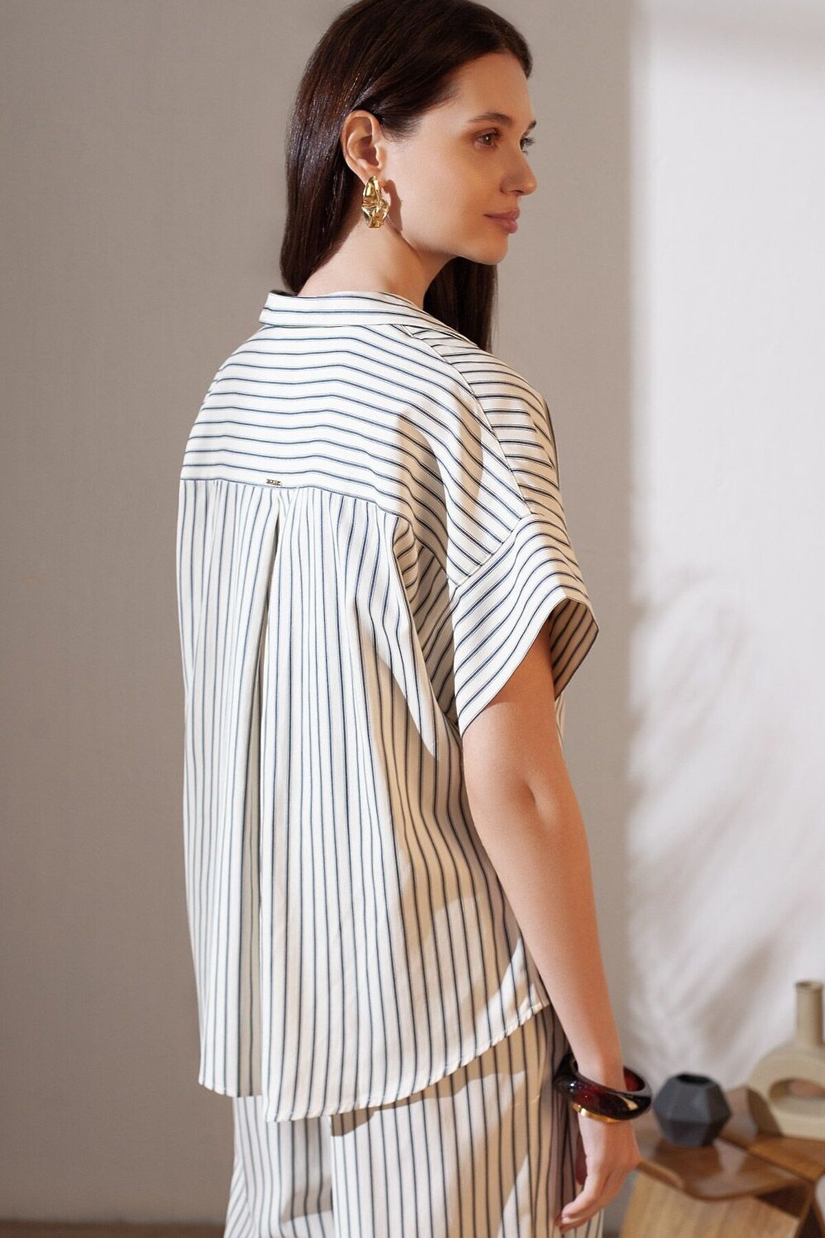 Стильная блузка молочно-синего цвета в полоску с коротким рукавом выполнена из легкого хлопкового поплина плотностью 112 Г/м2. Летняя модель идеально подходит на теплое время года и жаркую погоду. Натуральный состав ткани обладает высокой воздухопроницаемостью, а также способностью поглощать и отдавать влагу. В повседневной свободной блузке будет очень комфортно, благодаря правильной регуляции температуры тела. Удачнный крой, отложной воротничок и принт в полоску визуально вытяговают силуэт и помогают скрывать возможные недостатки фигуры. Цельнокроеные короткие рукава добавляют удобства и легкости, оставляя комфорт на высшем уровне. Такая рубашка отлично впишется в деловой гардероб и подчеркнет вашу уверенность на любом мероприятии. Этот фасон выделяется своей универсальностью, позволяя легко создавать образы для разных ситуаций. Если хотите выглядеть стильно и при этом чувствовать себя комфортно, этот выбор будет идеальным решением. Рекомендуем сочетать с артикулами: D24.298, D26.207