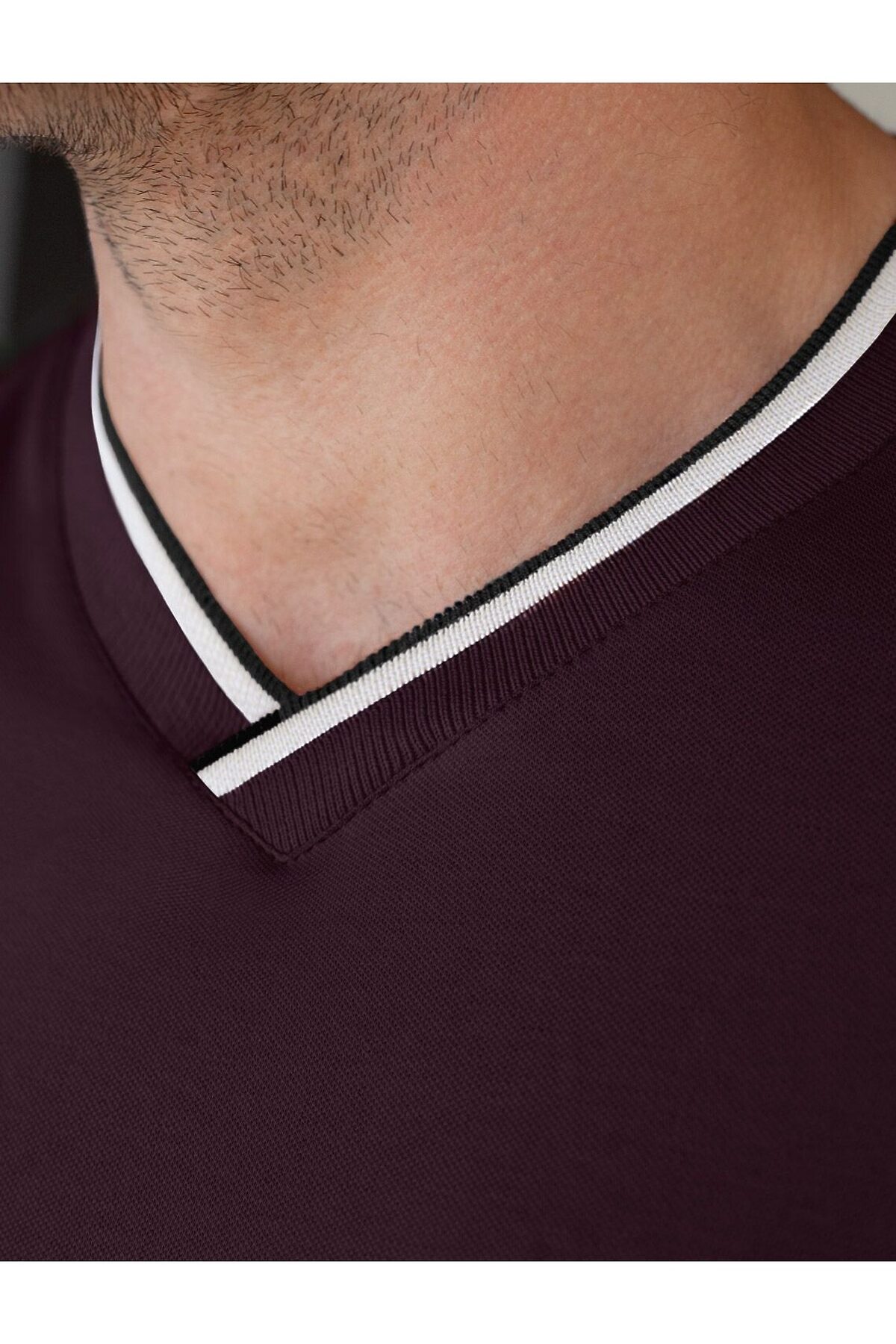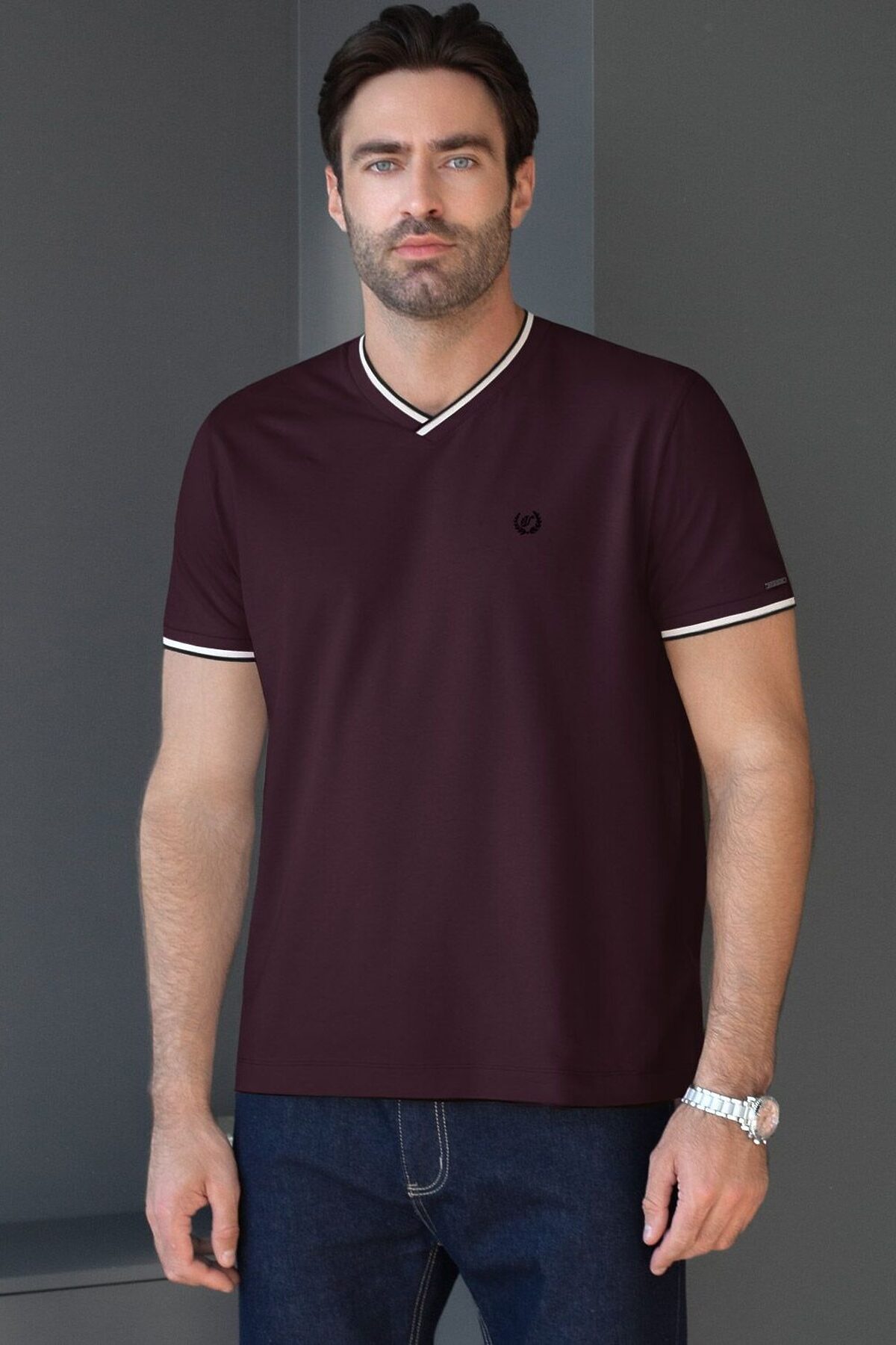 Футболка цвета бургунди с аккуратным V-образным вырезом выполнена из премиального хлопка с эластаном плотностью 200 Г/м2. Высококачественный эластичный хлопок обеспечивает мягкость, воздухопроницаемость и идеальную посадку на любую фигуру и размеры, включая 58 размер. Классический прямой крой футболки подчеркивает фигуру, но не сковывает движений. Элегантный небольшой V-образный вырез с контрастной полосой визуально удлиняет шею, а минималистичная вышивка на груди в виде логотипа бренда добавляет изысканности и индивидуальности, не перегружая образ. Эта базовая футболка - идеальный баланс комфорта и стиля для современного мужчины, легко сочетается с разными низами, создавая образ от кэжуал до более элегантного. Стильная футболка подходит как для повседневной носки, так и для создания более нарядных образов.