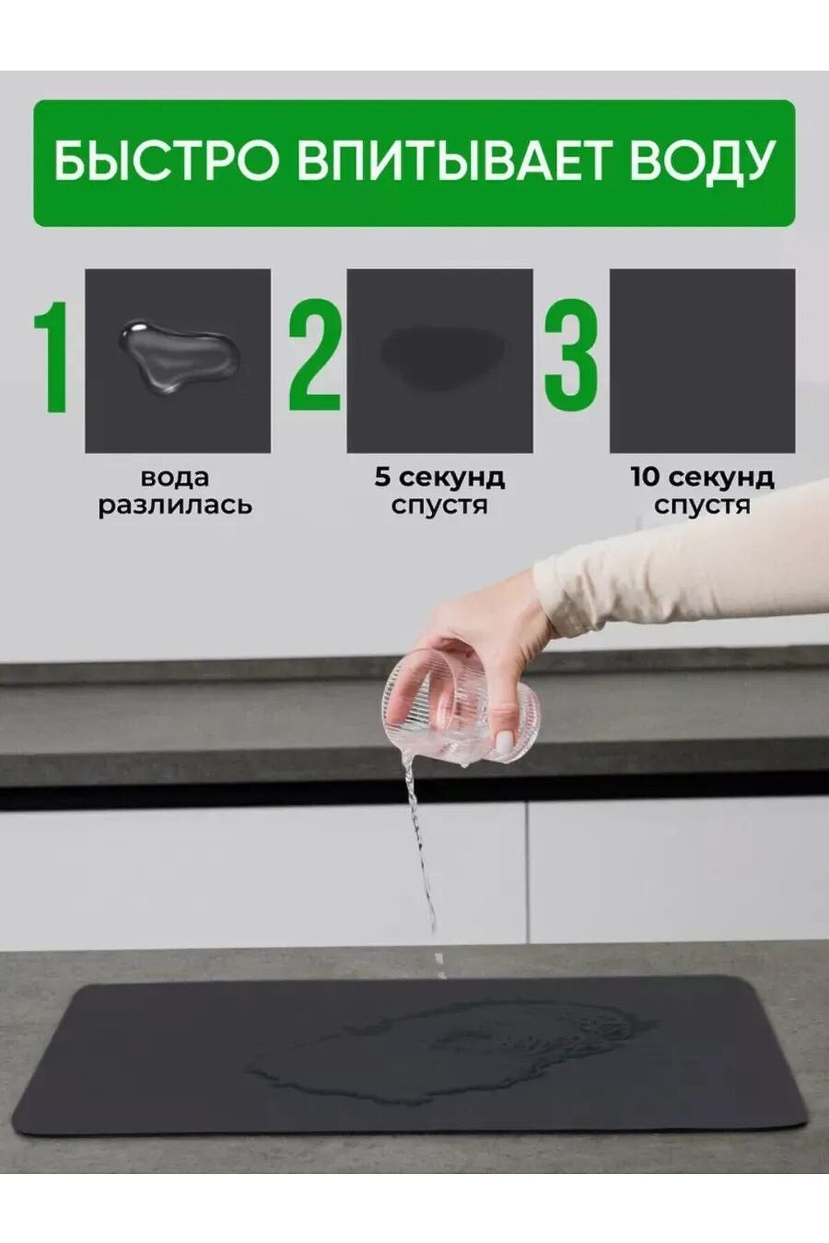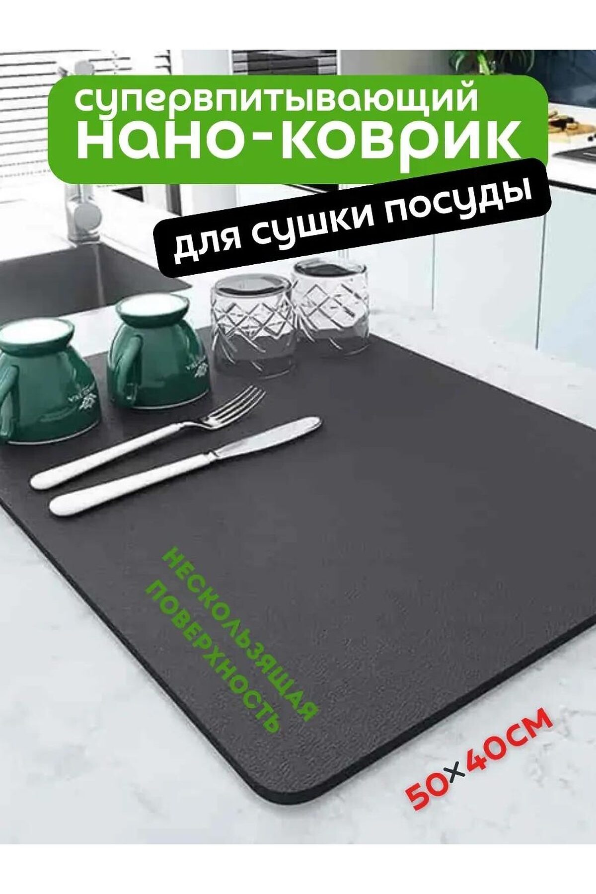 Нано коврик выполнен из вспененной противоскользящей резиновой основы, поглощающей воду. Прорезиненный водонепронецаемый низ ковра обеспечивает антискользящий и защитный от размокания столешницы эффект. В состав входит диатомитовый слой - это современный влаговпитывающий и антибактериальный нана материал. Его гидрофобная текстура помогает влаге испаряться быстрее, чем обычно, а тканевая впитывающая поверхность из микрофибры способствуют быстрому высыханию. Прекрасно заменит не удобное мокрое кухонное полотенце. Положите эту подложку на стол у раковины или используйте для разморозки продуктов, мяса, для сушки овощей. Подойдет не только как настольная сушилка на кухню у мойки, но и как подстилка на стиральную машину, и как подставка под поддон для тарелок и других столовых приборов. Большой размер 50х40 см позволяет подрезать коарик как хочется, даже на маленький столик. Наноковрик - универсальный подарок для любой домохозяйки на день рождения, новый год или 8 марта. Этот экоковрик незаменимый помощник для мытья посуды, уборки и порядка в доме. Где использовать: Как коврик под посуду и столовые приборы Для размораживания мяса и полуфабрикатов Подложка на стол или стиральную машину Как поддон под сушилку для посуды Альтернатива мокрому полотенцу и тряпкам Подарок для хозяйки: отличный выбор на 8 марта, Новый год, день рождения. Размер: 5040 см (можно подрезать по размеру стола) Материал: микрофибра + диатомит + прорезиненная подложка Быстро впитывает и высыхает, не оставляя запахов и влаги