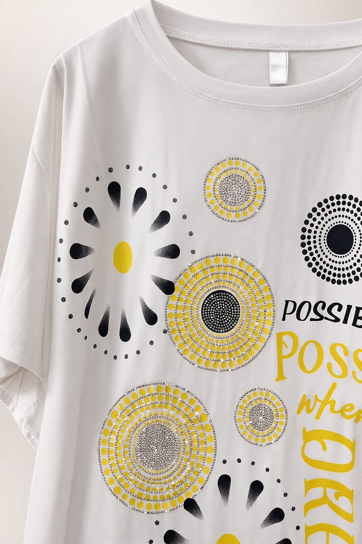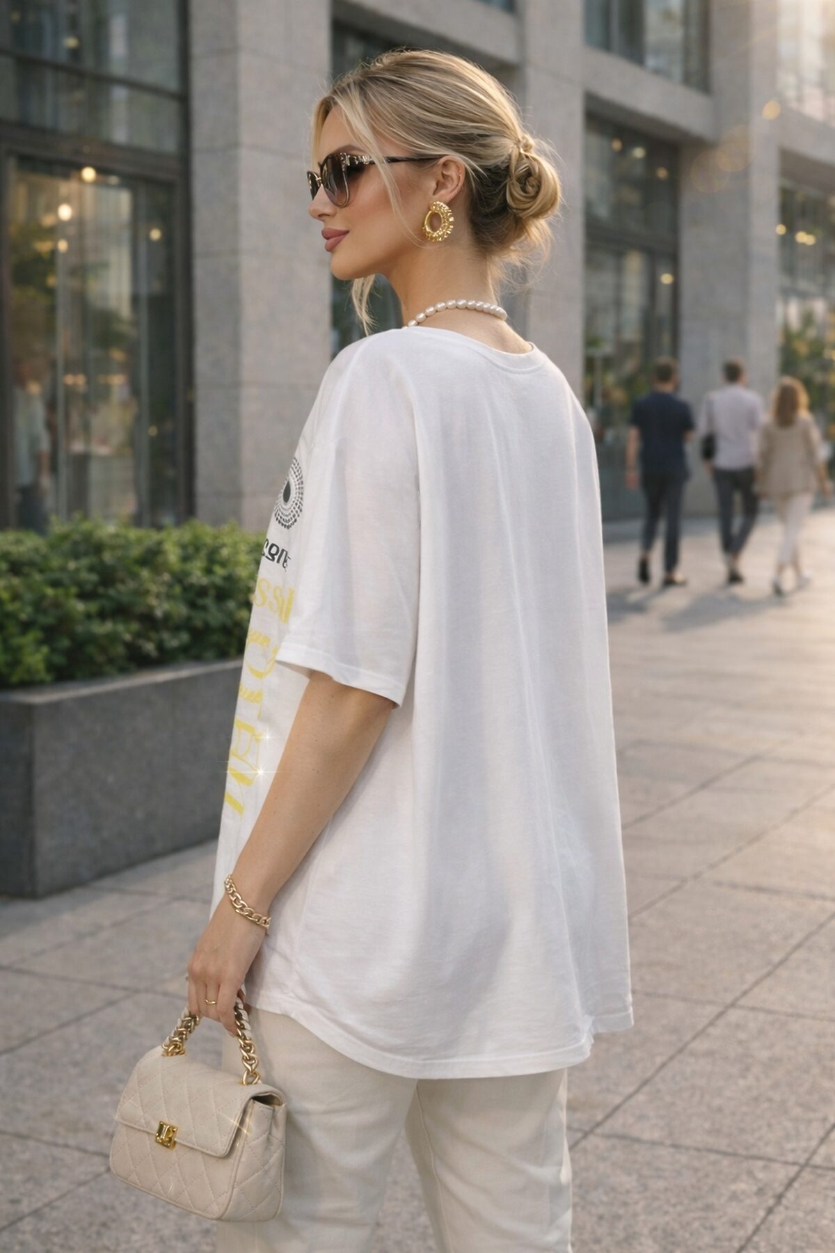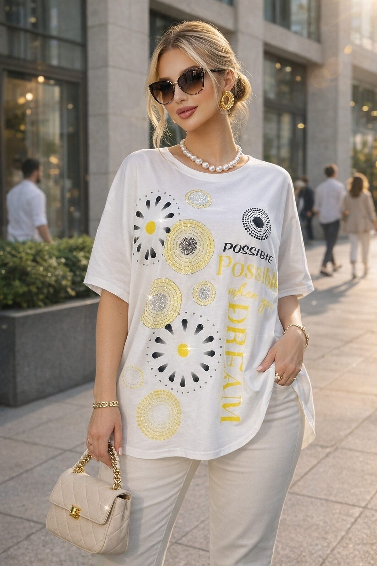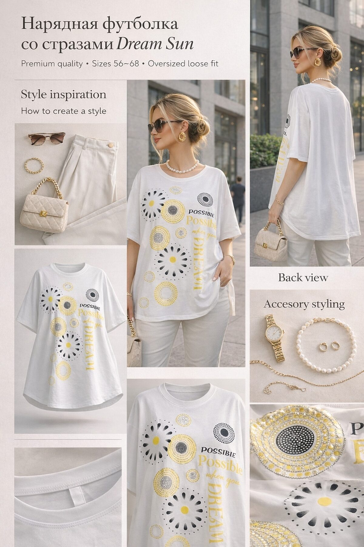 Нарядная футболка-туника Dream Sun, арт. F9702 сияющий образ для тех, кто верит в мечты. Эта туника не просто одежда, а вдохновляющее заявление: Всё возможно, если ты мечтаешь так звучит надпись на передней части изделия, гармонично вписанная в яркий, солнечный принт. Артикул F9702 создан для женщин, которые ценят смелость, женственность и утончённую роскошь в каждой детали. Изделие выполнено из хлопкового стрейча (95% хлопок, 5% спандекс) плотного, мягкого и приятного к телу материала. Благодаря эластичности туника хорошо сидит по фигуре без сковывания движений, сохраняет форму даже после многократных стирок и не образует катышков. Цвета остаются насыщенными, а фактура безупречной сезон за сезоном. Крой оверсайз с опущенной линией плеча, что придаёт модели современный, расслабленный силуэт и визуально удлиняет корпус. Такой крой особенно комфортен в повседневной носке и подходит для фигур размеров 5868 универсальный размер, который работает благодаря свободному крою и эластичности ткани. Сияющее впечатление эффект солнечного блеска: по передней части расположены композиции из страз в виде абстрактных цветов и кругов. Стразы переливаются в свете особенно красиво на солнце, создавая ощущение легкости, радости и внутреннего сияния. Это не просто декор это энергия, которую вы несёте с собой. С чем носить? С бежевыми или кремовыми брюками и туфлями для элегантного дневного образа; С джинсами и ботильонами для городского шика; С юбкой-миди и жакетом для деловой встречи или культурного события; С шортами и кроссовками для летнего look; С поясом поверх туники чтобы подчеркнуть талию и добавить структуры. Уход: Деликатная стирка при 30C, без отбеливателей. Перед стиркой выворачивайте изделие наизнанку это сохранит блеск страз. Гладьте через тканевую прокладку, избегая прямого контакта утюга с декором.