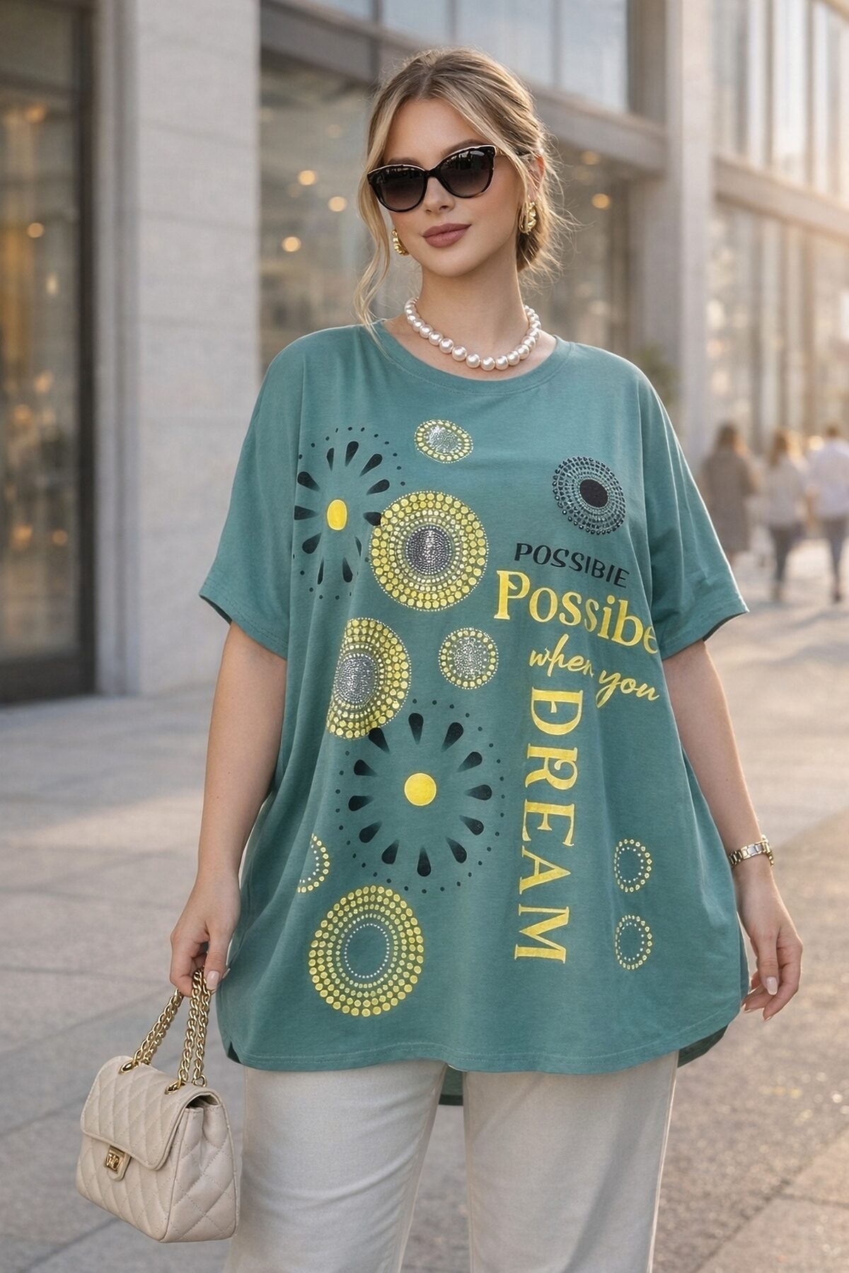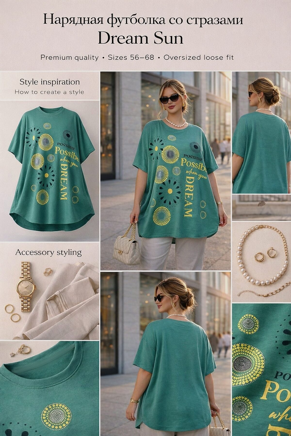 Нарядная футболка-туника Dream Sun, арт. F9702 сияющий образ для тех, кто верит в мечты. Эта туника не просто одежда, а вдохновляющее заявление: Всё возможно, если ты мечтаешь так звучит надпись на передней части изделия, гармонично вписанная в яркий, солнечный принт. Артикул F9702 создан для женщин, которые ценят смелость, женственность и утончённую роскошь в каждой детали. Изделие выполнено из хлопкового стрейча (95% хлопок, 5% спандекс) плотного, мягкого и приятного к телу материала. Благодаря эластичности туника хорошо сидит по фигуре без сковывания движений, сохраняет форму даже после многократных стирок и не образует катышков. Цвета остаются насыщенными, а фактура безупречной сезон за сезоном. Крой оверсайз с опущенной линией плеча, что придаёт модели современный, расслабленный силуэт и визуально удлиняет корпус. Такой крой особенно комфортен в повседневной носке и подходит для фигур размеров 5868 универсальный размер, который работает благодаря свободному крою и эластичности ткани. Сияющее впечатление эффект солнечного блеска: по передней части расположены композиции из страз в виде абстрактных цветов и кругов. Стразы переливаются в свете особенно красиво на солнце, создавая ощущение легкости, радости и внутреннего сияния. Это не просто декор это энергия, которую вы несёте с собой. С чем носить? С бежевыми или кремовыми брюками и туфлями для элегантного дневного образа; С джинсами и ботильонами для городского шика; С юбкой-миди и жакетом для деловой встречи или культурного события; С шортами и кроссовками для летнего look; С поясом поверх туники чтобы подчеркнуть талию и добавить структуры. Уход: Деликатная стирка при 30C, без отбеливателей. Перед стиркой выворачивайте изделие наизнанку это сохранит блеск страз. Гладьте через тканевую прокладку, избегая прямого контакта утюга с декором.