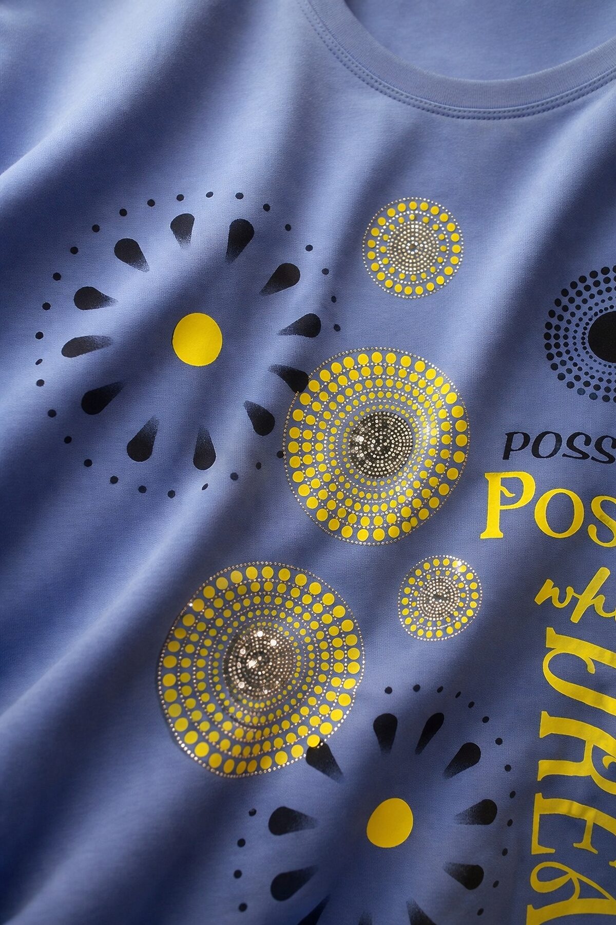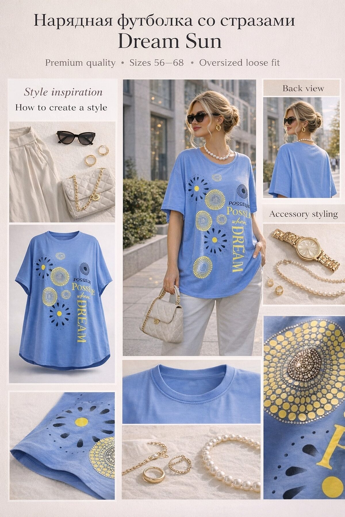 Нарядная футболка-туника Dream Sun, арт. F9702 сияющий образ для тех, кто верит в мечты. Эта туника не просто одежда, а вдохновляющее заявление: Всё возможно, если ты мечтаешь так звучит надпись на передней части изделия, гармонично вписанная в яркий, солнечный принт. Артикул F9702 создан для женщин, которые ценят смелость, женственность и утончённую роскошь в каждой детали. Изделие выполнено из хлопкового стрейча (95% хлопок, 5% спандекс) плотного, мягкого и приятного к телу материала. Благодаря эластичности туника хорошо сидит по фигуре без сковывания движений, сохраняет форму даже после многократных стирок и не образует катышков. Цвета остаются насыщенными, а фактура безупречной сезон за сезоном. Крой оверсайз с опущенной линией плеча, что придаёт модели современный, расслабленный силуэт и визуально удлиняет корпус. Такой крой особенно комфортен в повседневной носке и подходит для фигур размеров 5868 универсальный размер, который работает благодаря свободному крою и эластичности ткани. Сияющее впечатление эффект солнечного блеска: по передней части расположены композиции из страз в виде абстрактных цветов и кругов. Стразы переливаются в свете особенно красиво на солнце, создавая ощущение легкости, радости и внутреннего сияния. Это не просто декор это энергия, которую вы несёте с собой. С чем носить? С бежевыми или кремовыми брюками и туфлями для элегантного дневного образа; С джинсами и ботильонами для городского шика; С юбкой-миди и жакетом для деловой встречи или культурного события; С шортами и кроссовками для летнего look; С поясом поверх туники чтобы подчеркнуть талию и добавить структуры. Уход: Деликатная стирка при 30C, без отбеливателей. Перед стиркой выворачивайте изделие наизнанку это сохранит блеск страз. Гладьте через тканевую прокладку, избегая прямого контакта утюга с декором.