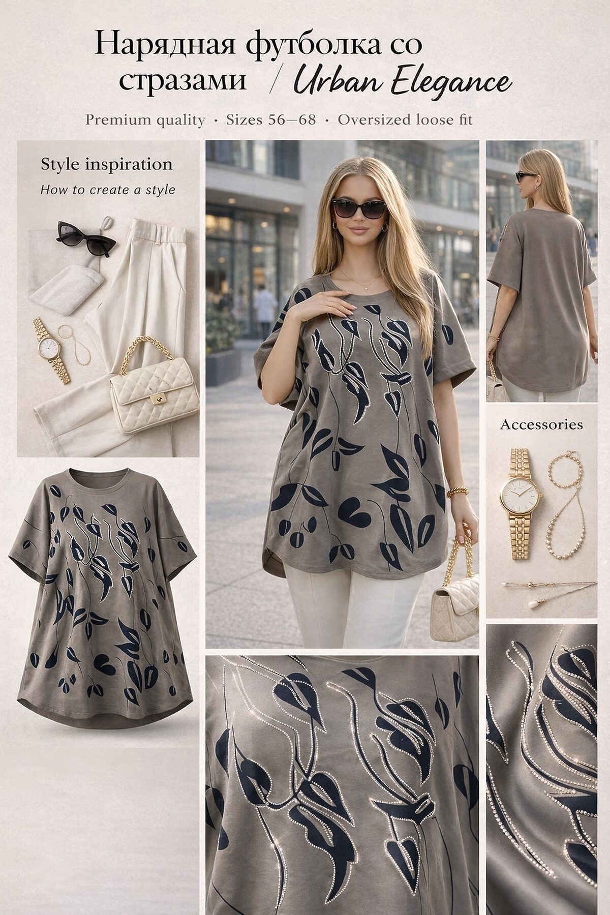 Нарядная футболка-туника oversize со стразами Urban Elegance, арт. F8113 где повседневный комфорт встречается с городской роскошью это современная интерпретация базовой футболки: свободный оверсайз-крой, изысканный графичный принт и утончённые стразы превращают её в настоящий must-have для женщин, ценящих элегантность без излишеств. Изделие выполнено из высококачественного хлопкового стрейча (95% хлопок, 5% спандекс) плотного, но мягкого и приятного к телу материала. Благодаря добавлению лайкры ткань обладает отличной эластичностью: она идеально подстраивается под фигуру, не сковывая движений, и сохраняет форму даже после многократных стирок. Спущенная линия плеча создаёт расслабленный, модный силуэт, визуально удлиняющий шею и придающий образу лёгкую небрежную грацию. Крой оверсайз обеспечивает универсальность: туника легко садится на фигуры размеров 5868, скрывая недостатки и подчёркивая достоинства. Это действительно единый размер, который работает благодаря продуманному крою и эластичности ткани. Центральный акцент ботанический принт в темной гамме, дополненный расстановкой страз по контурам листьев и ветвей. Стразы переливаются в свете, создавая эффект живого декора не кричащего, а деликатного, с глубиной и текстурой. Это не блеск ради блеска, а акцент, который говорит о вашем вкусе и внимании к деталям. Как носить? С классическими брюками и лодочками для делового ланча или вечерней прогулки; С кожаными шортами и ботильонами для смелого уличного образа; С юбкой-миди и жакетом для официального мероприятия в неформальной обстановке; С леггинсами или джинсами и кроссовками для комфорта без потери стиля; С поясом поверх туники чтобы подчеркнуть талию и добавить структуры. Уход: Деликатная стирка при 30C, без отбеливателей. Рекомендуется выворачивать изделие наизнанку перед стиркой для сохранения блеска страз. Гладить через тканевую прокладку, избегая прямого контакта утюга с декором. Urban Elegance Это ваш стиль: уверенный, утончённый, современный. Наденьте эту тунику и вы будете выглядеть так, будто только что вышли из модного журнала.