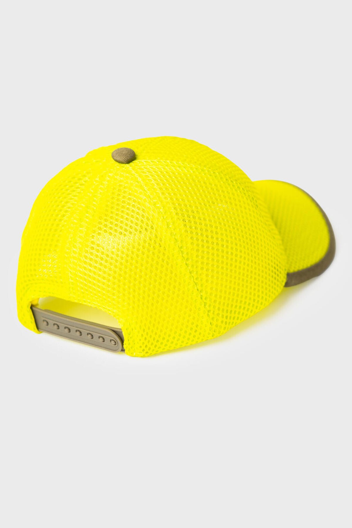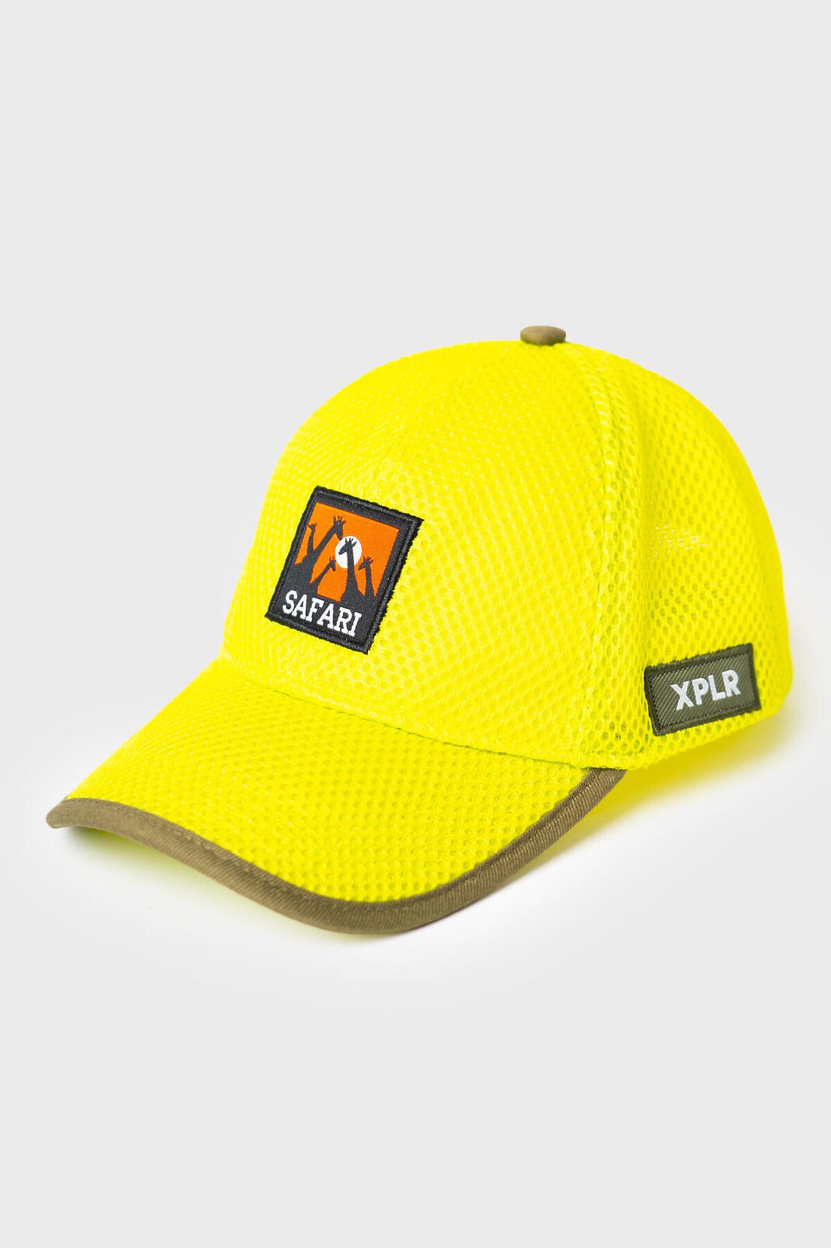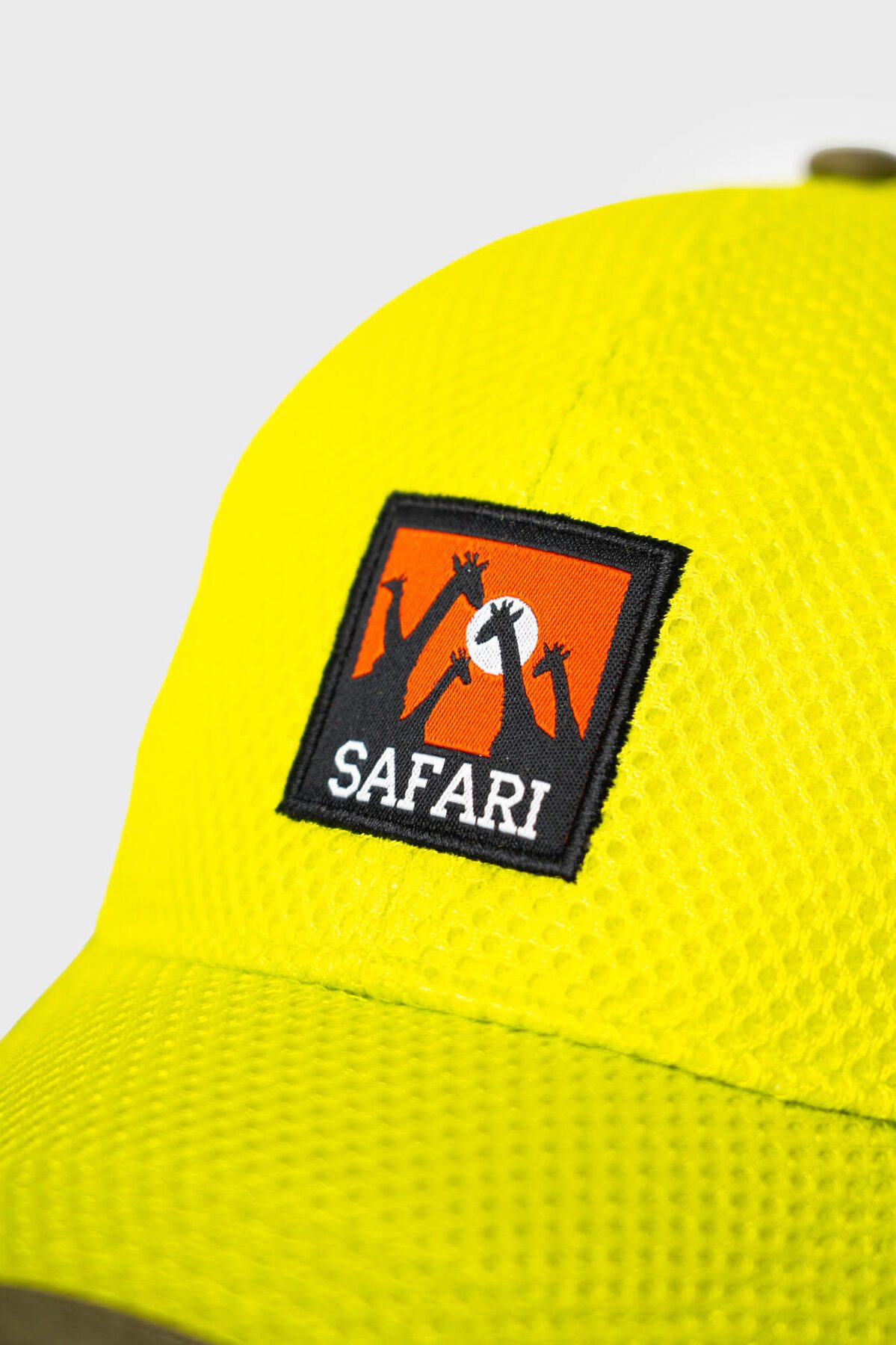 Детская бейсболка для мальчика. Модель выполнена из легкой дышащей сетки ярко-жёлтого цвета. Классическая форма с изогнутым козырьком и регулируемой застежкой на копках сзади. Спереди размещён вышитый шеврон с изображением сафари, а сбоку — тканевая нашивка.