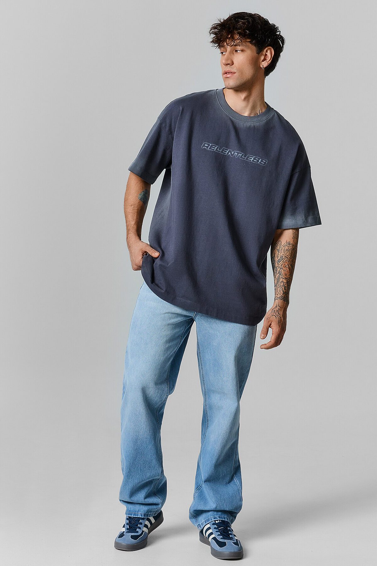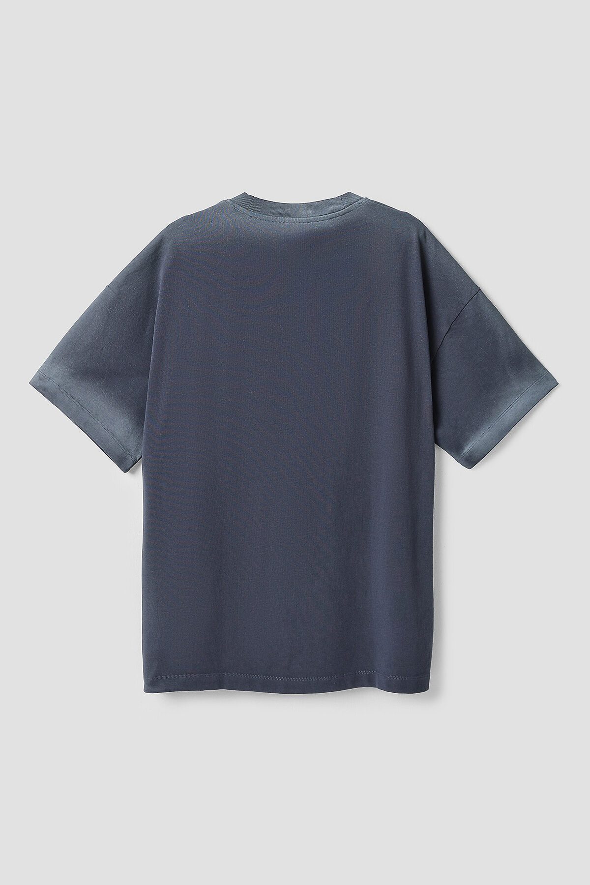 Футболка прямого силуэта. Горловина округлой формы обработана обтачкой из рибаны. Шов втачивания обтачки по спинке закрыт бейкой из основного полотна. Рукава втачные, корткие. Линия плеча слегка спущена.Нижние срезы футболки и рукавов обработаны швом вподгибку.