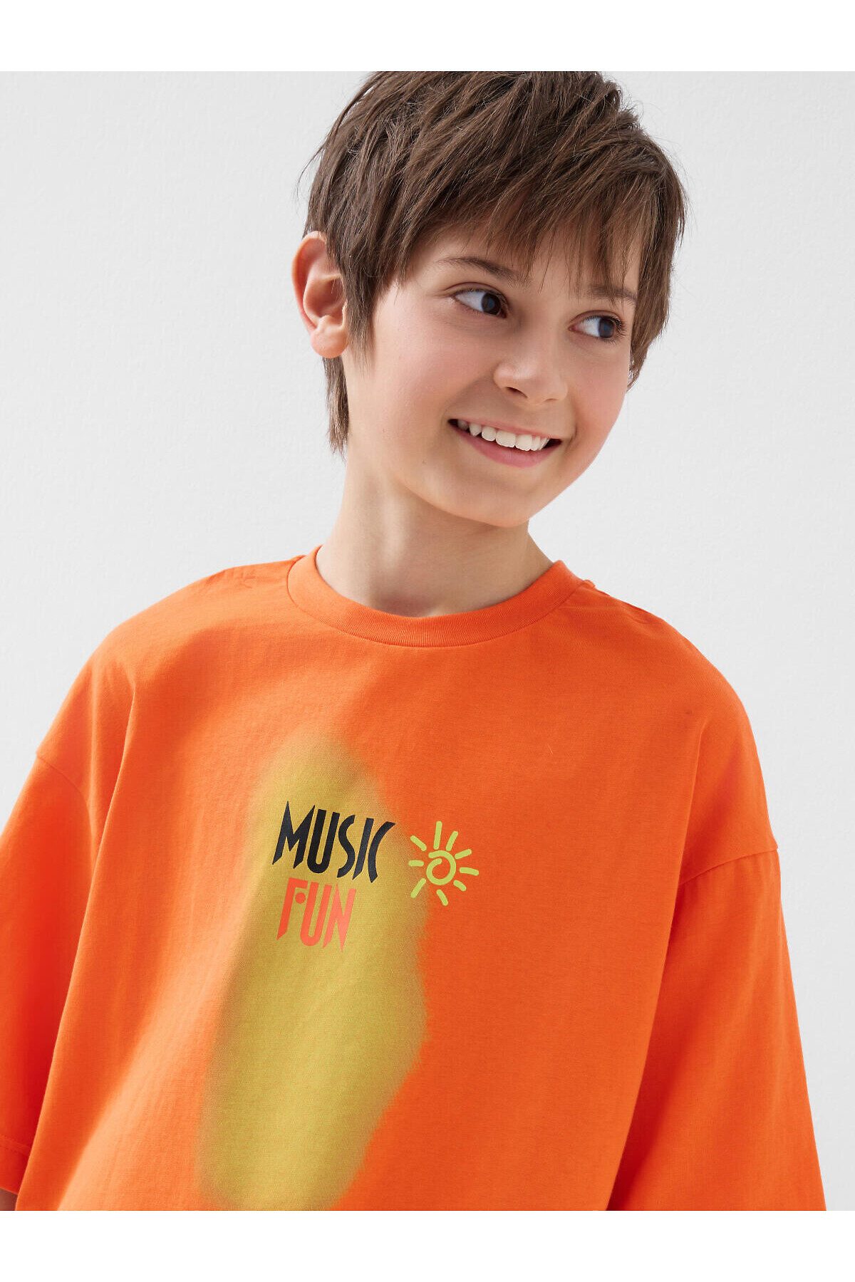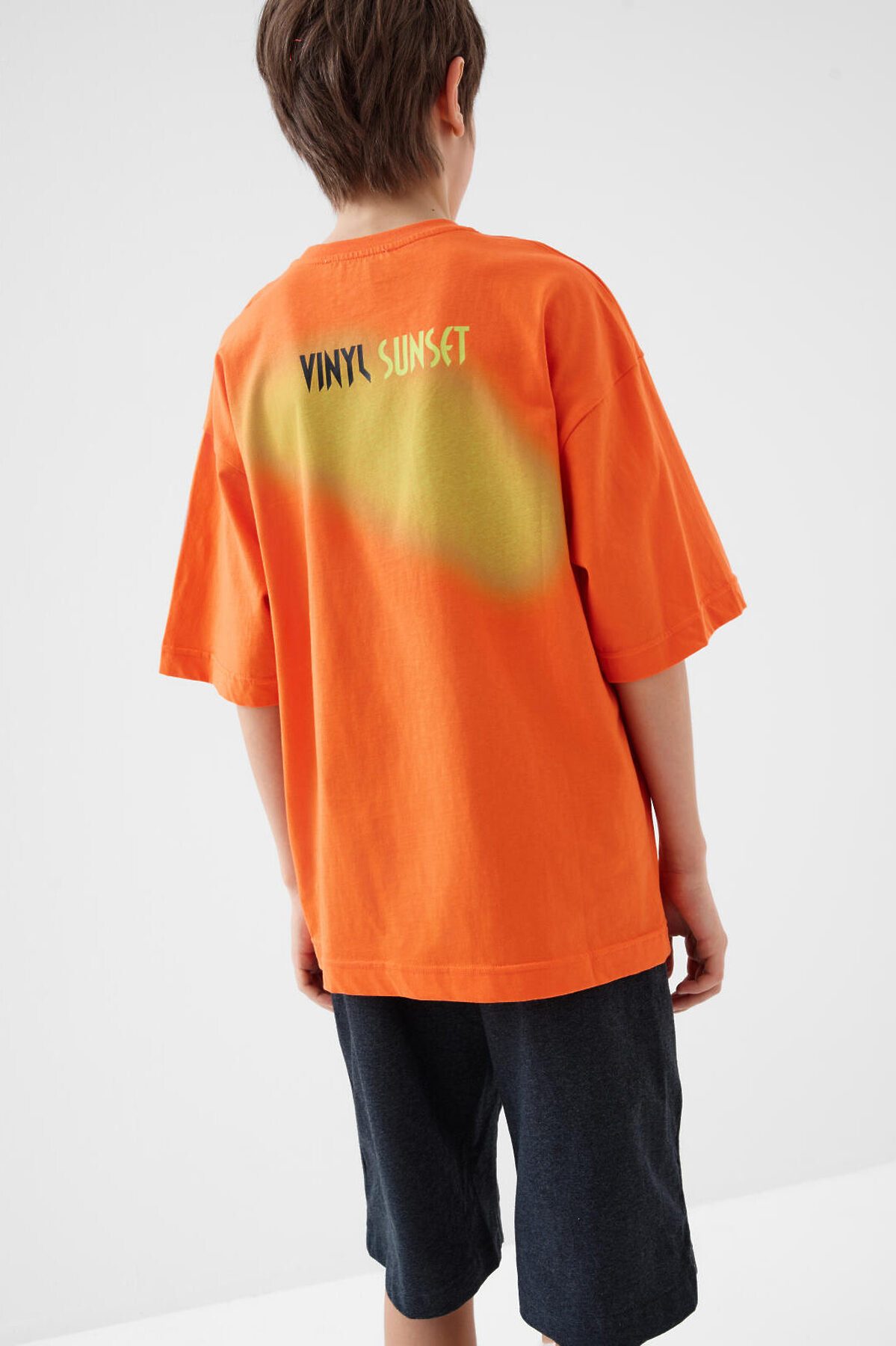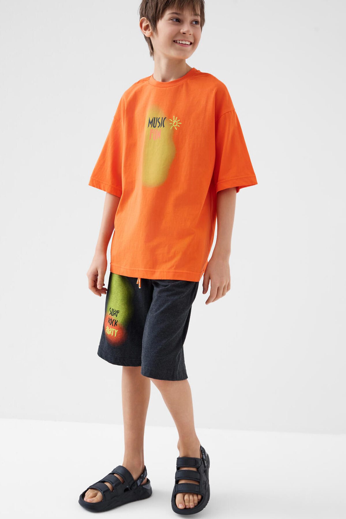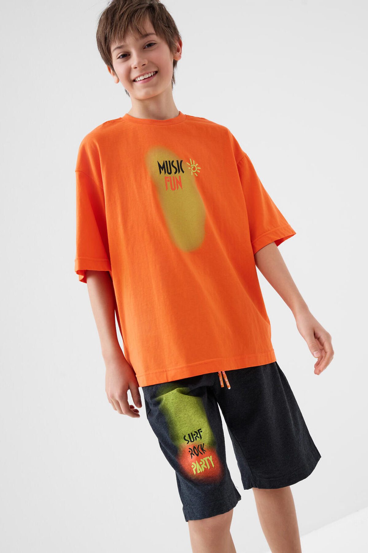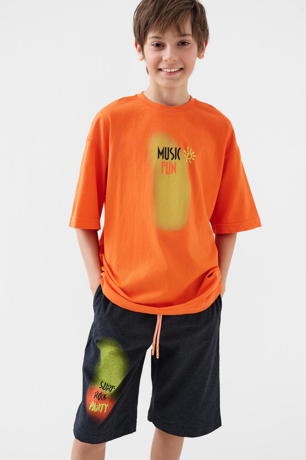 Костюм для мальчика подростка. Состоит из футболки и шорт. Выполнен из хлопкового трикотажа. Футболка оверсайз, с коротким рукавом и ярким принтом. Шорты свободные, с эластичным поясом и шнурком для регулировки посадки. По бокам расположены карманы.