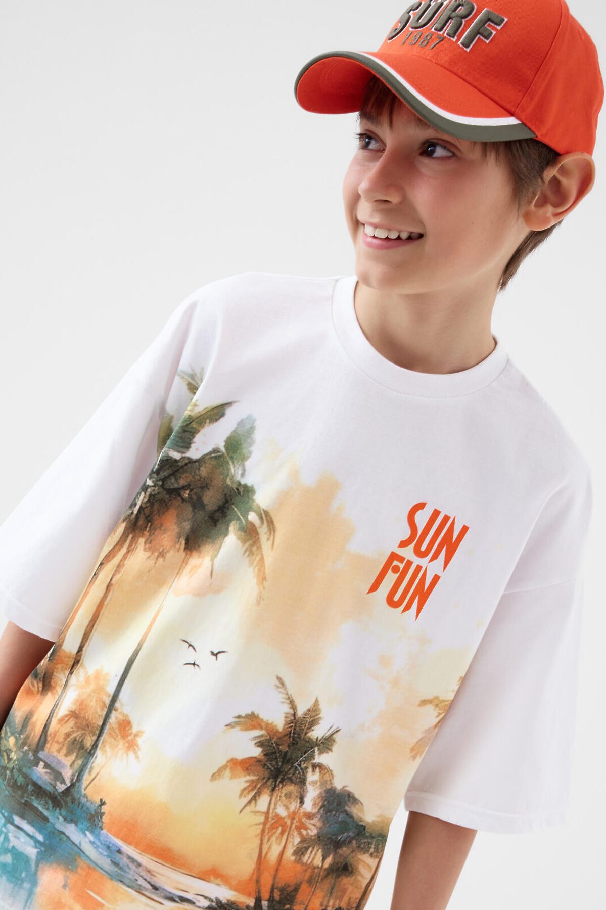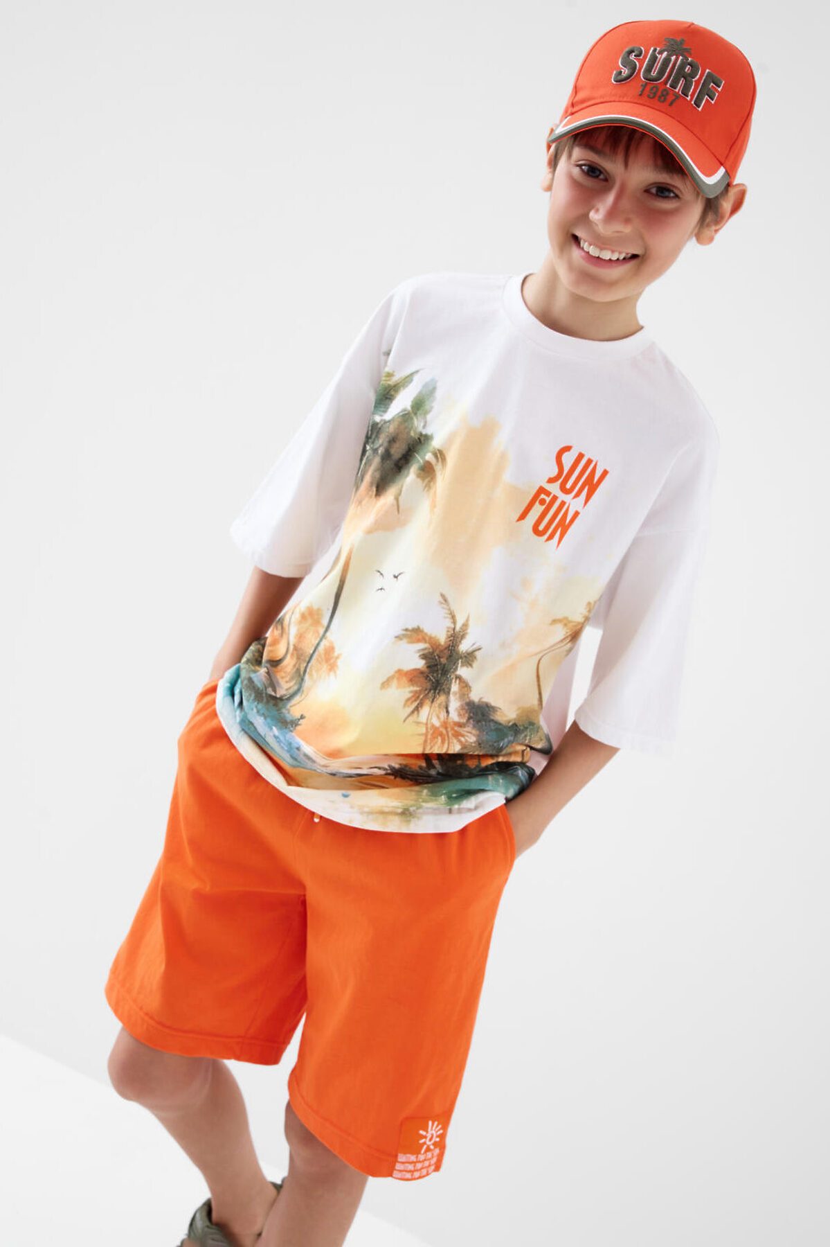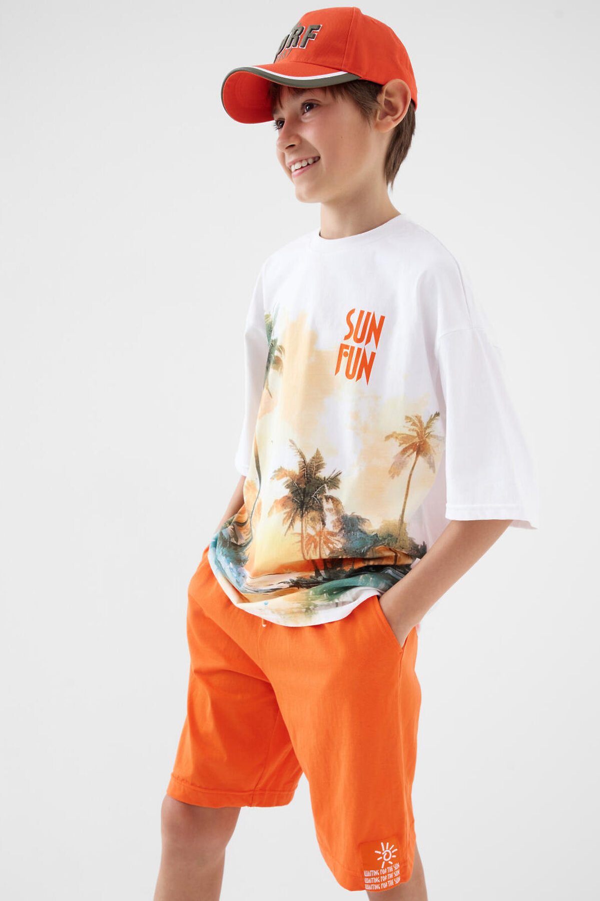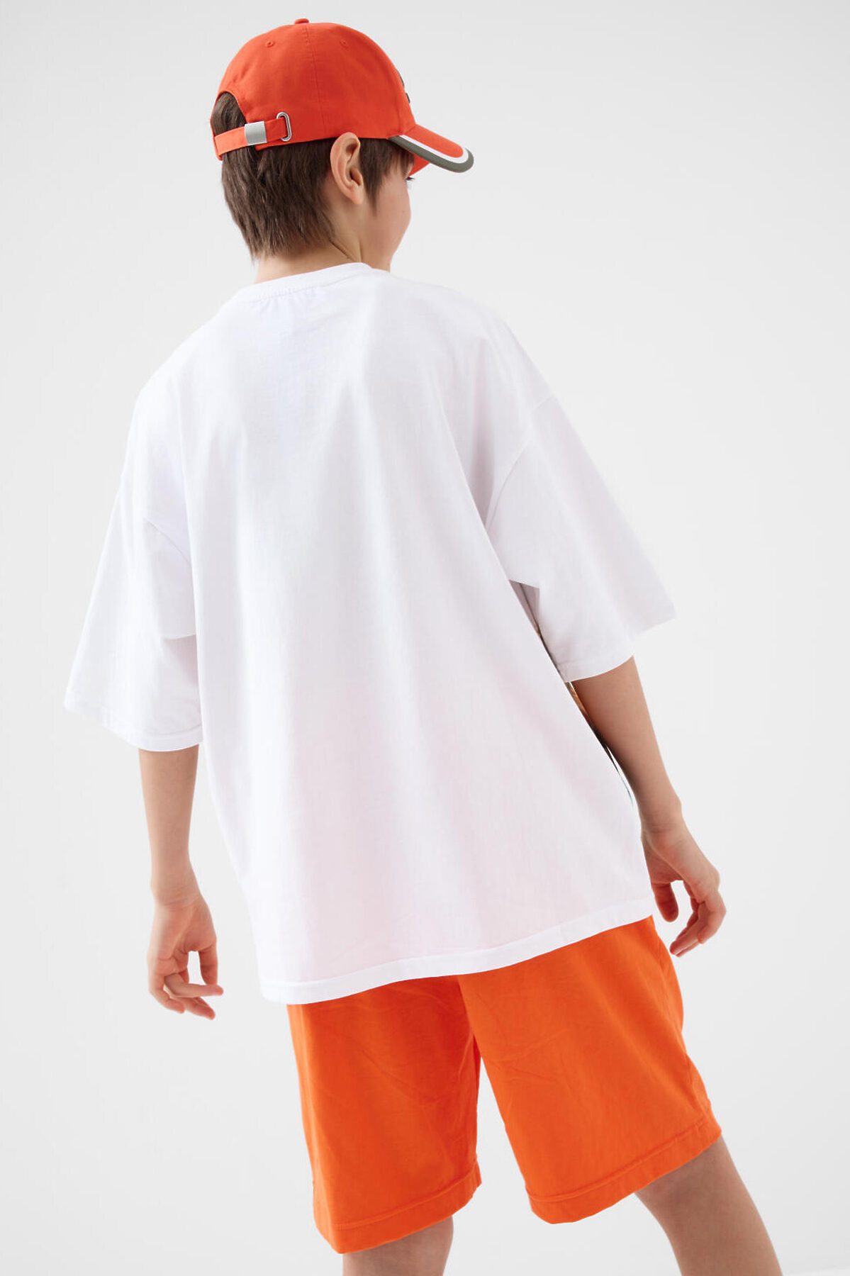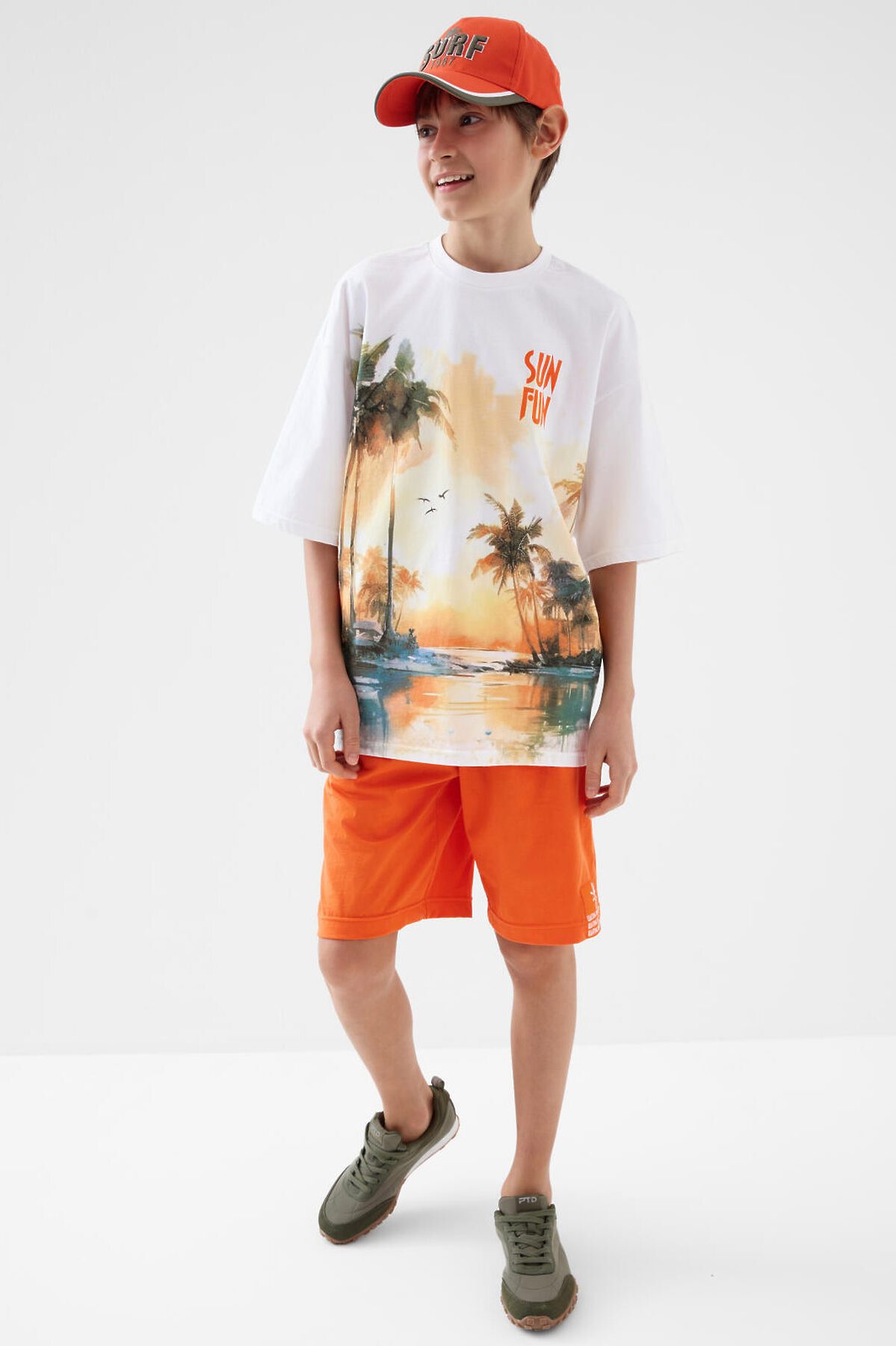 Костюм для мальчика подростка. Состоит из футболки и шорт. Выполнен из хлопкового трикотажа. Футболка оверсайз, с коротким рукавом и ярким принтом. Шорты свободные, с эластичным поясом и шнурком для регулировки посадки. По бокам расположены карманы. Декоративная нашивка.