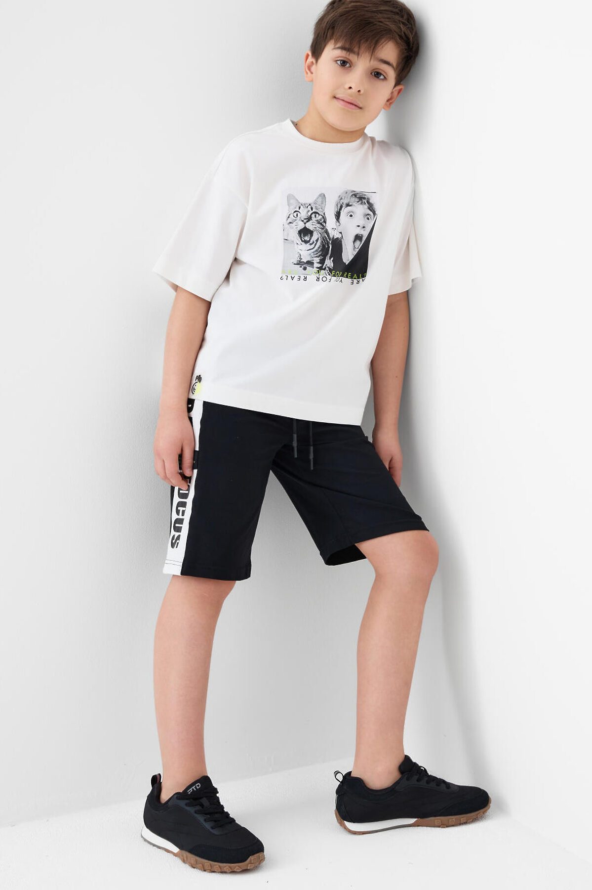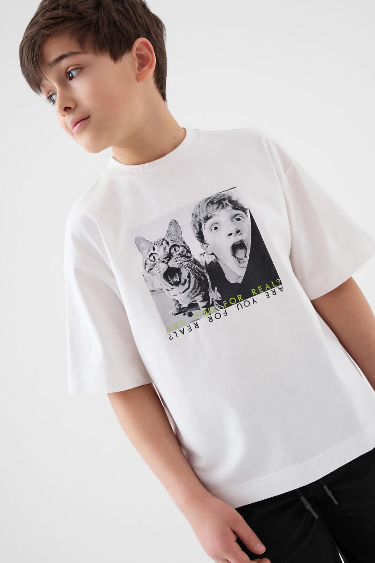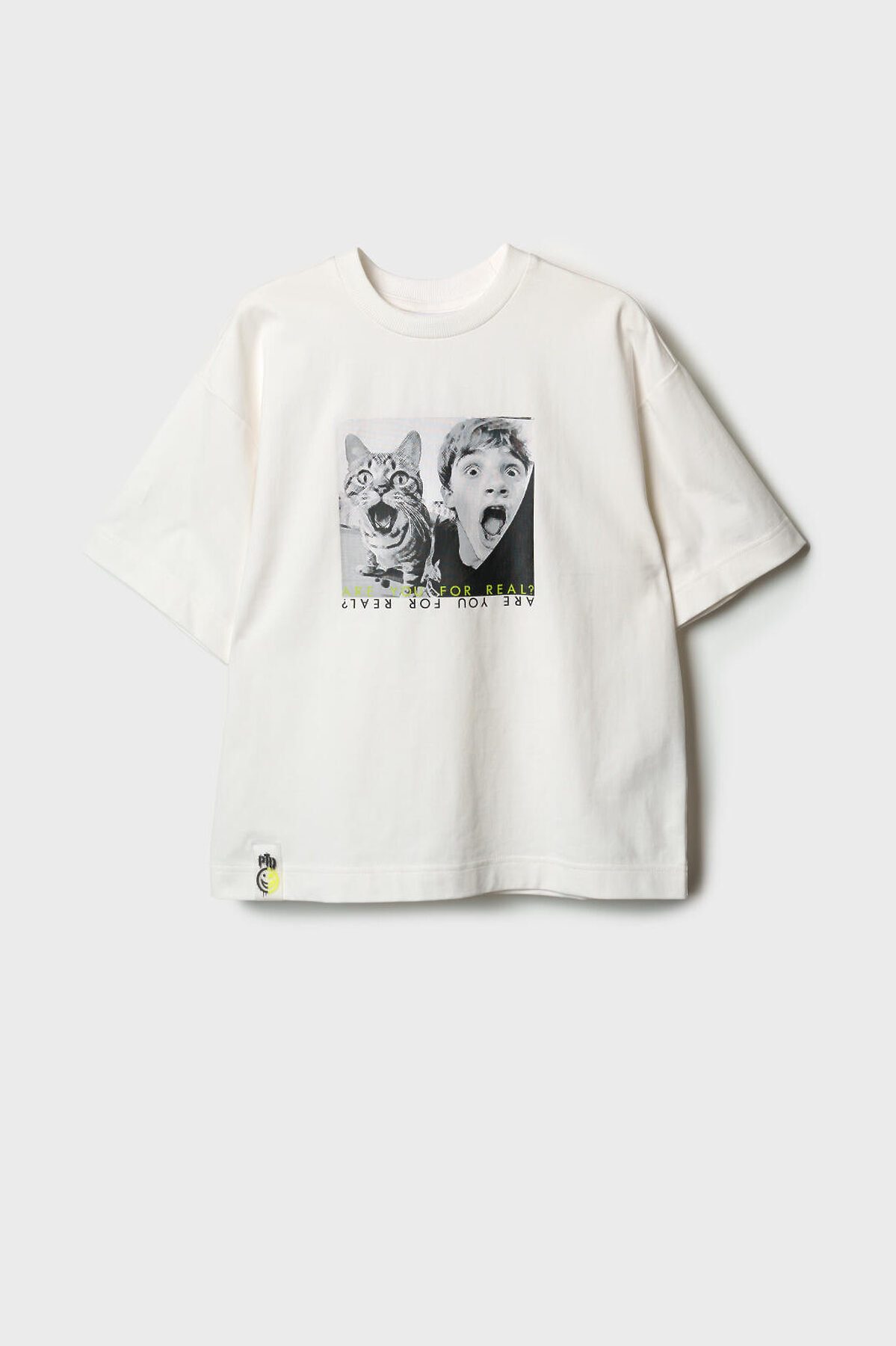 Футболка оверсайз для мальчика подростка. Модель выполнена из эластичного хлопкового трикотажа джерси. На груди расположен крупный принт с изображением мальчика и кота. Горловина круглая, обработана эластичным рибом. В нижней части — небольшая силиконовая нашивка.