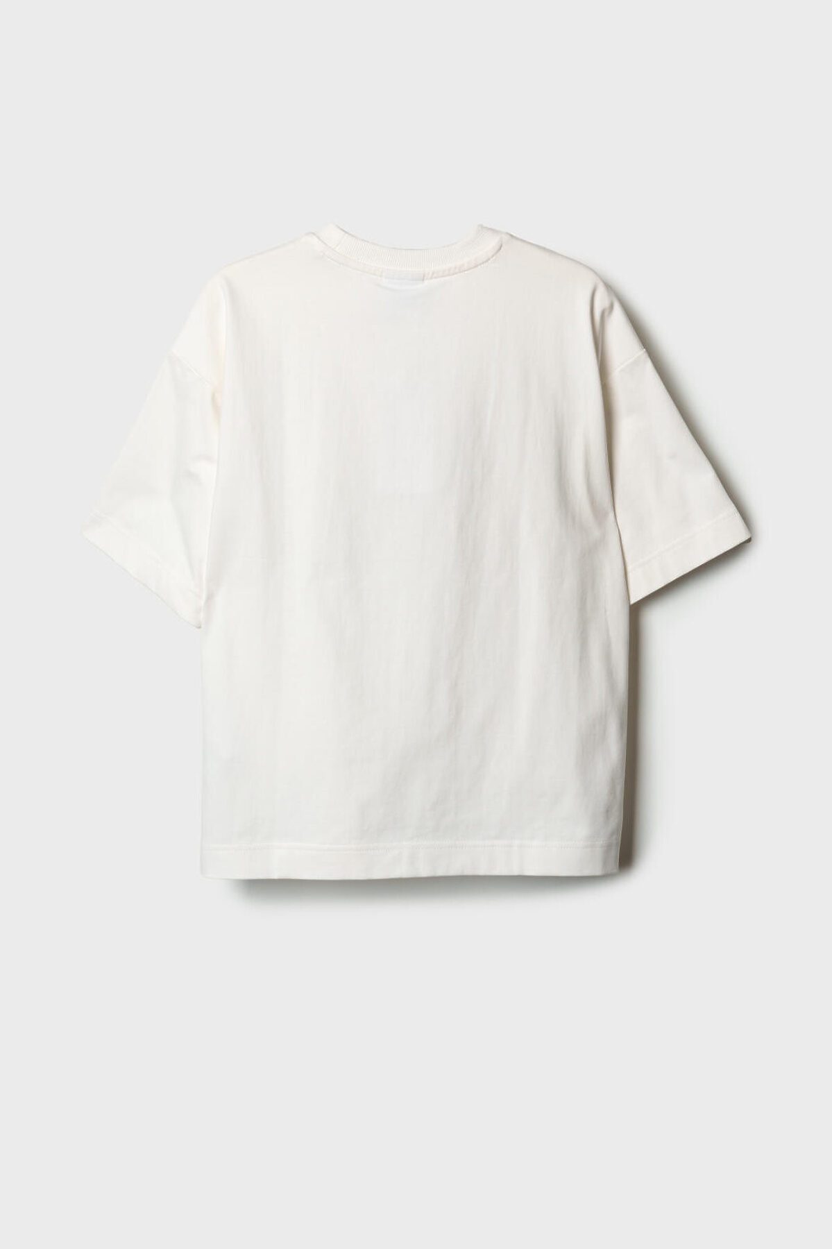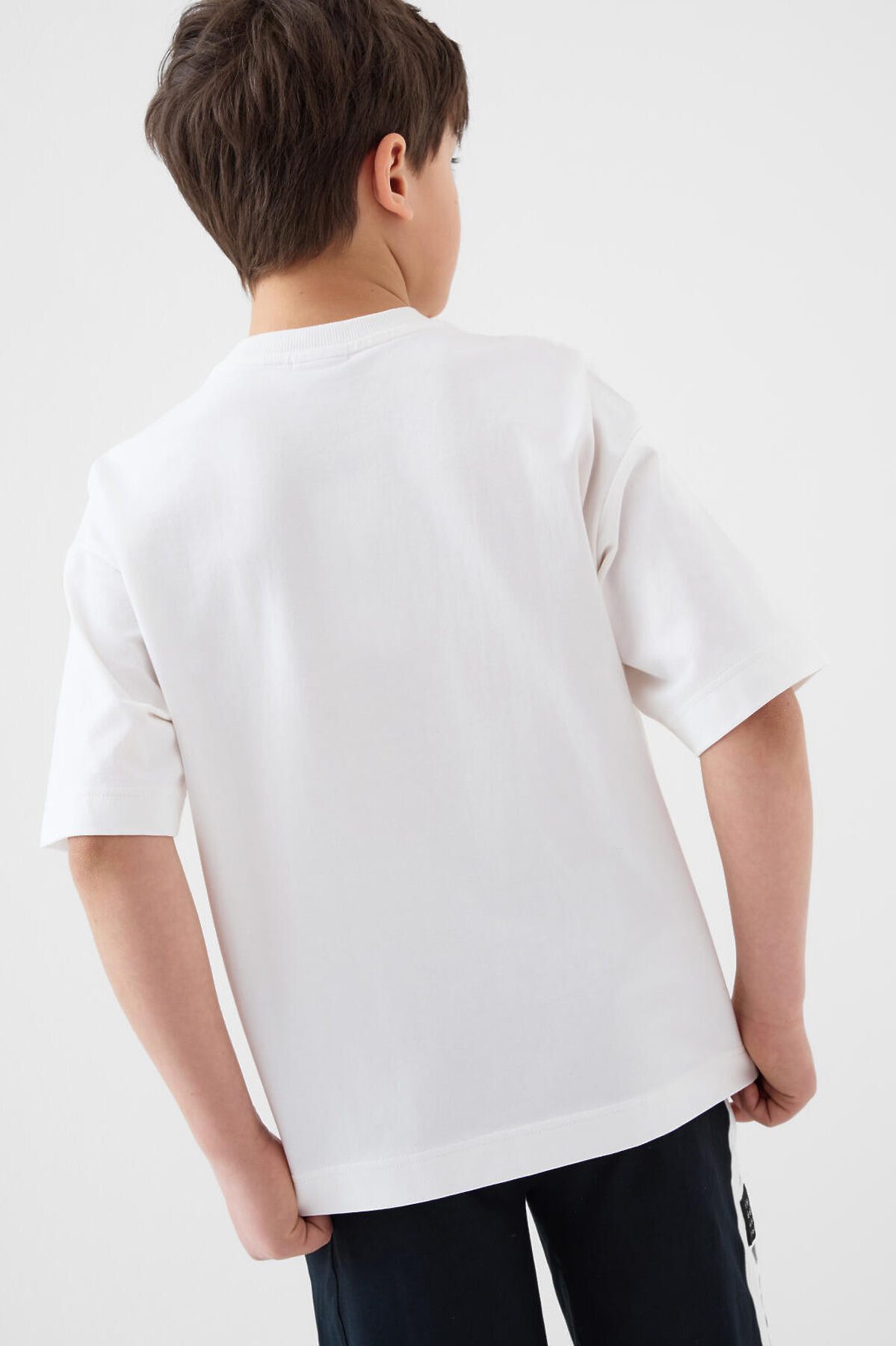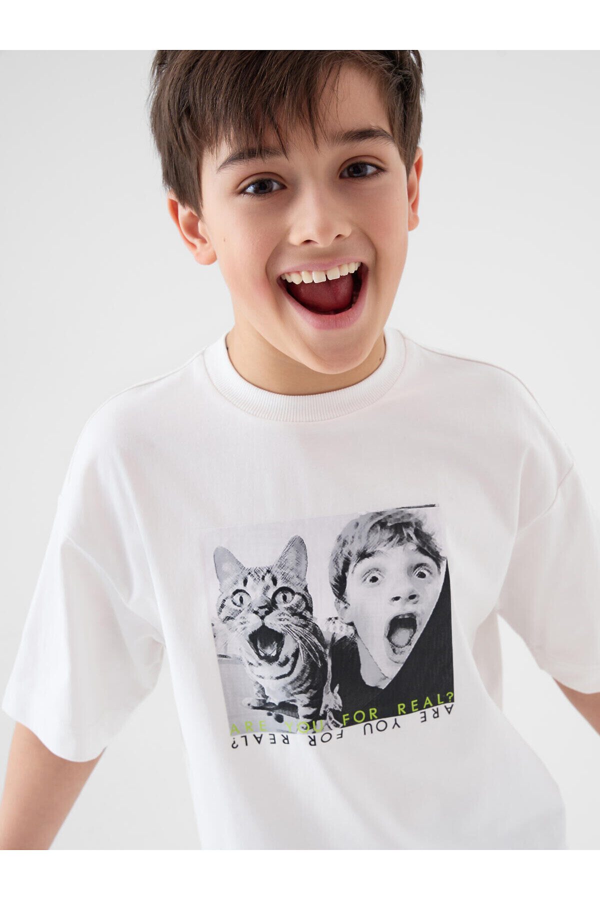 Футболка оверсайз для мальчика подростка. Модель выполнена из эластичного хлопкового трикотажа джерси. На груди расположен крупный принт с изображением мальчика и кота. Горловина круглая, обработана эластичным рибом. В нижней части — небольшая силиконовая нашивка.